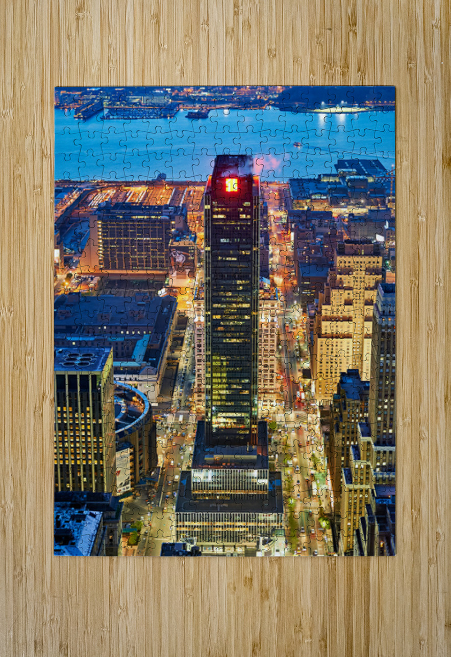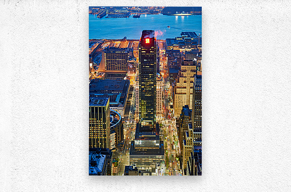 Manhattan at dusk displaying lights of buildings and streets while the river glimmers under the evening sky.