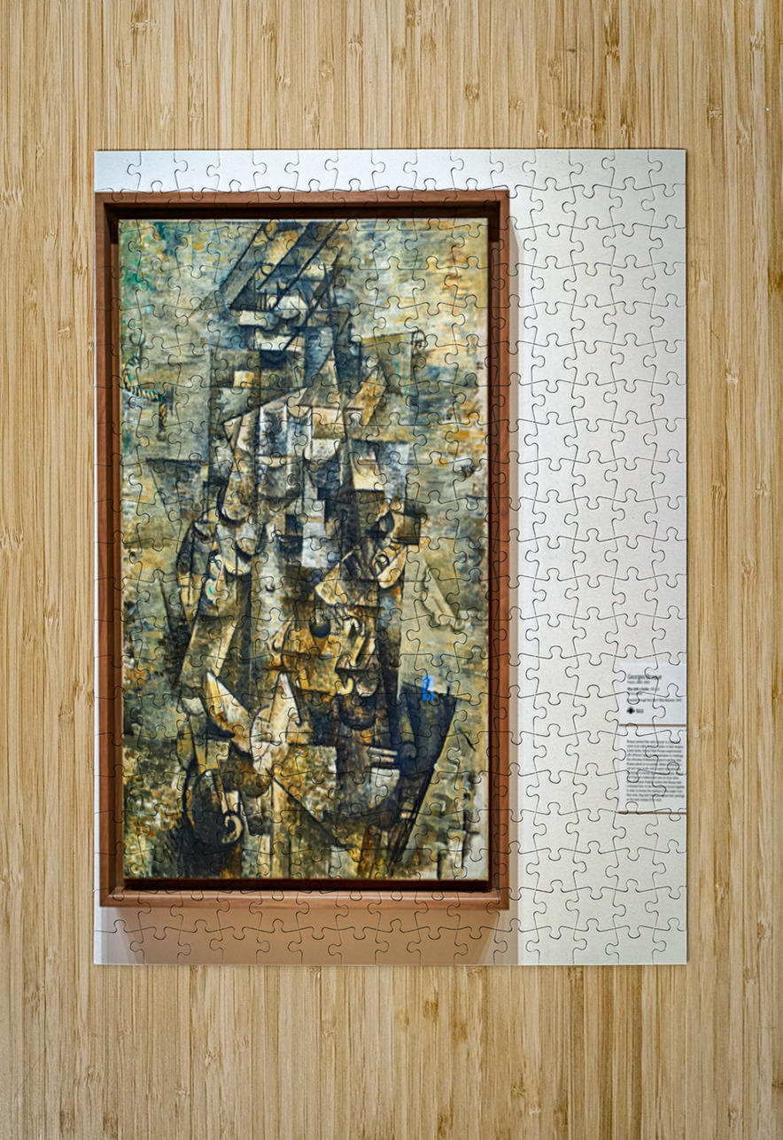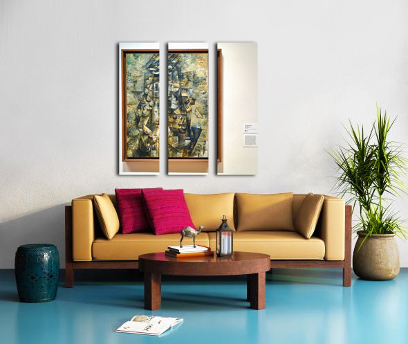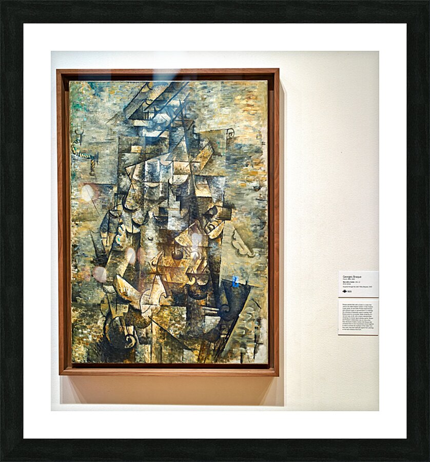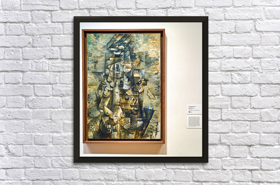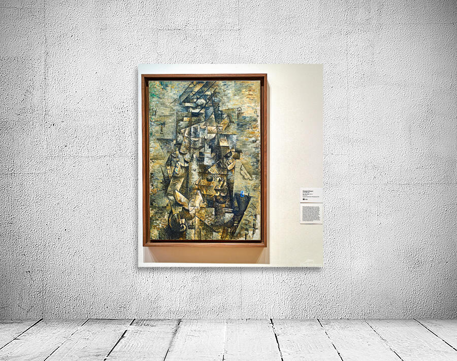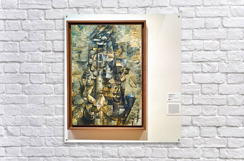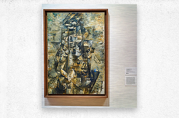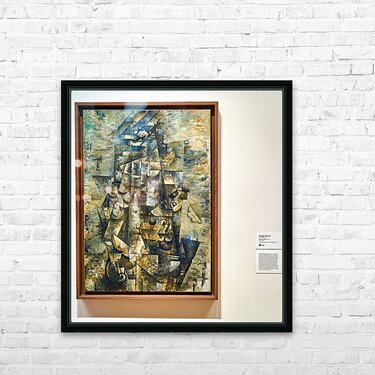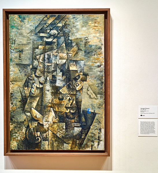 Georges Braques artwork shows a man with a guitar displayed at the Museum of Modern Art in Manhattan New York showing cubist influences.