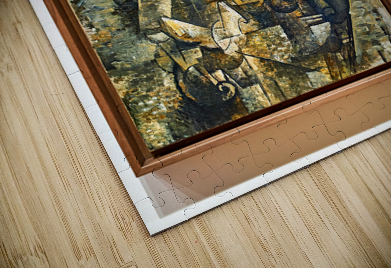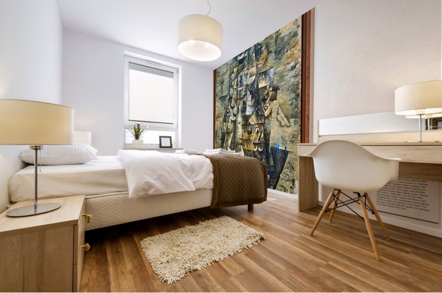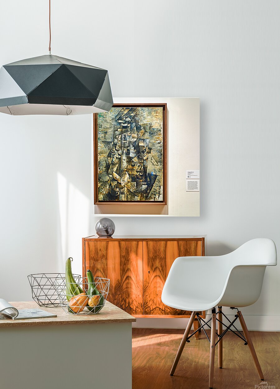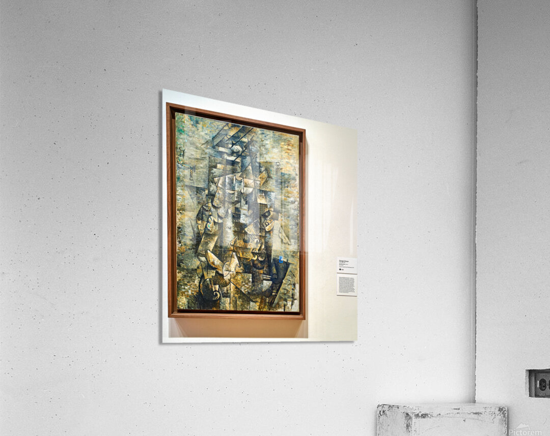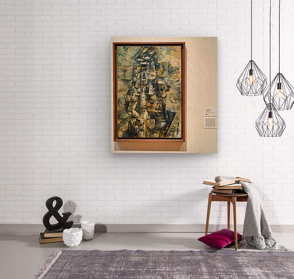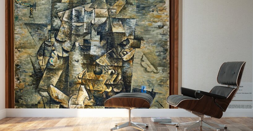 Georges Braques artwork shows a man with a guitar displayed at the Museum of Modern Art in Manhattan New York showing cubist influences.