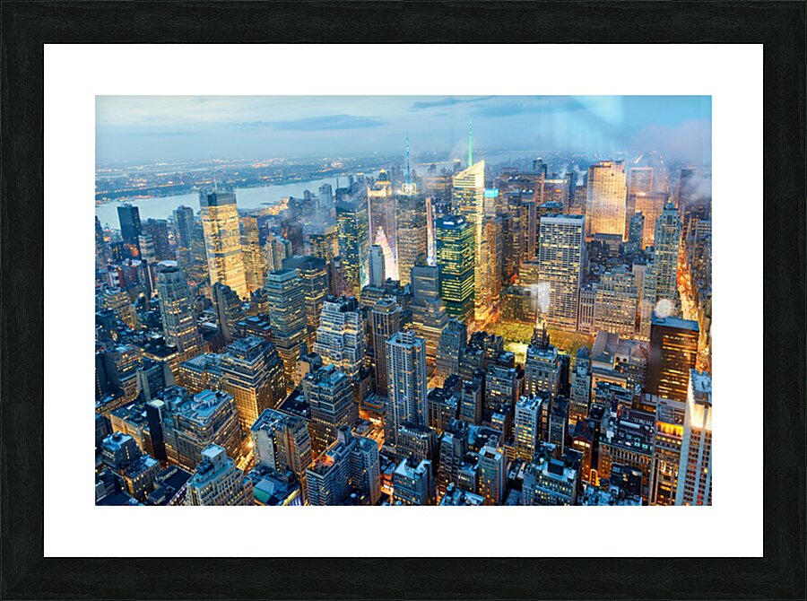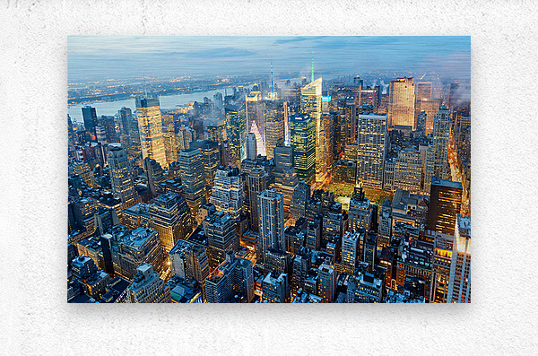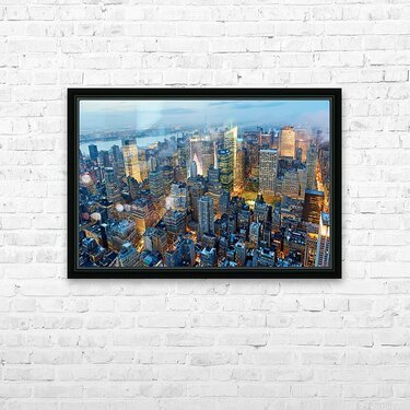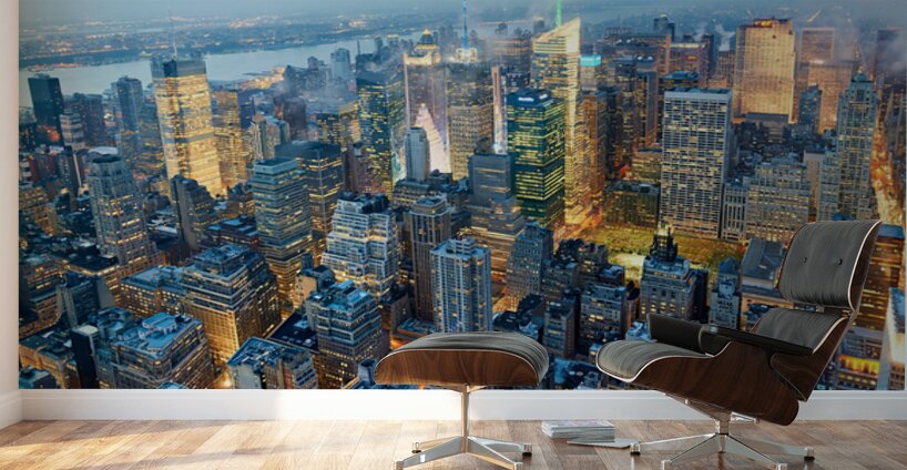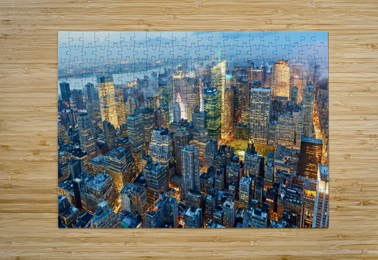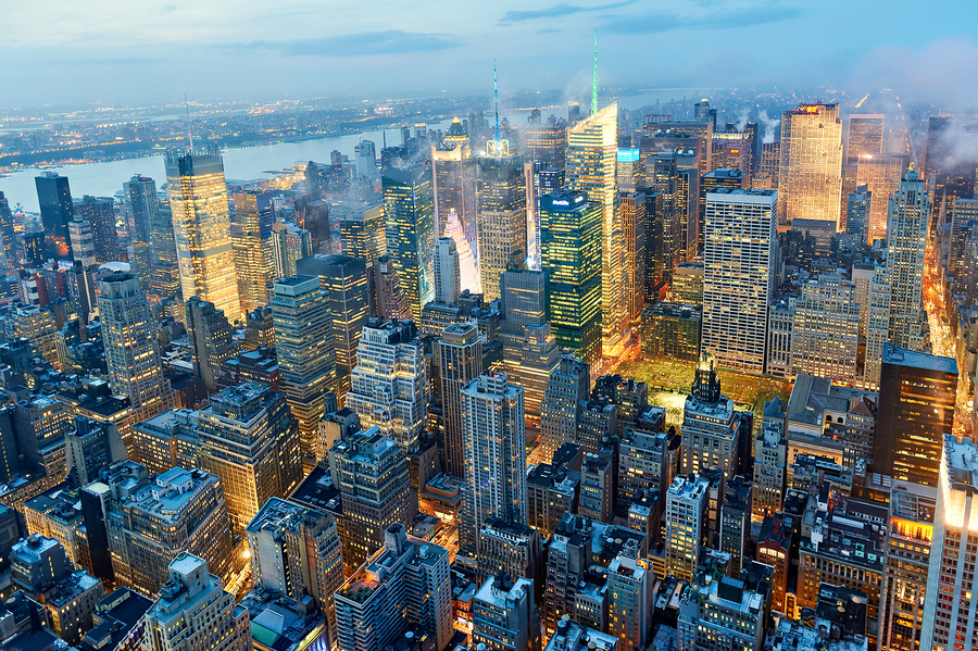 The scene shows Manhattan from above during dusk with many buildings lit up. The skyline features notable structures standing tall.