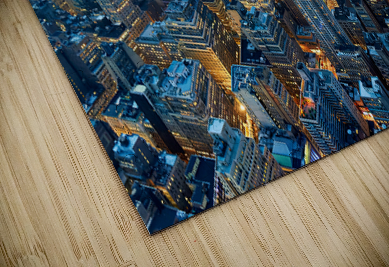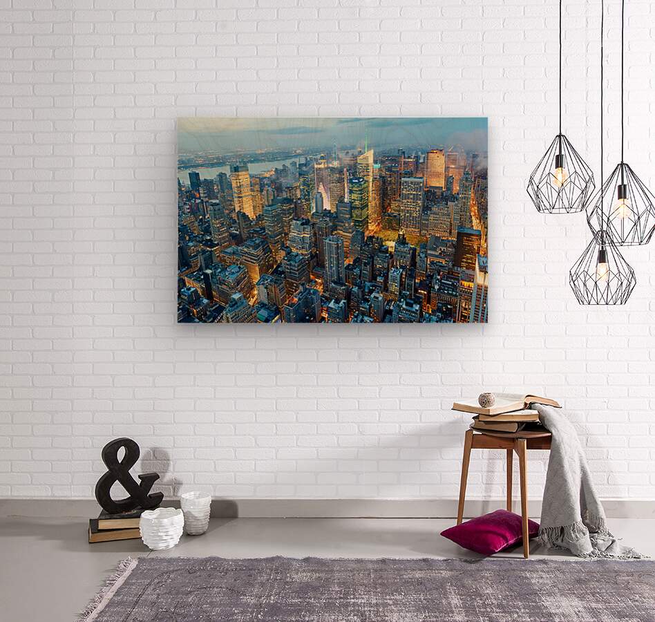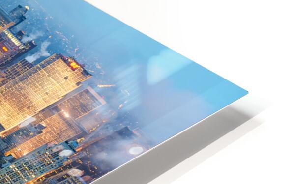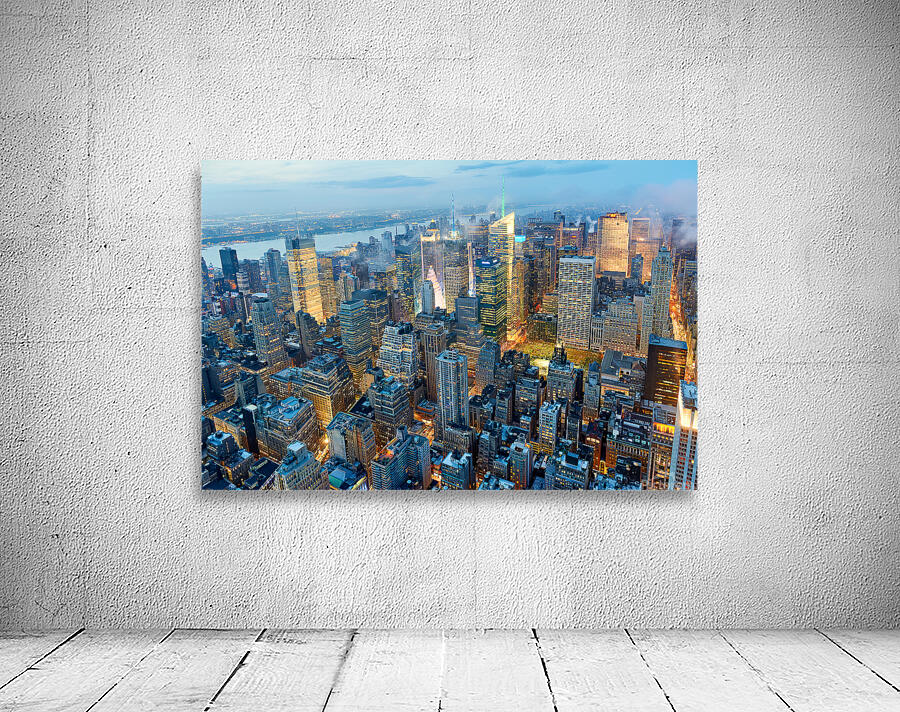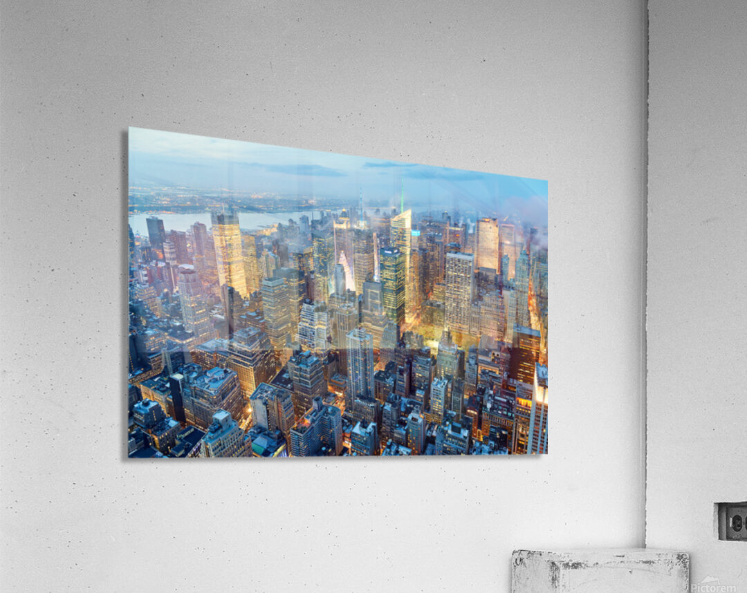 The scene shows Manhattan from above during dusk with many buildings lit up. The skyline features notable structures standing tall.