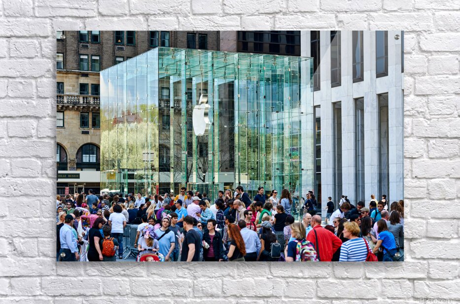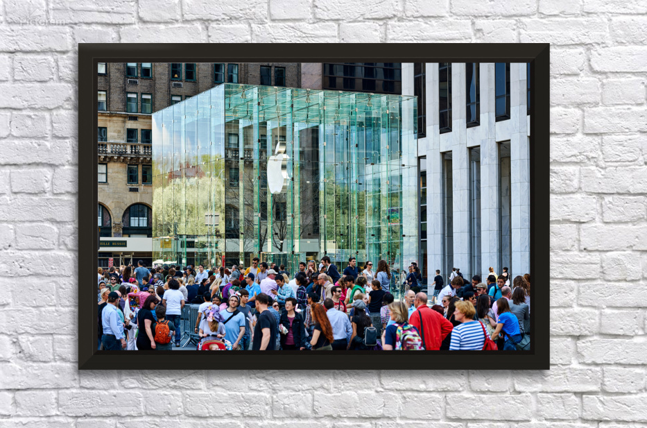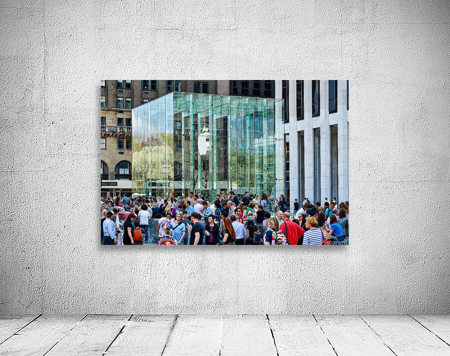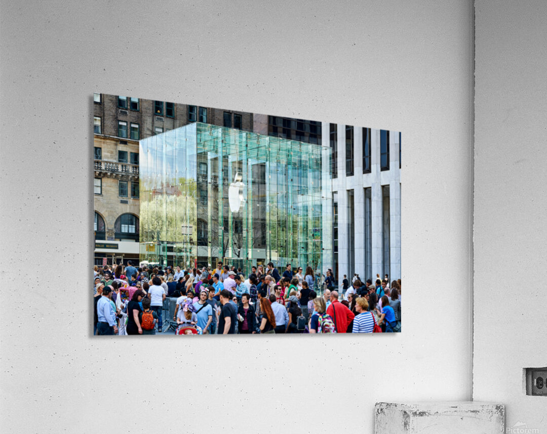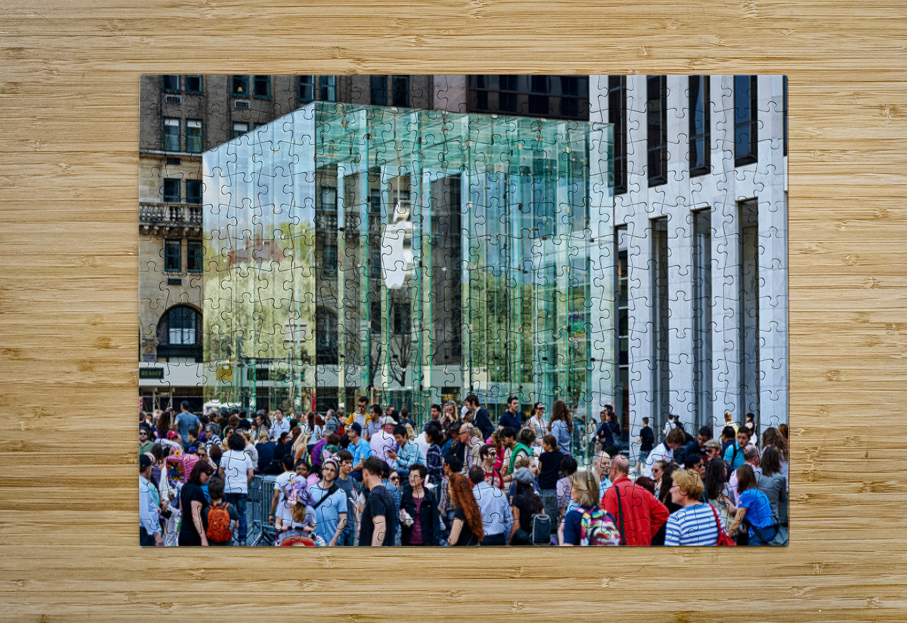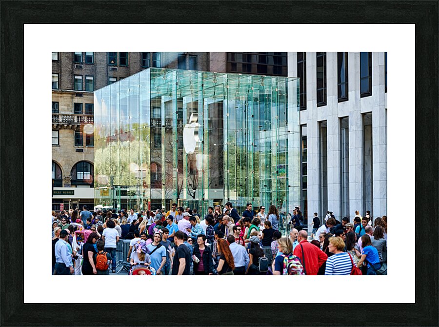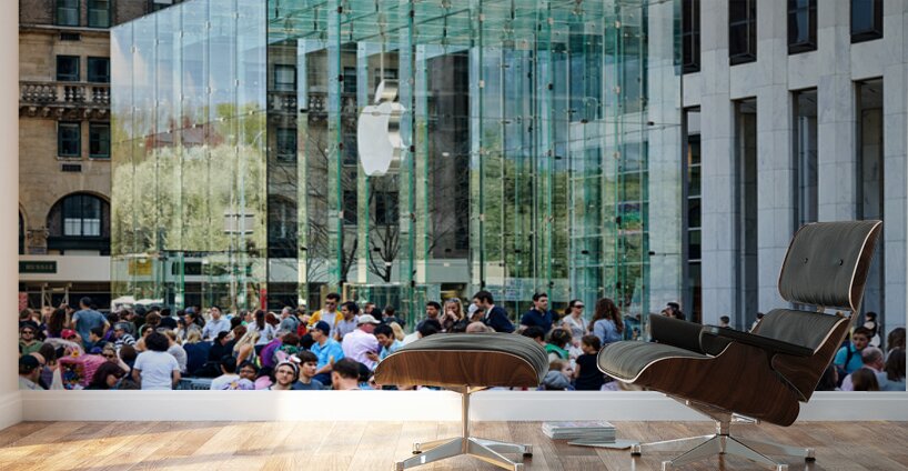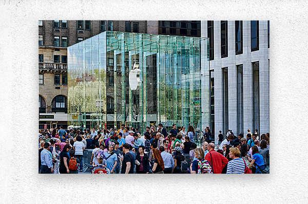 Many people visit the Apple Store at 5th Avenue in Manhattan. The store entrance is made of glass. It is busy with shoppers and tourists.