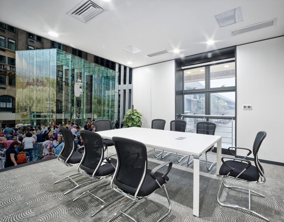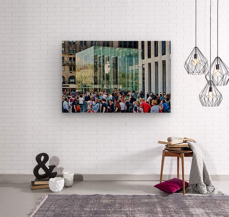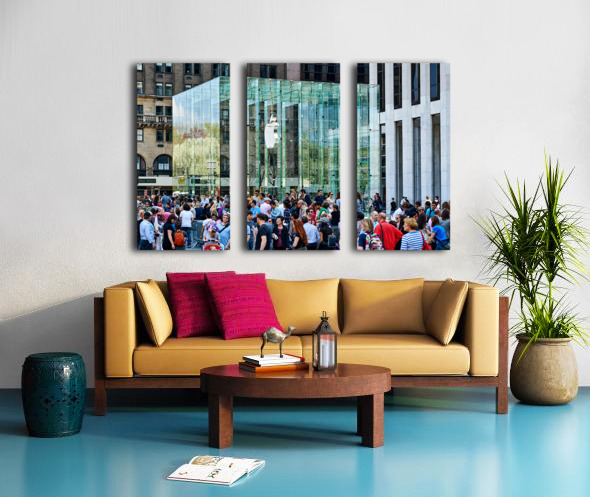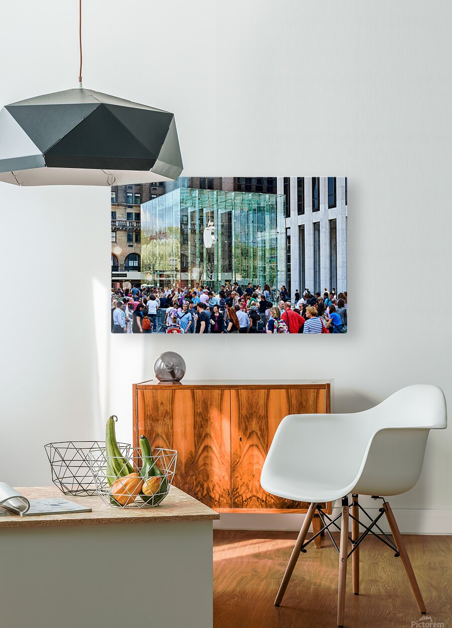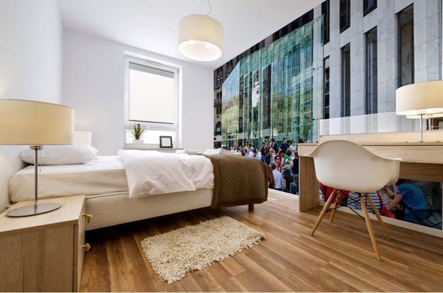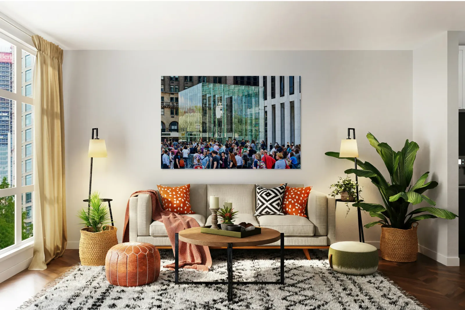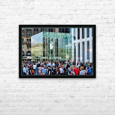 Many people visit the Apple Store at 5th Avenue in Manhattan. The store entrance is made of glass. It is busy with shoppers and tourists.