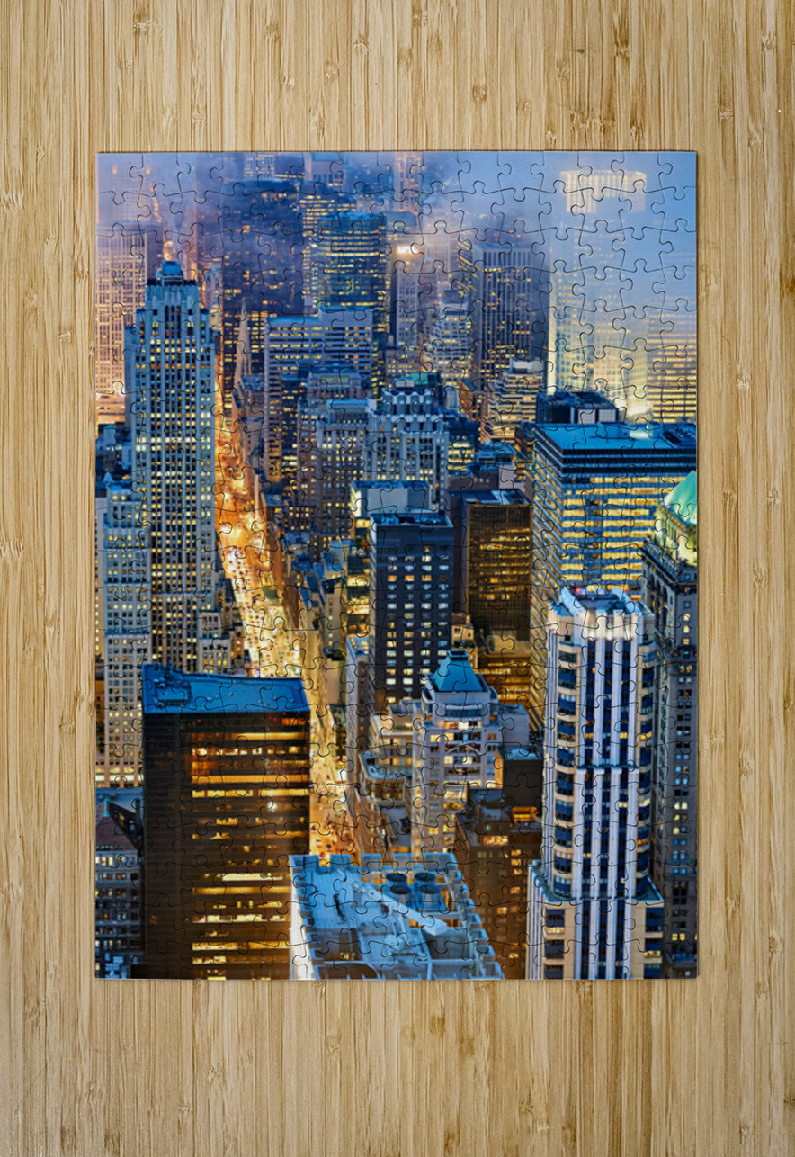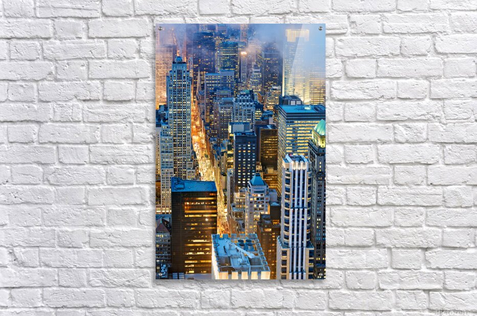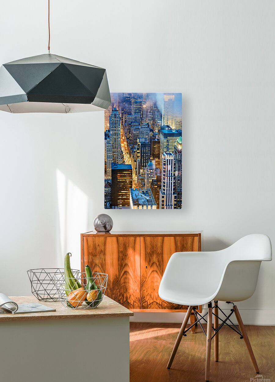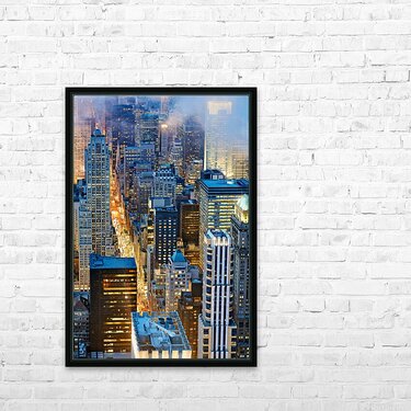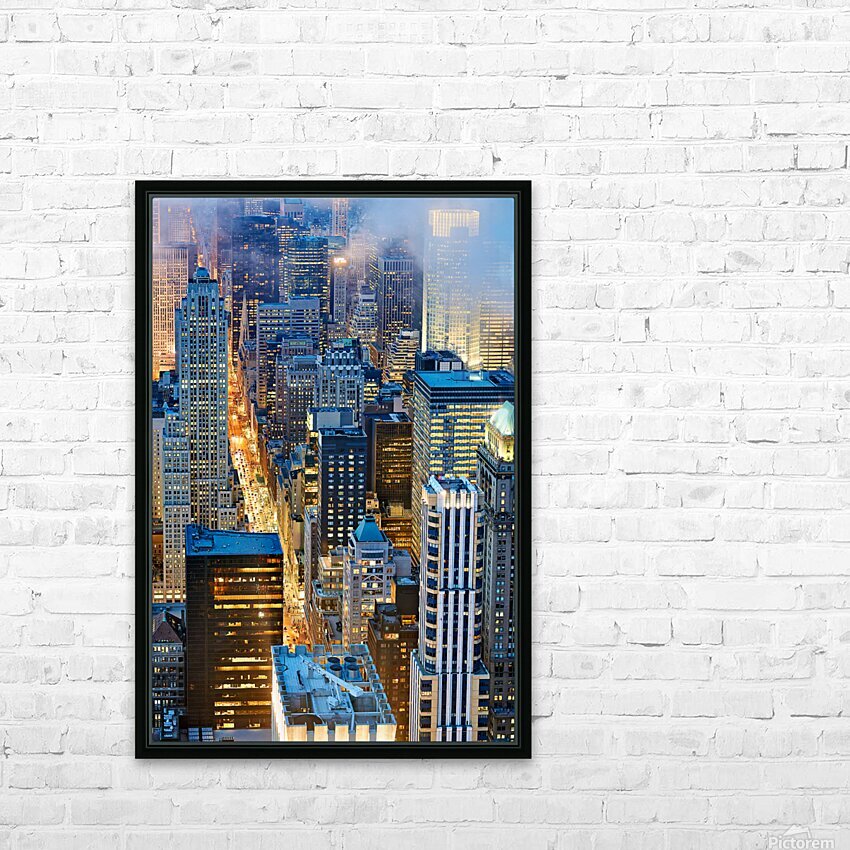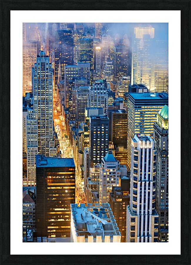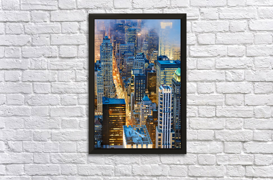 "View of Manhattan streets at dusk with city lights shining brigh" in a framed print.