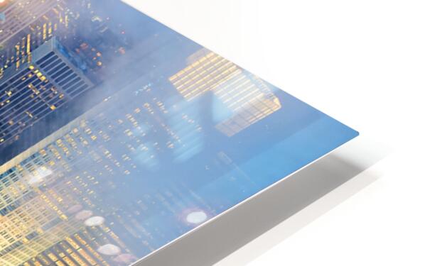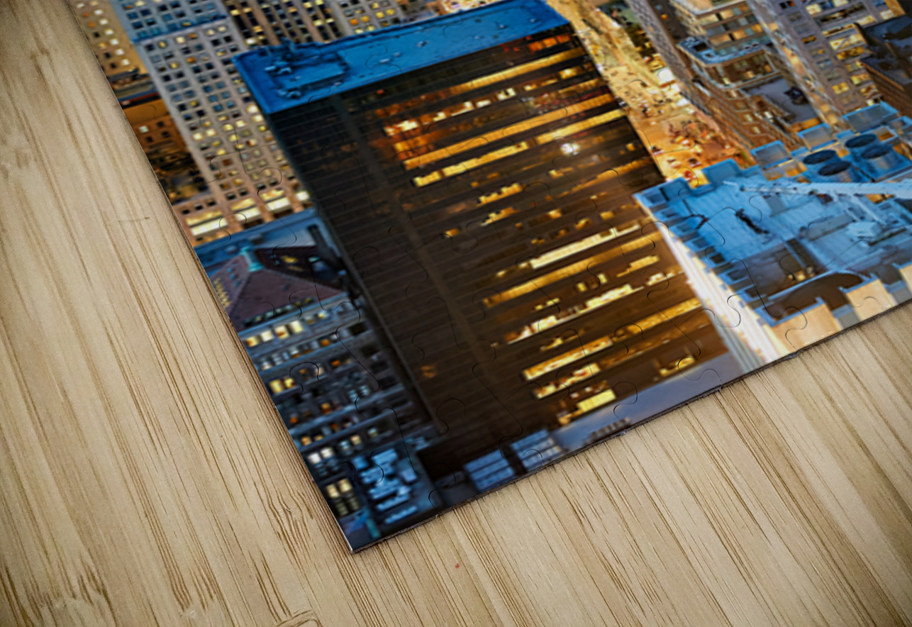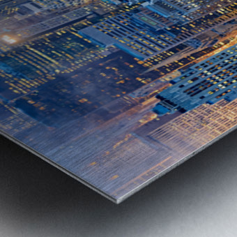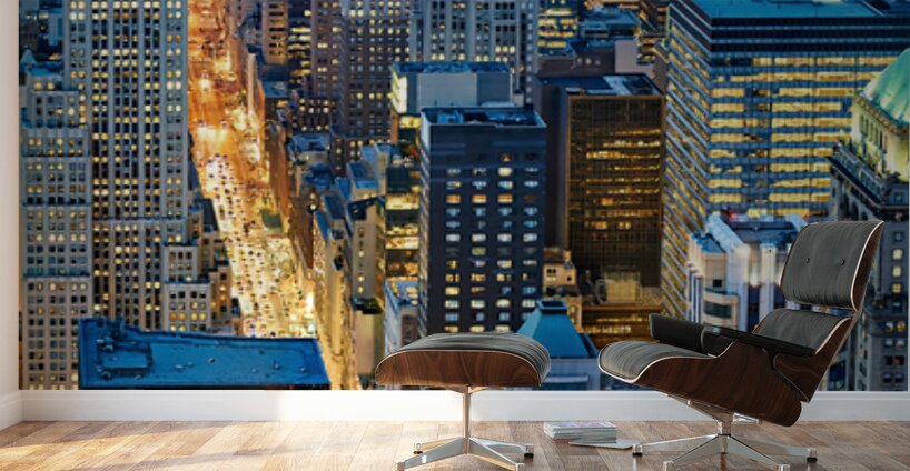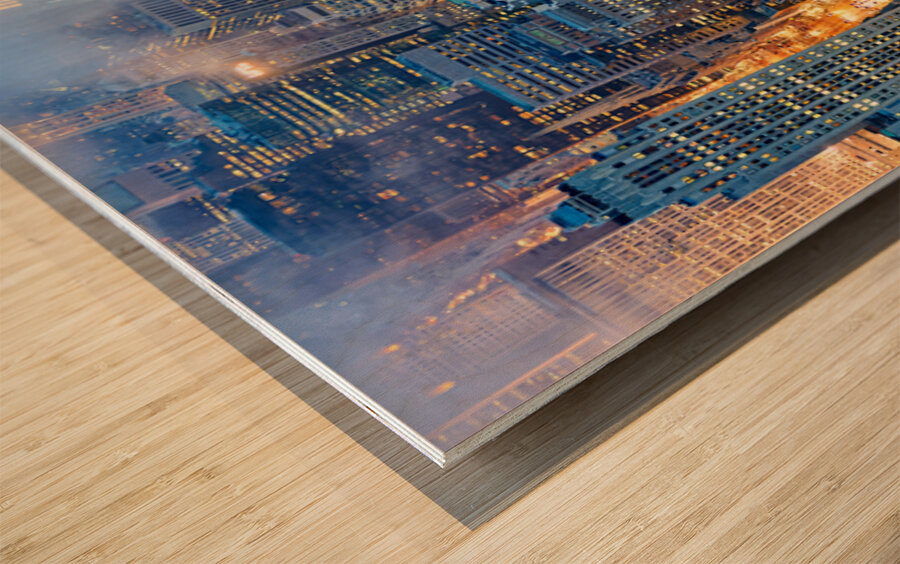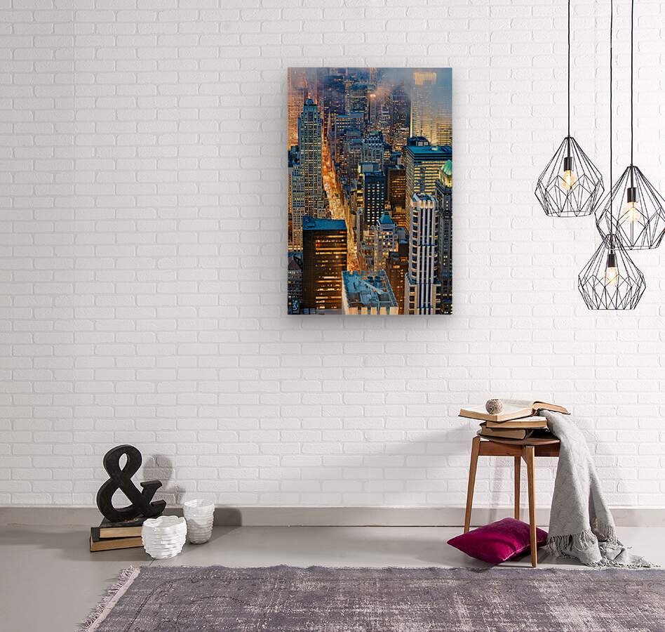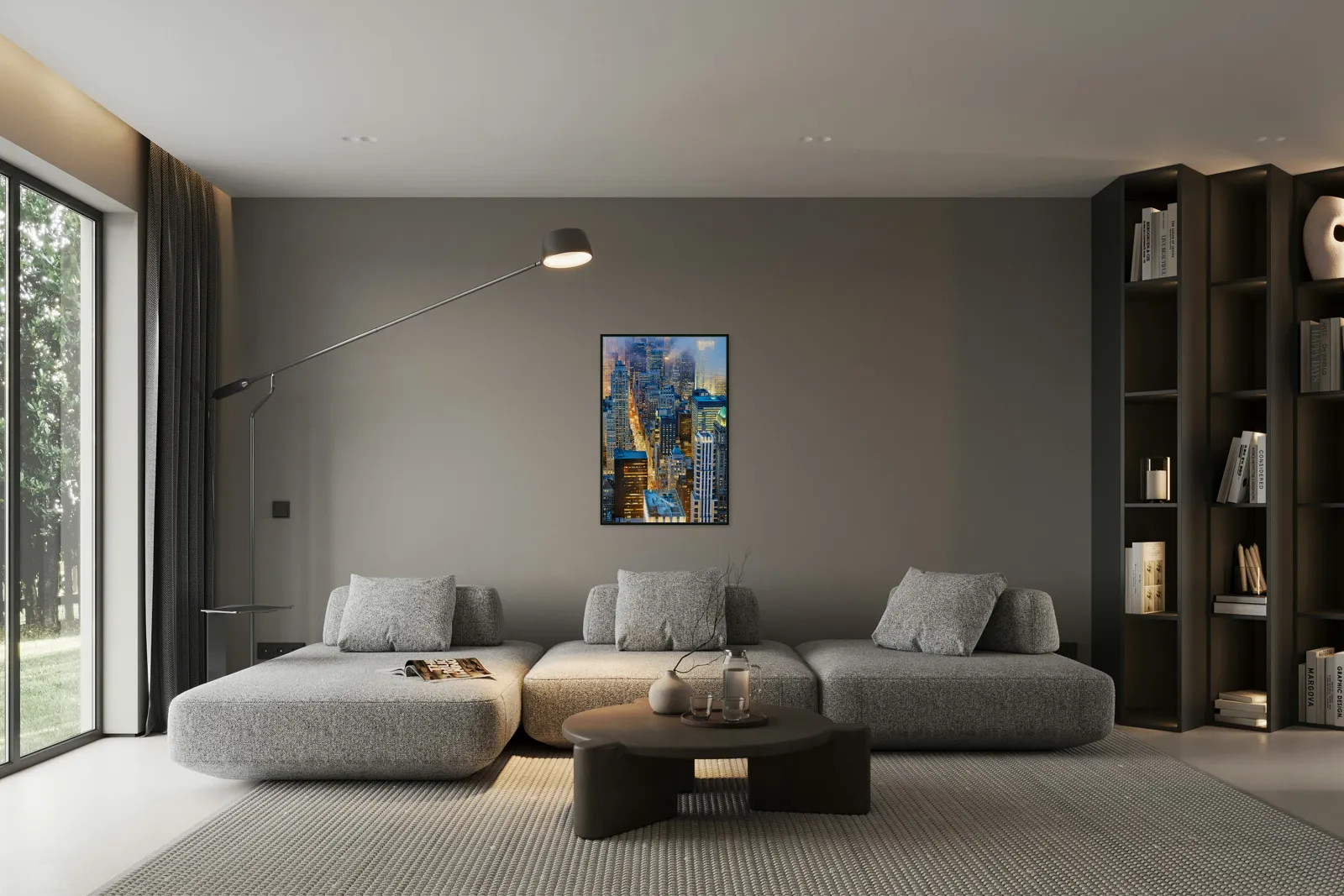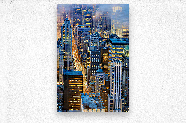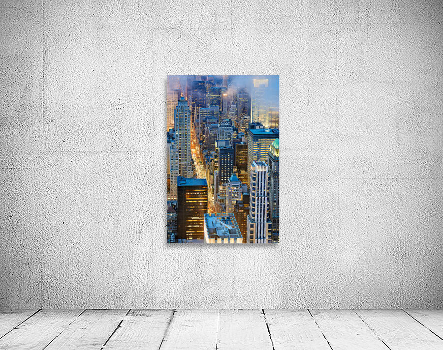 "View of Manhattan streets at dusk with city lights shining brigh" in a framed print.