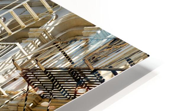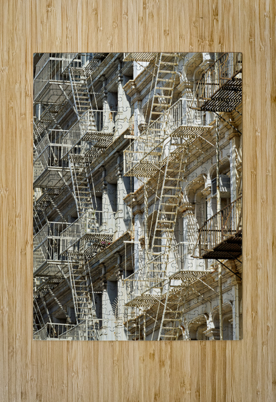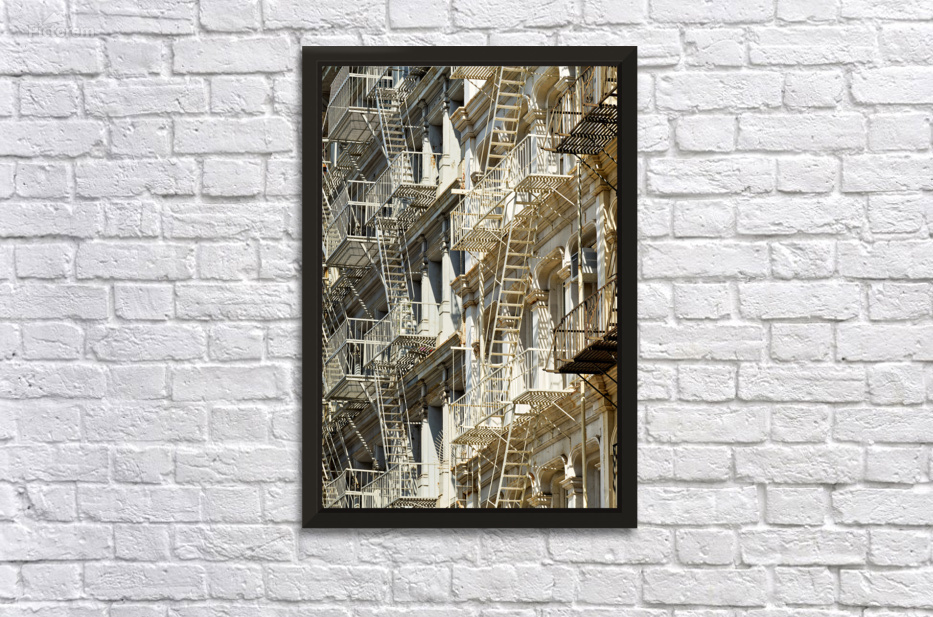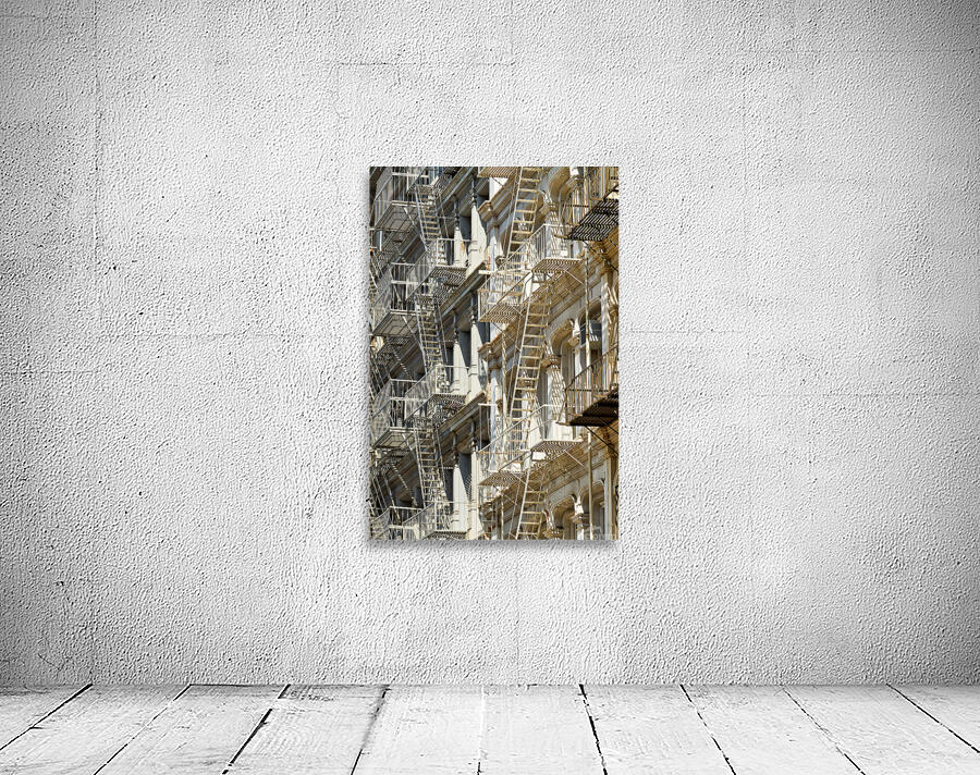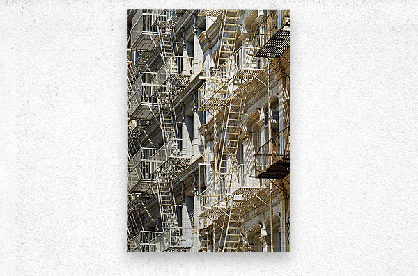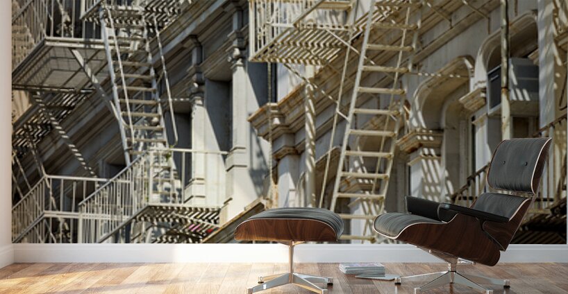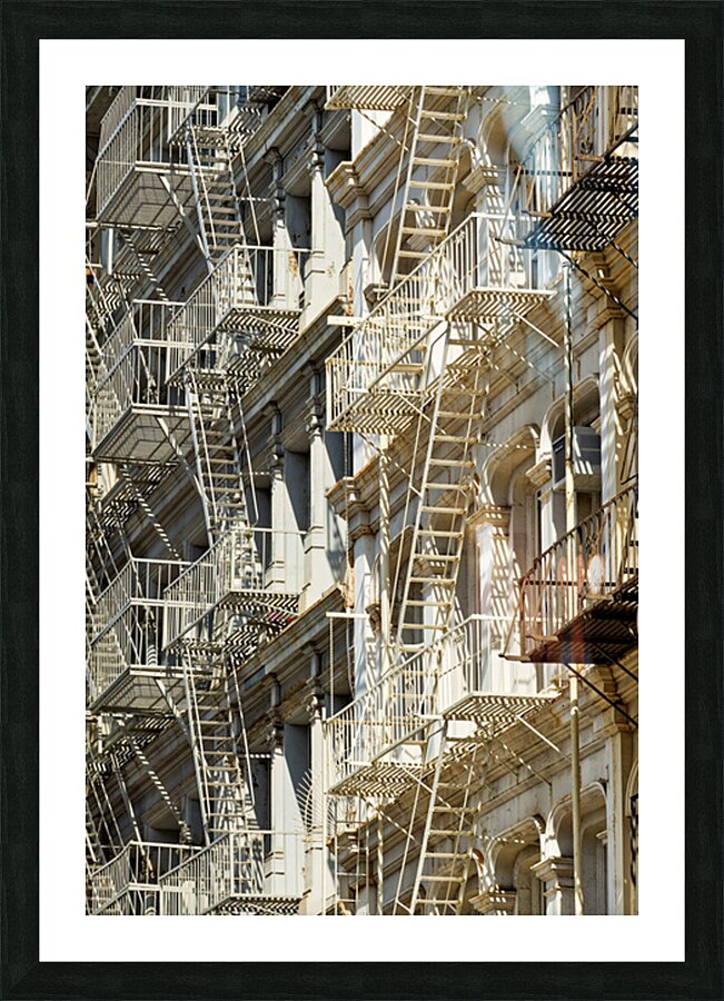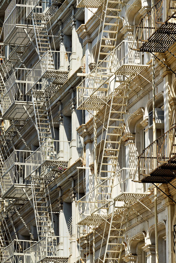 Fire escape stairs are seen on the sides of buildings in Manhattan. The steel structures provide access and safety in New York City.