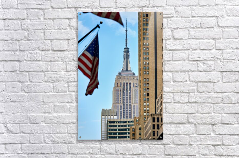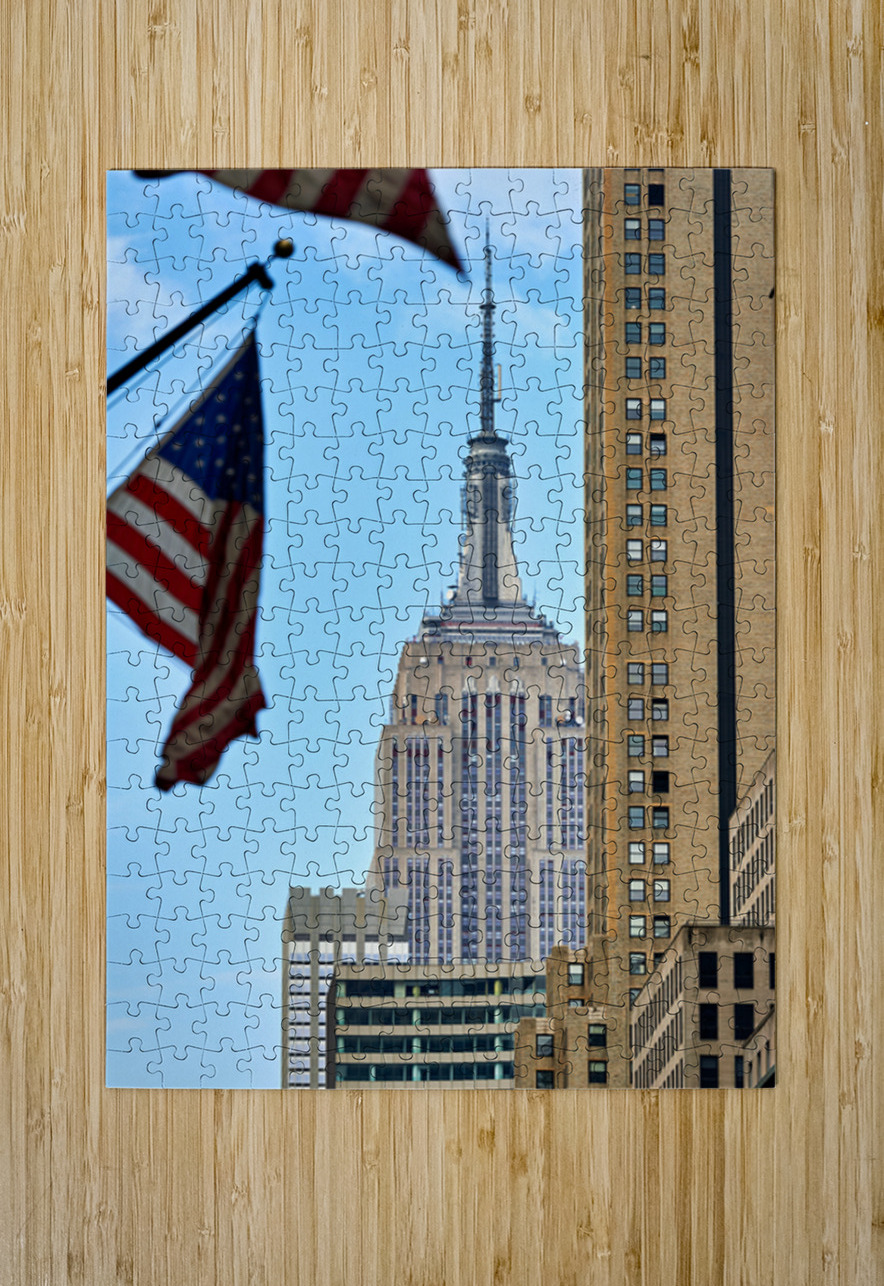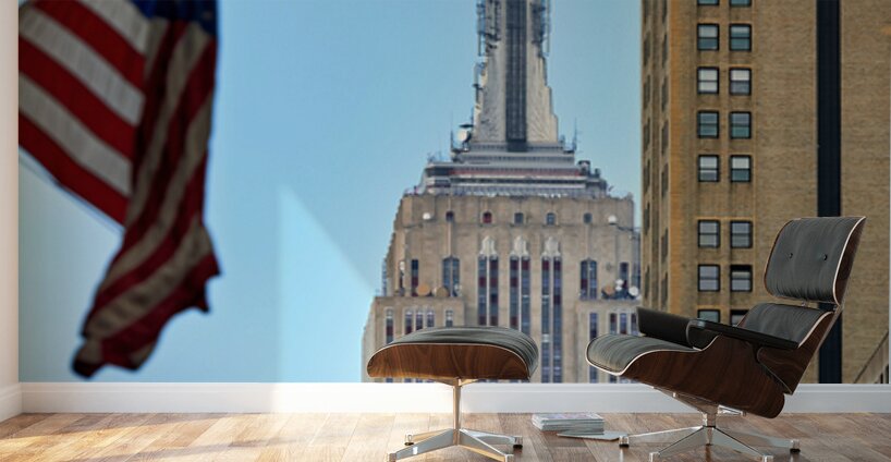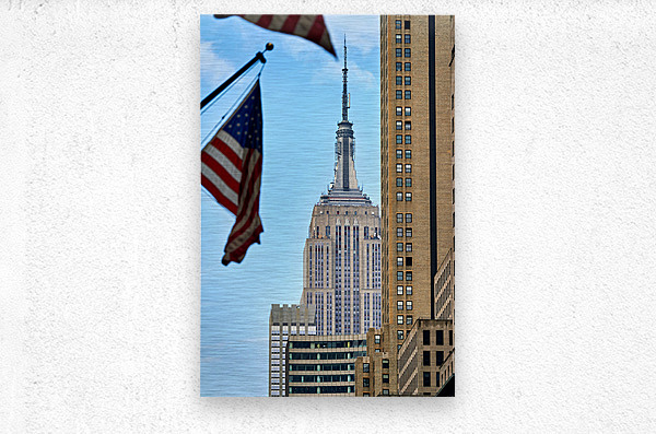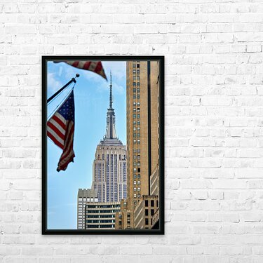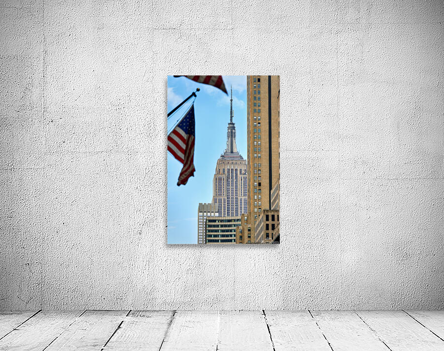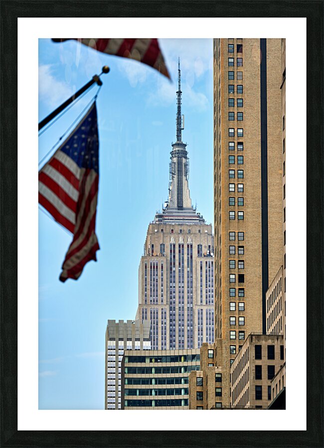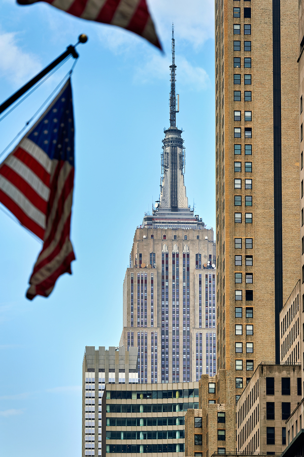 Flags wave in the wind as the Empire State Building stands tall in Manhattan New York City on a clear day.