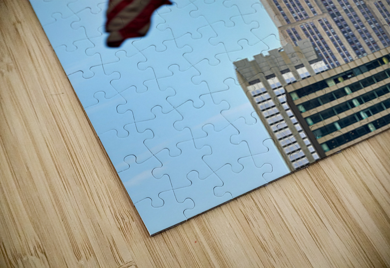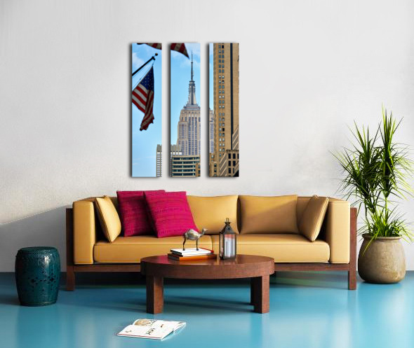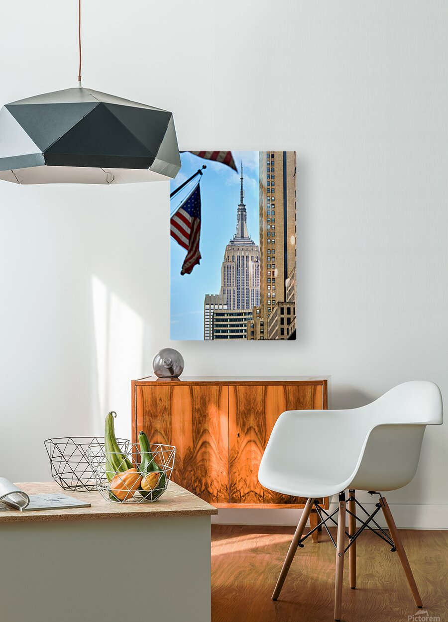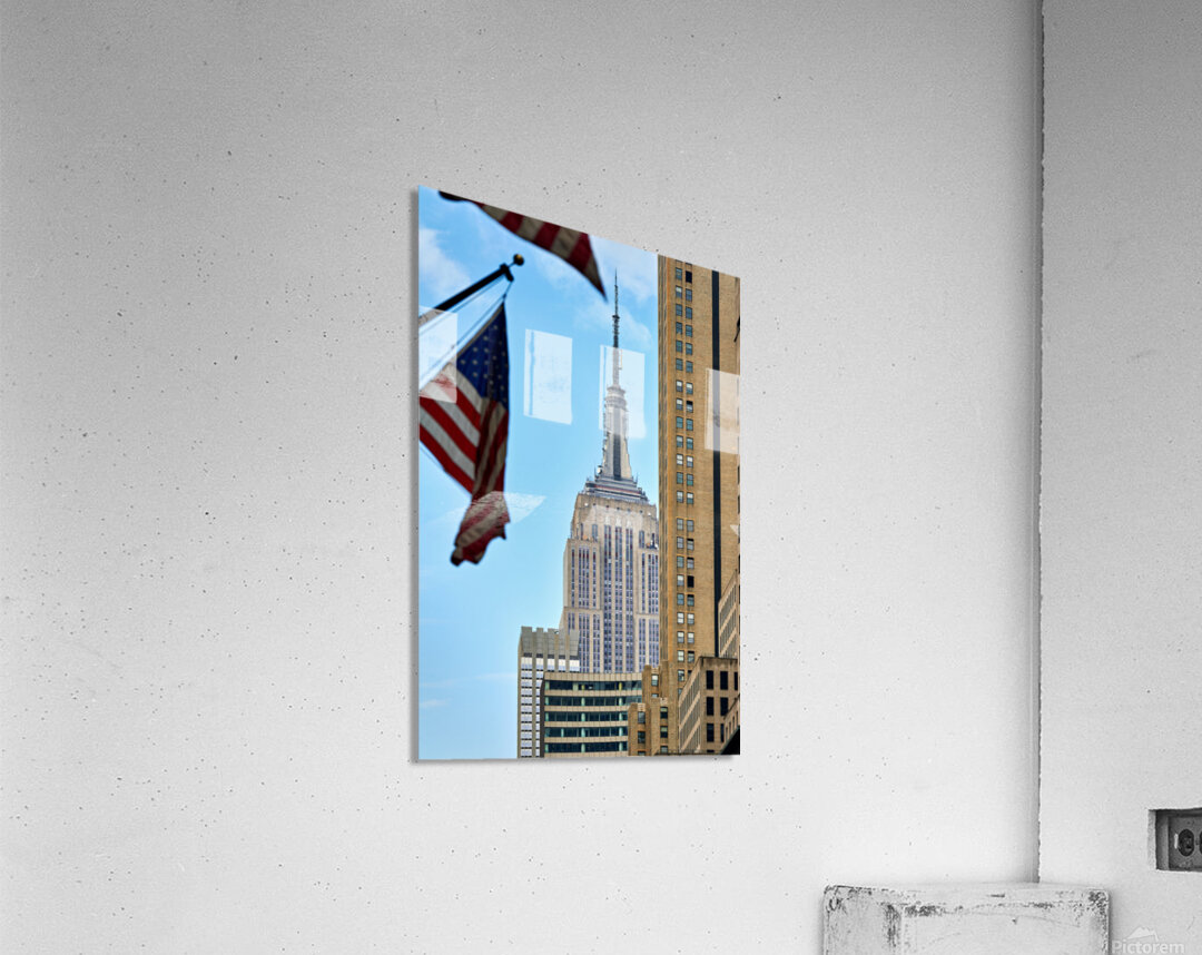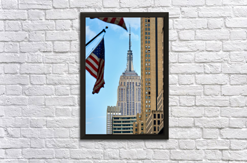 Flags wave in the wind as the Empire State Building stands tall in Manhattan New York City on a clear day.
