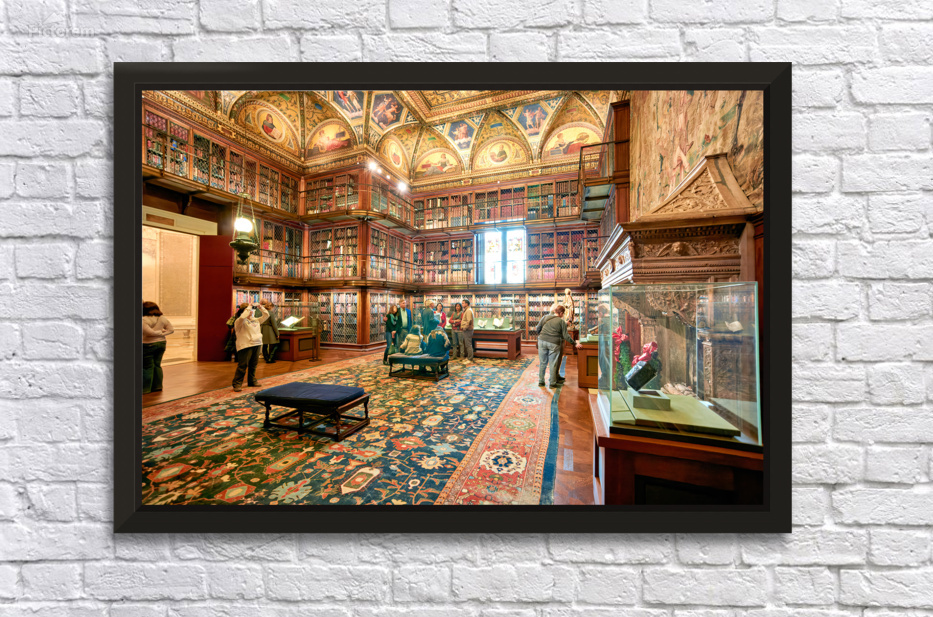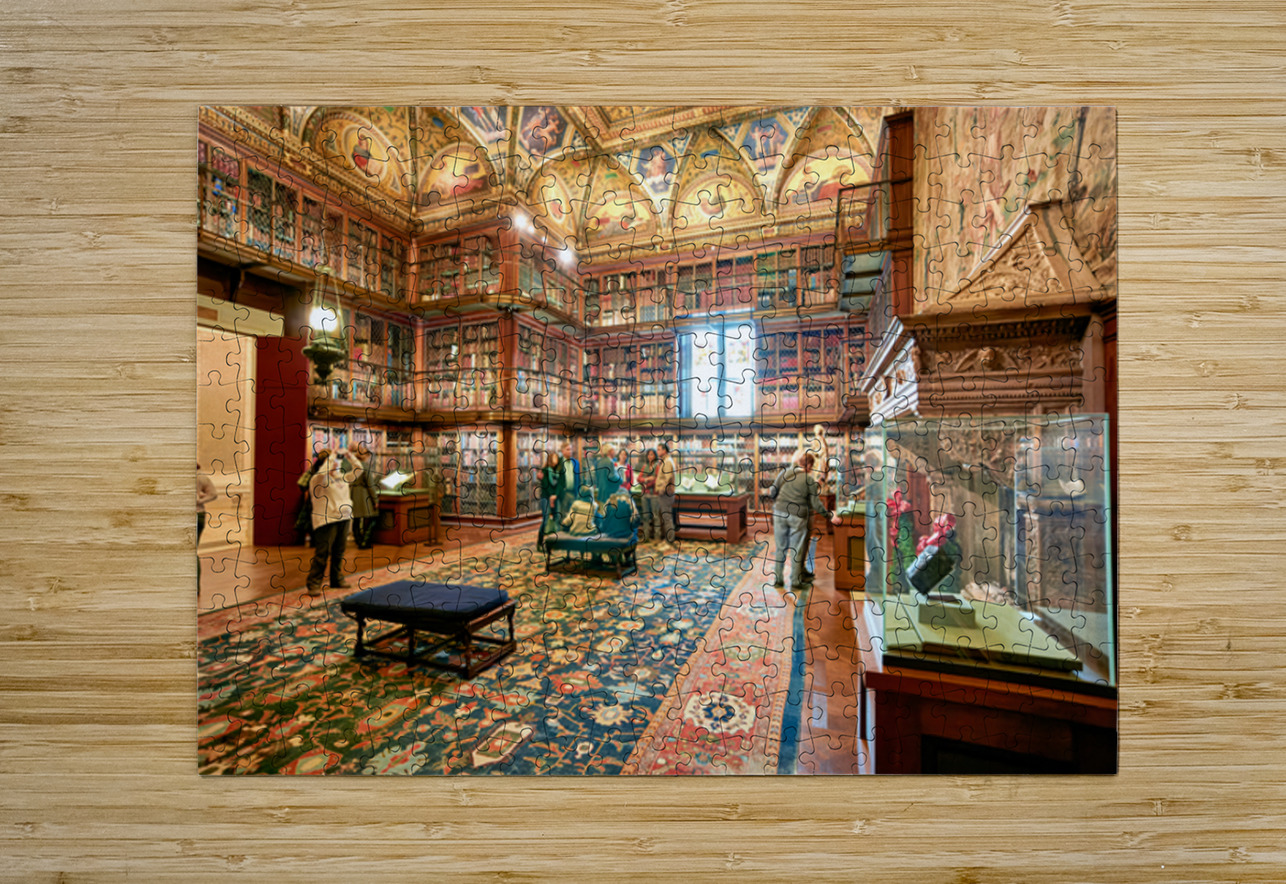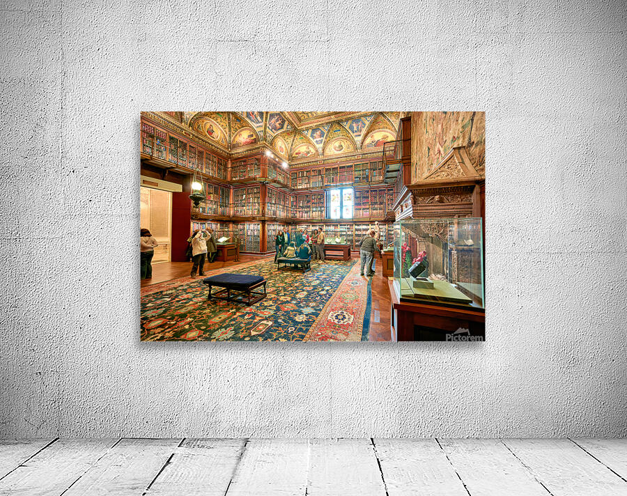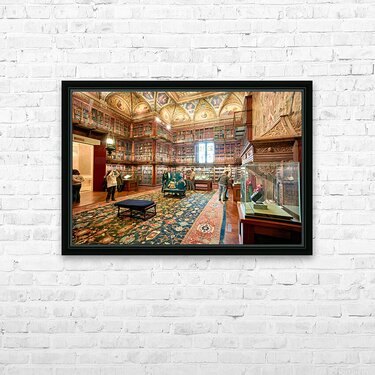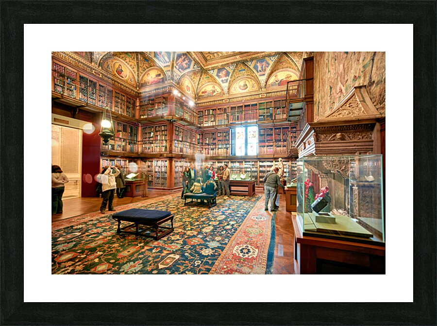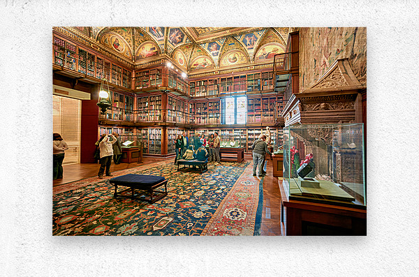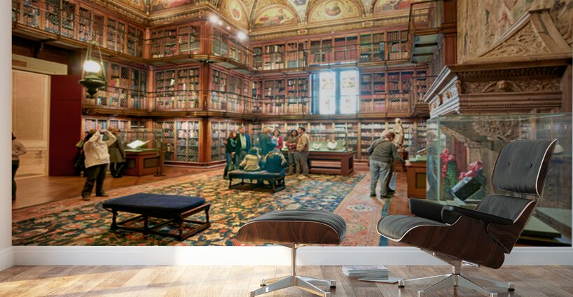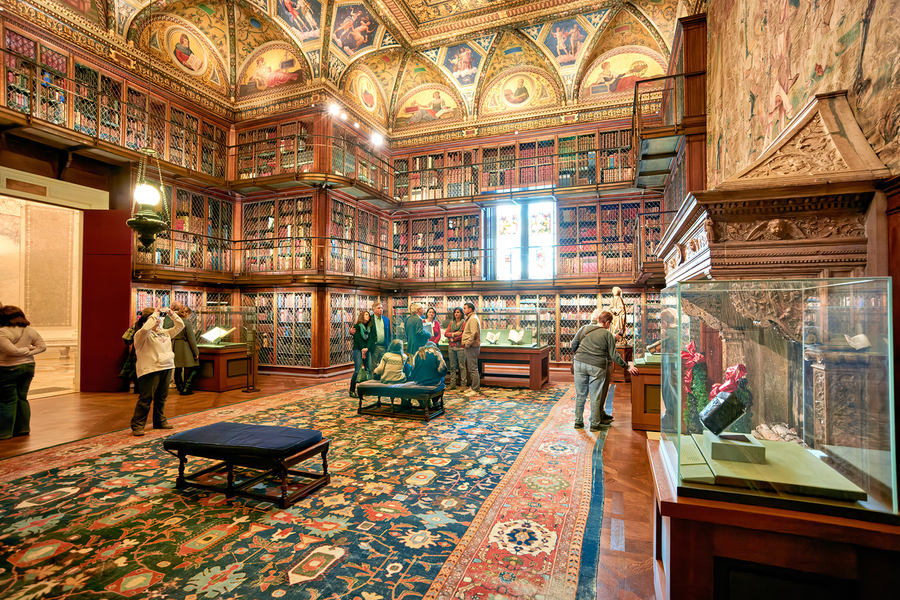 People walk through the Morgan Library and Museum in Manhattan. They admire books and art while enjoying the historic setting.
