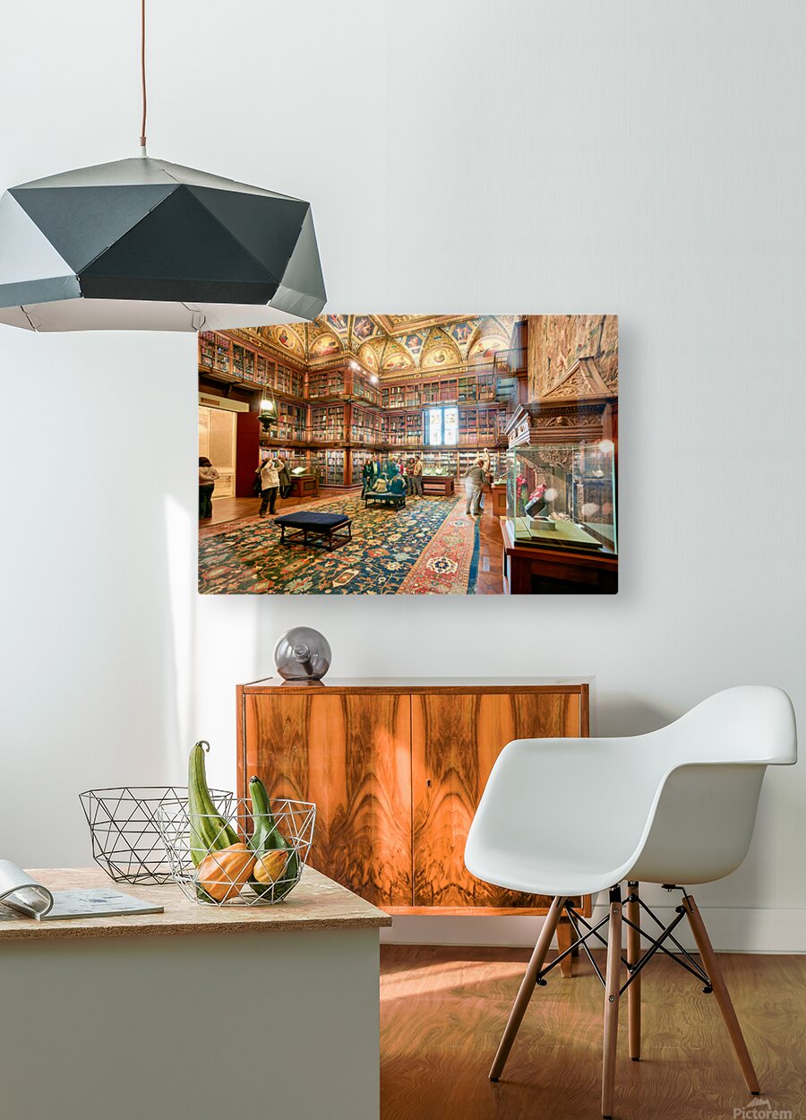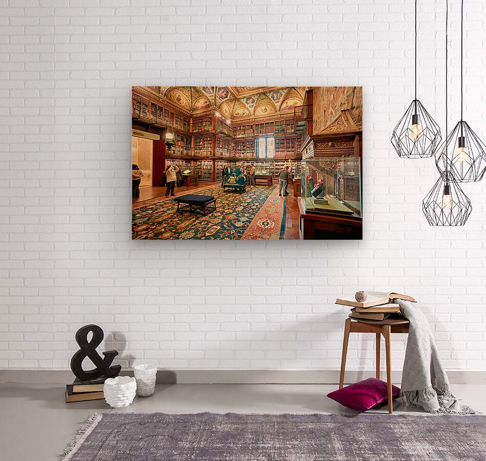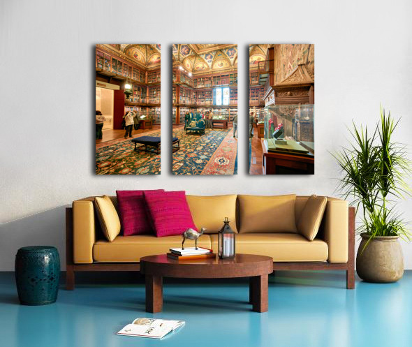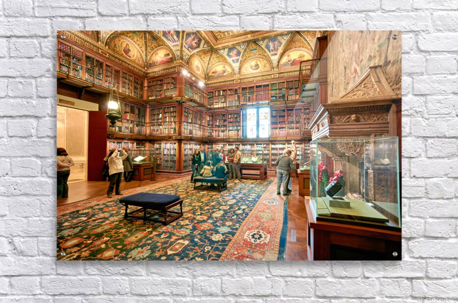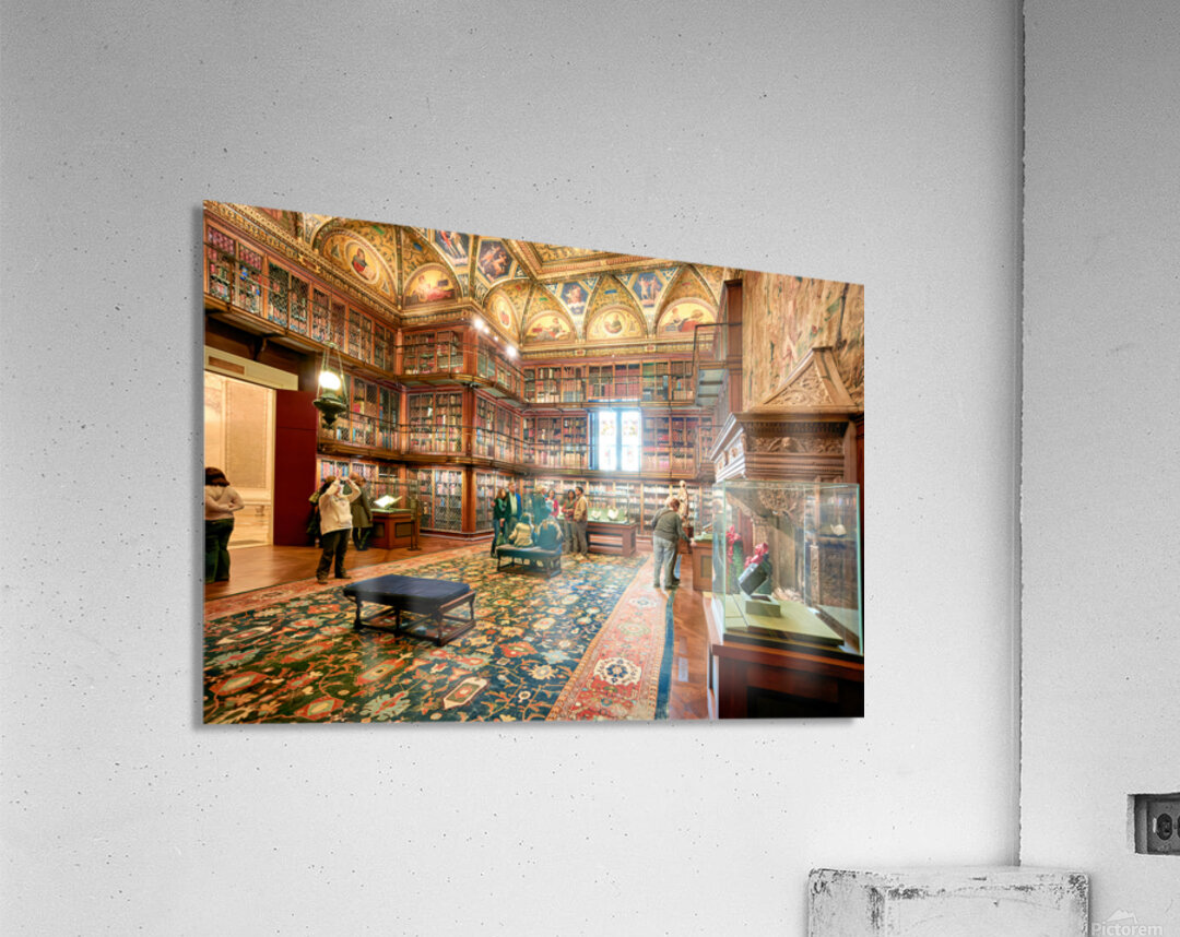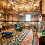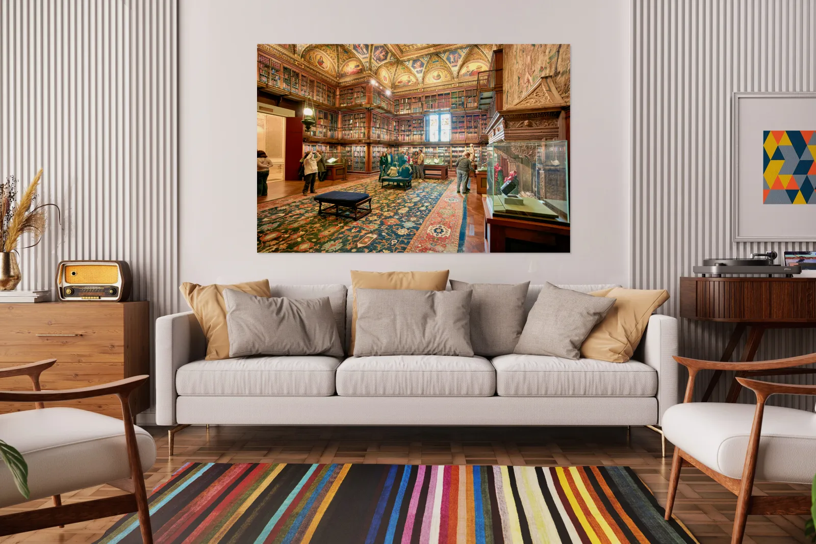 People walk through the Morgan Library and Museum in Manhattan. They admire books and art while enjoying the historic setting.