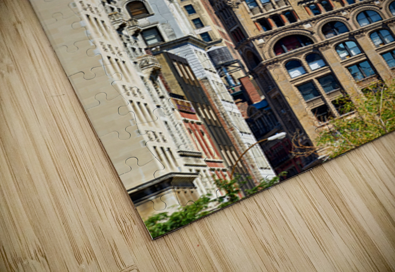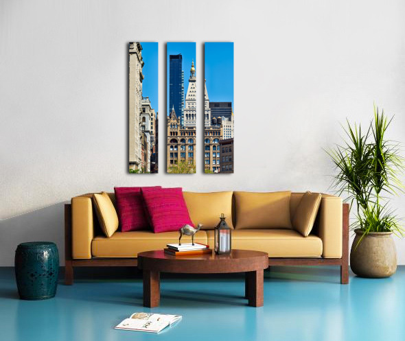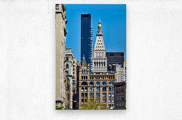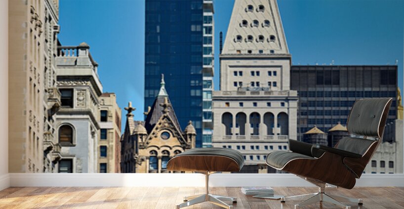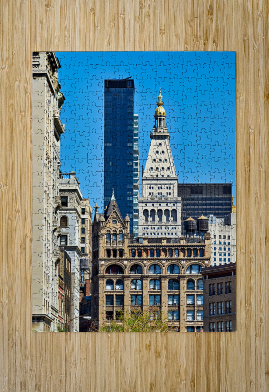 Downtown Manhattan shows a mix of old and new buildings under a bright sky. The scene highlights varied designs and styles of architecture.
