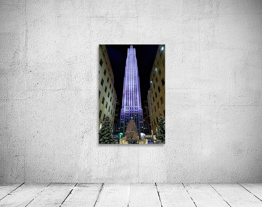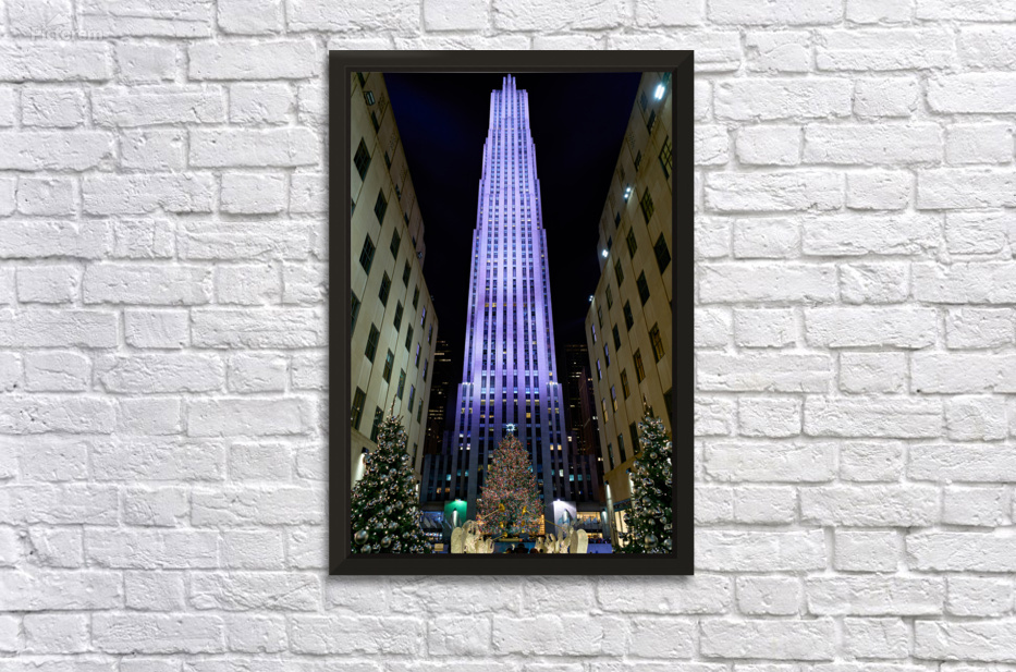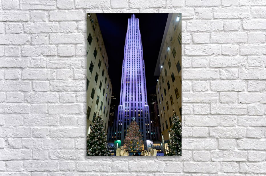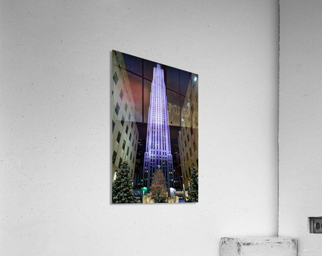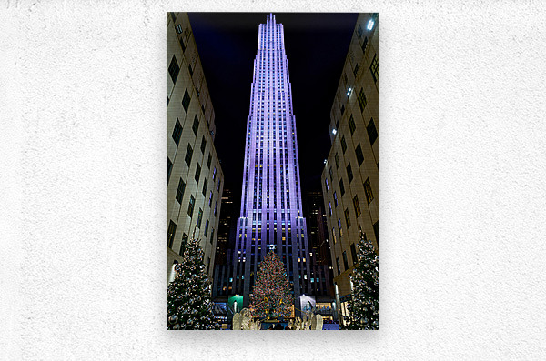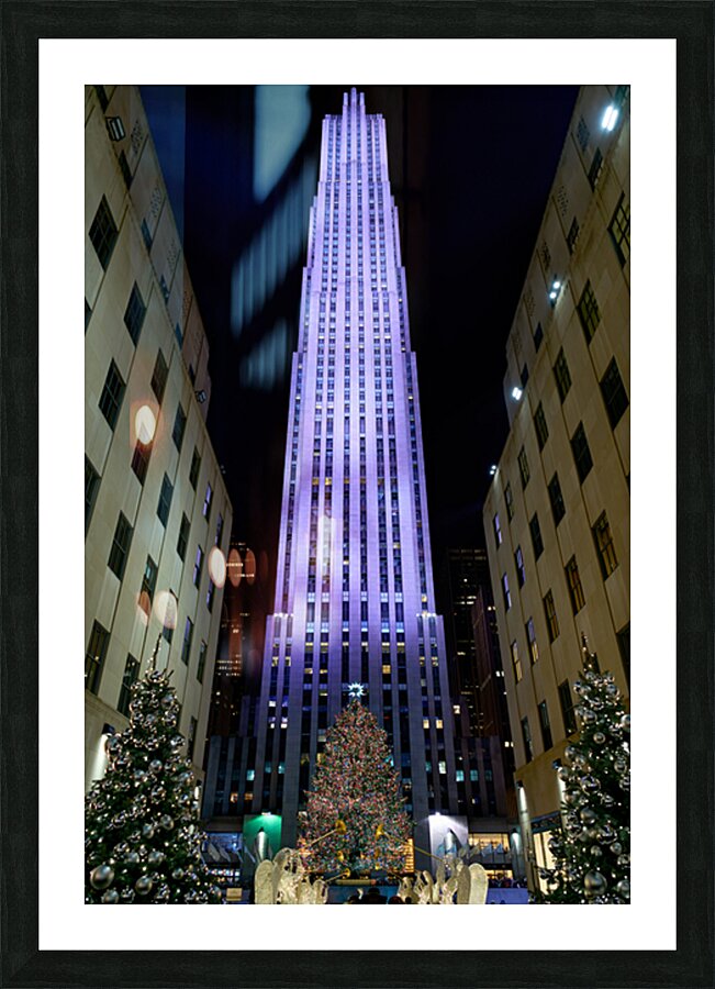 Visitors admire Rockefeller Center as it is lit up at night. The Christmas tree is decorated and surrounded by seasonal decorations.