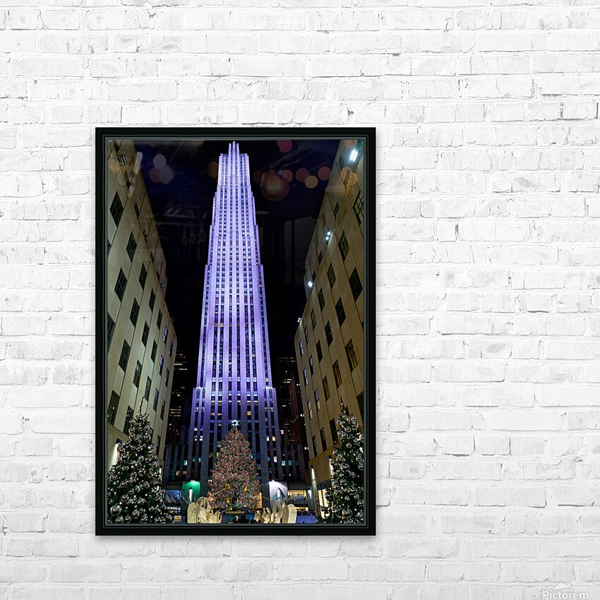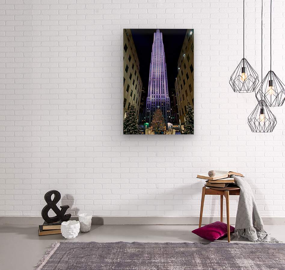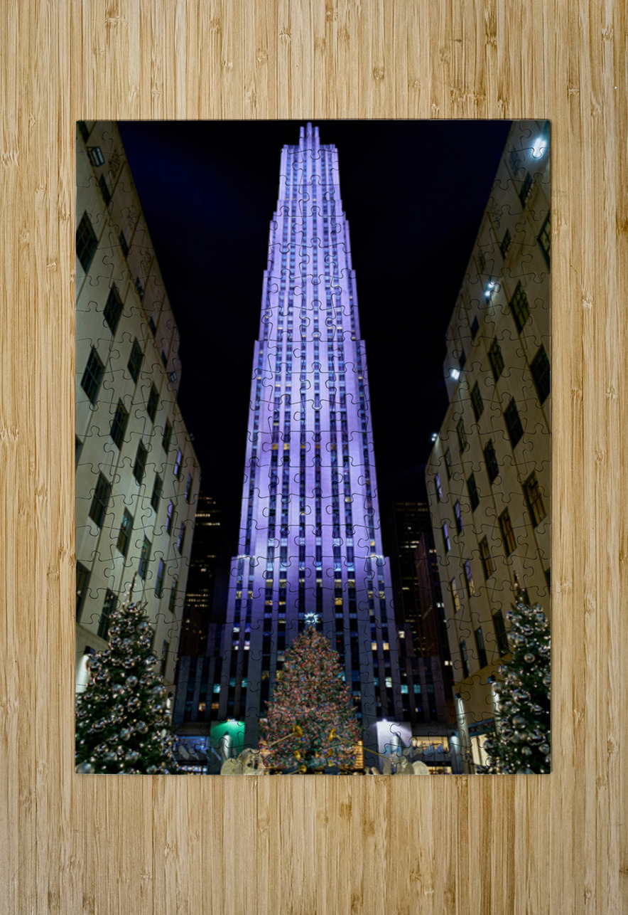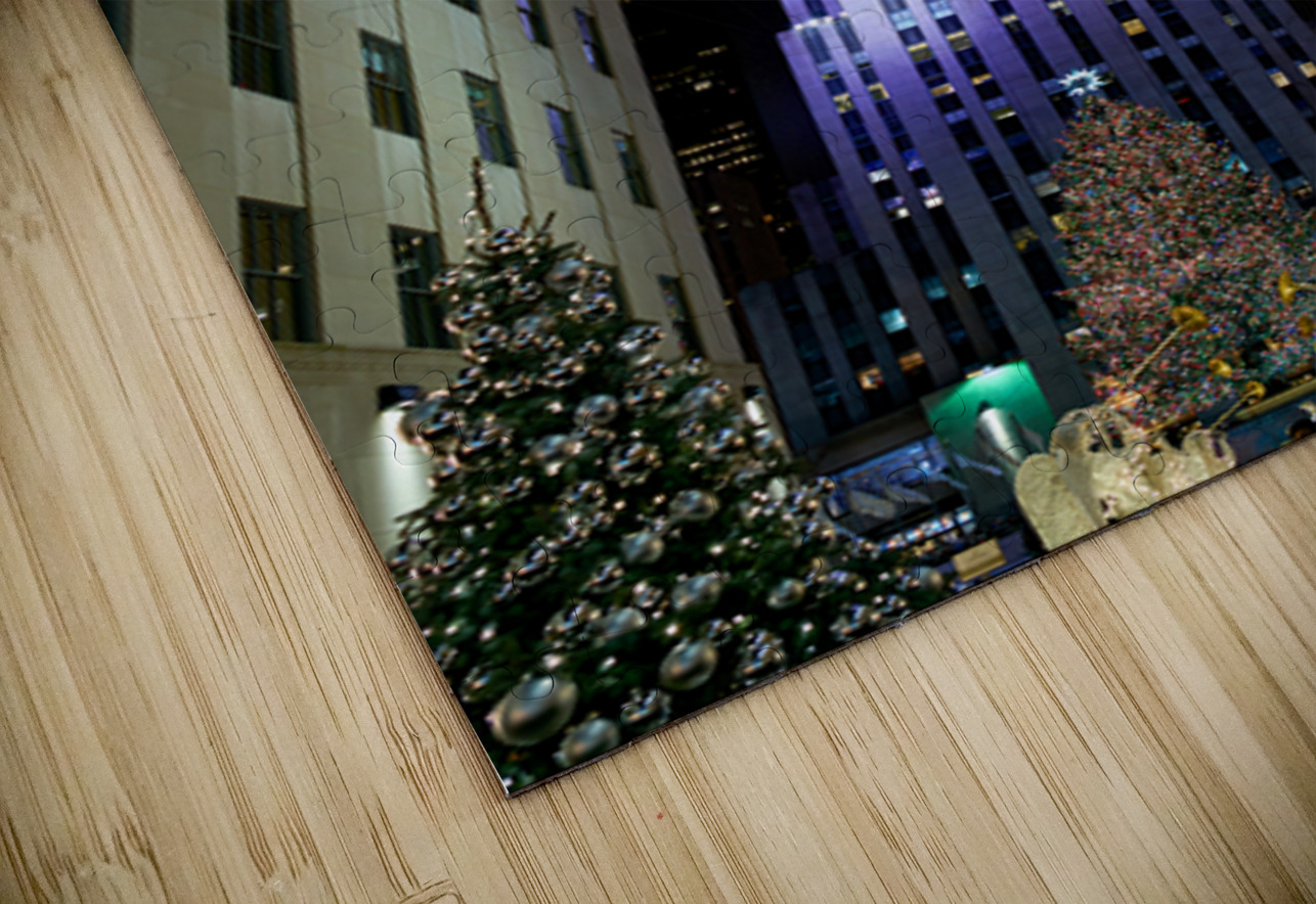 Visitors admire Rockefeller Center as it is lit up at night. The Christmas tree is decorated and surrounded by seasonal decorations.