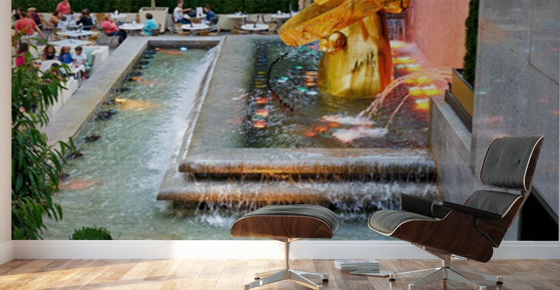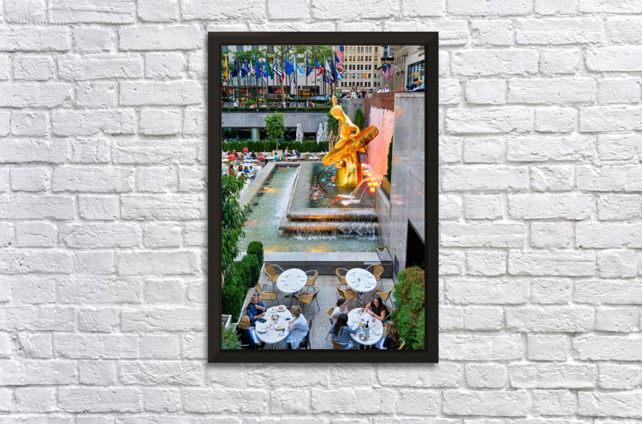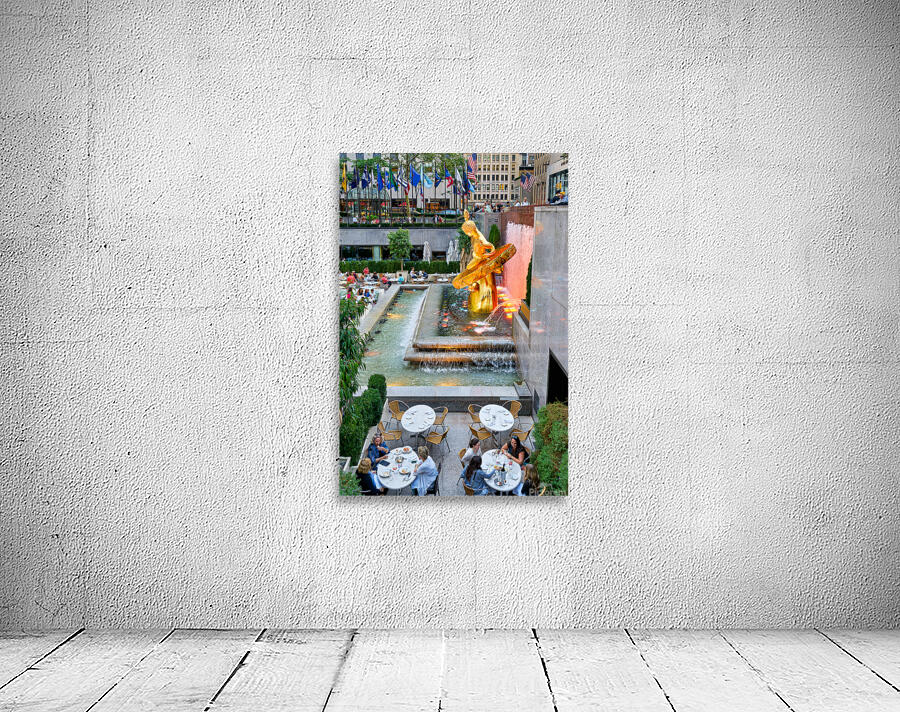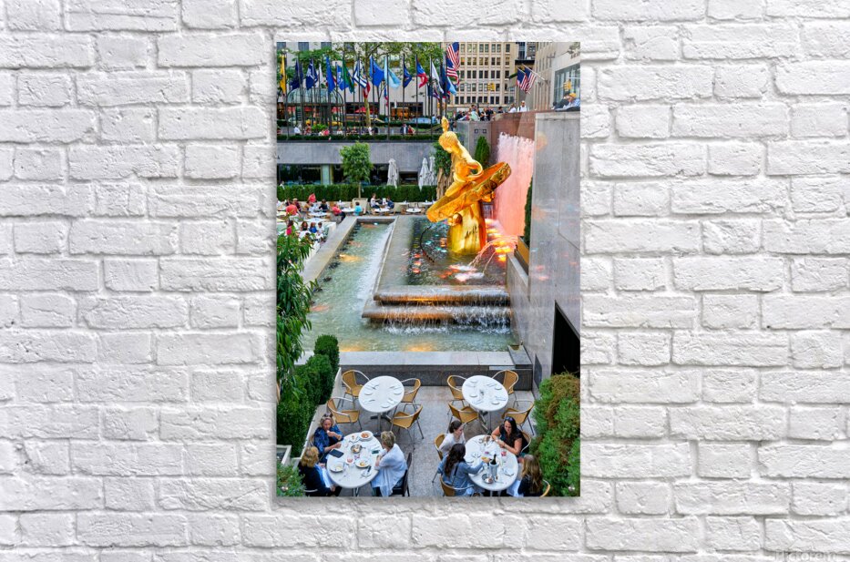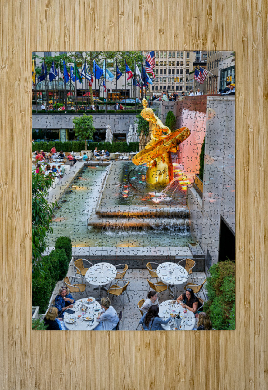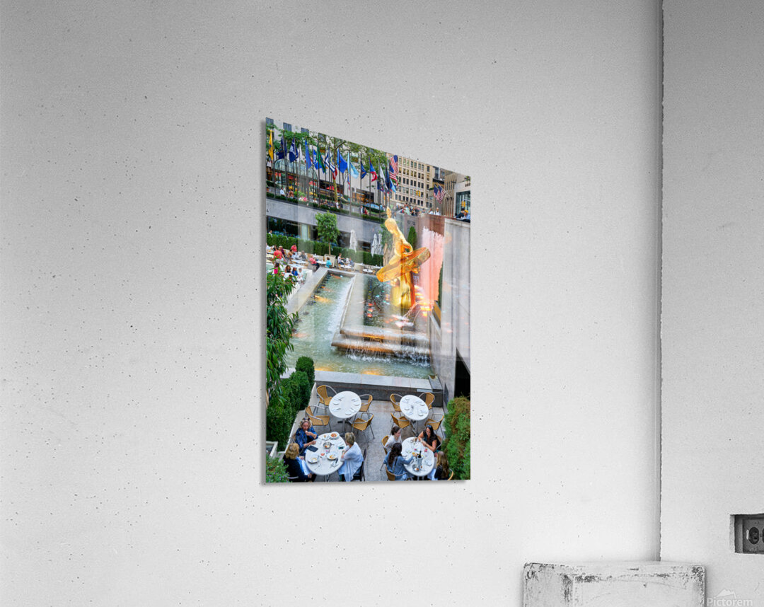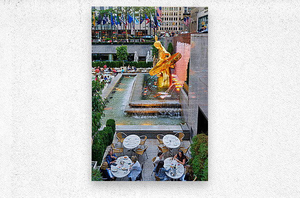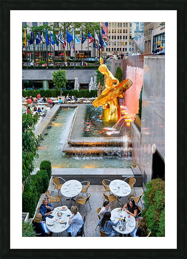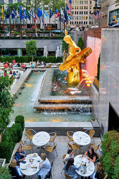 Golden Prometheus statue stands near water at Rockefeller Center. People dine at tables in a busy setting. Flags and buildings surround the area.