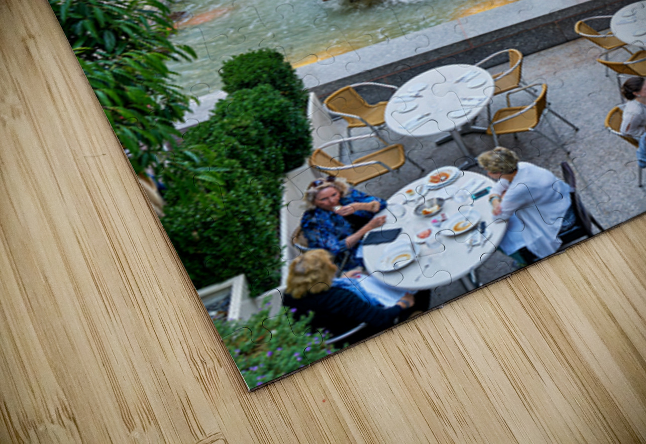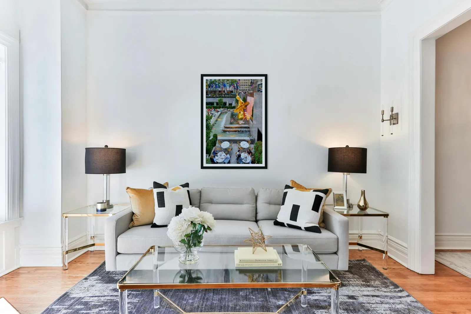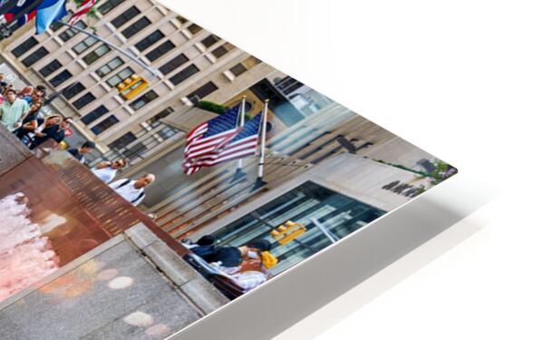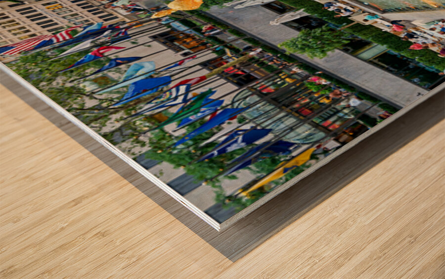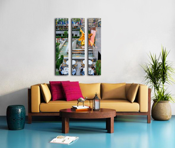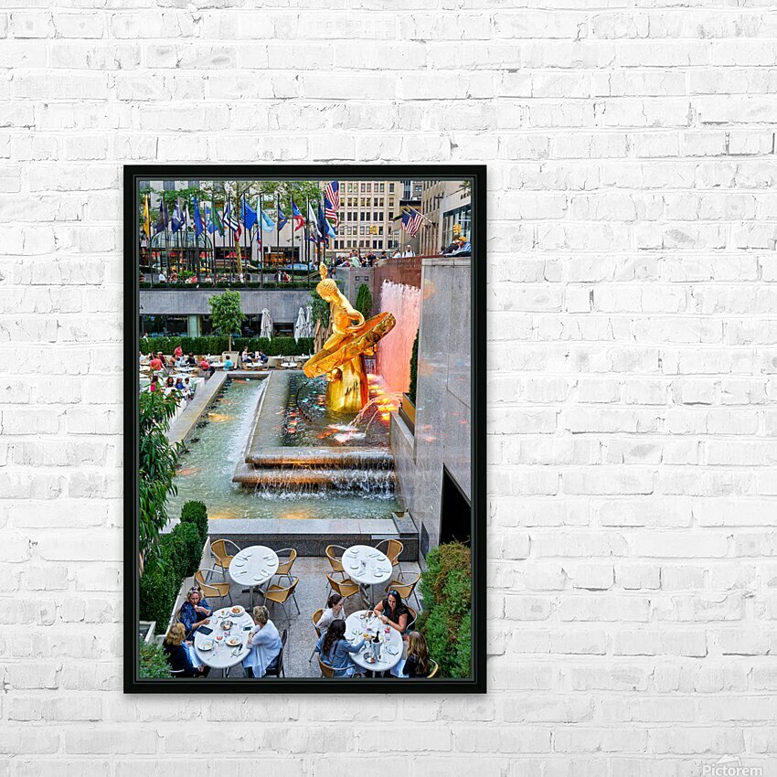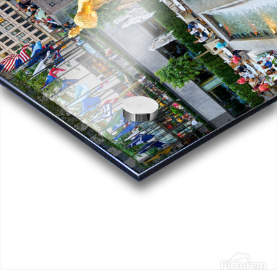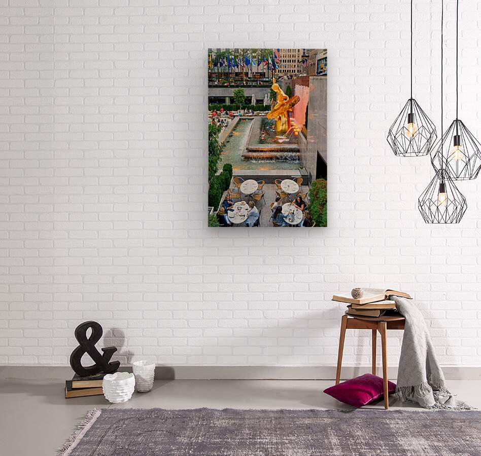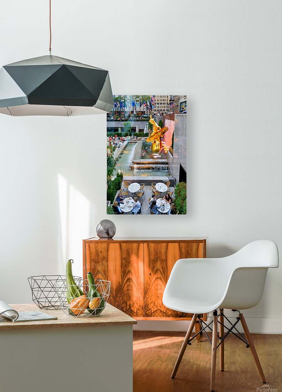 Golden Prometheus statue stands near water at Rockefeller Center. People dine at tables in a busy setting. Flags and buildings surround the area.