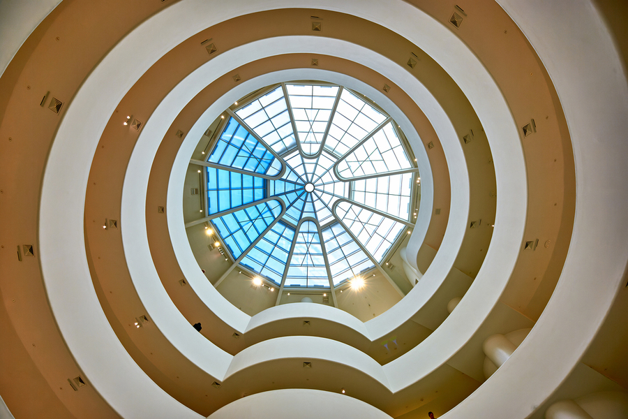 Visitors look up at the unique spiral design and skylight inside the Guggenheim Museum in Manhattan. The structure showcases modern architecture.