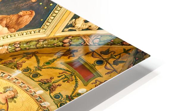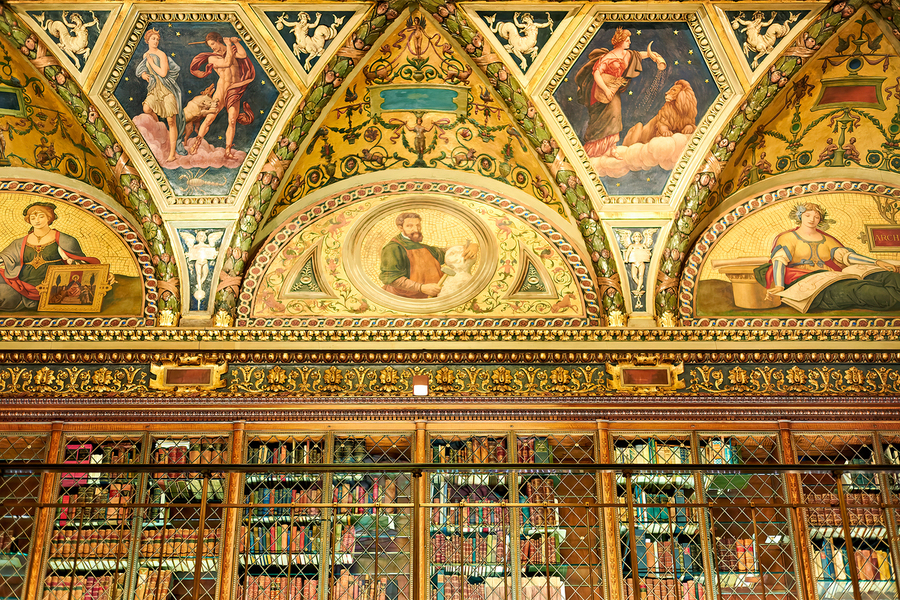 Visitors view art and shelves of books inside the Morgan Library and Museum in Manhattan. The library features detailed ceiling decorations.