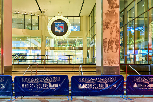 People gather near the Madison Square Garden entrance in Manhattan New York. They wait near barriers for an upcoming event in a busy area.