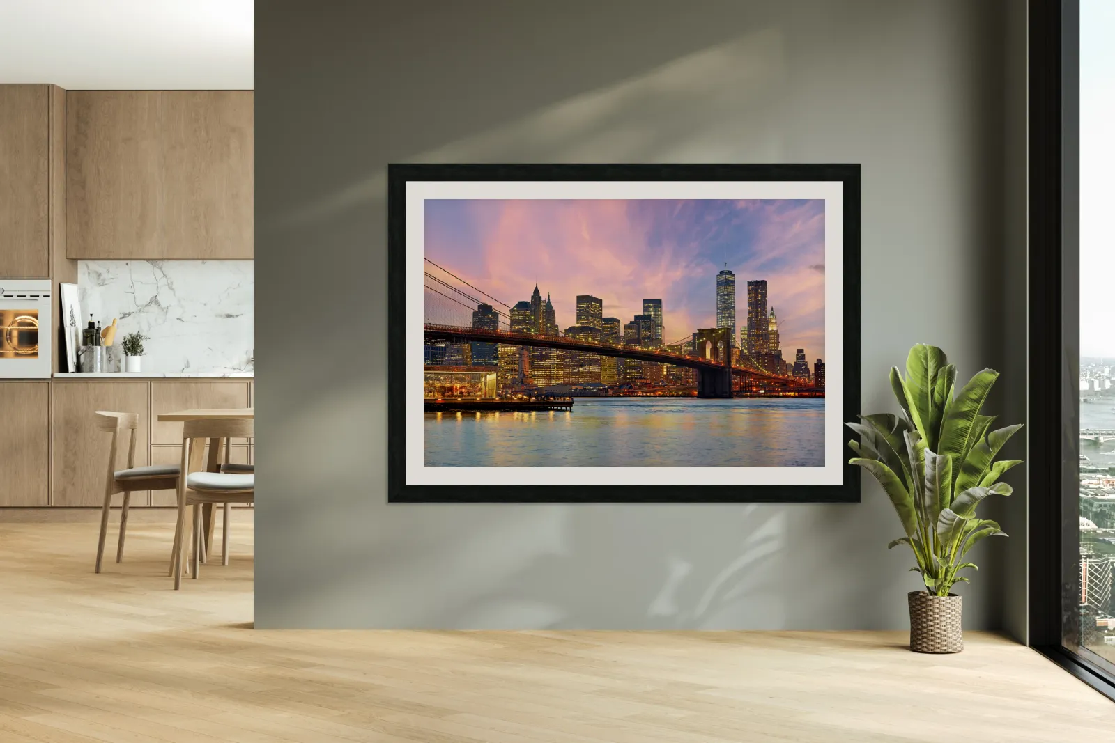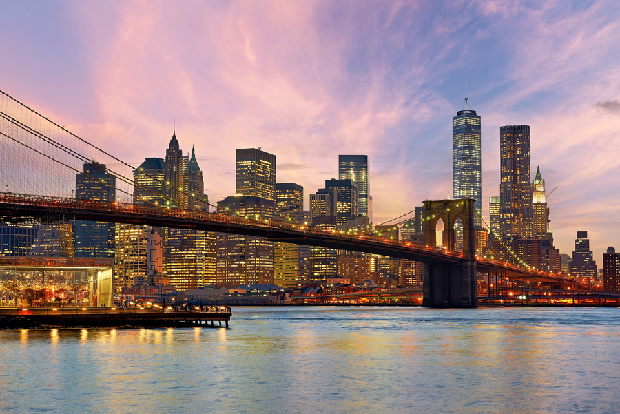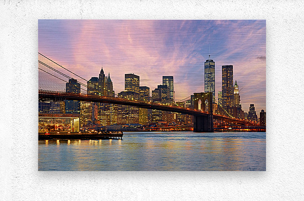 The view shows Brooklyn Bridge with New York City buildings at sunset. The sky has colors as the day ends. The river reflects the city lights.