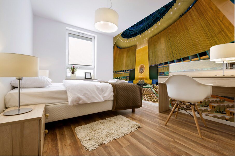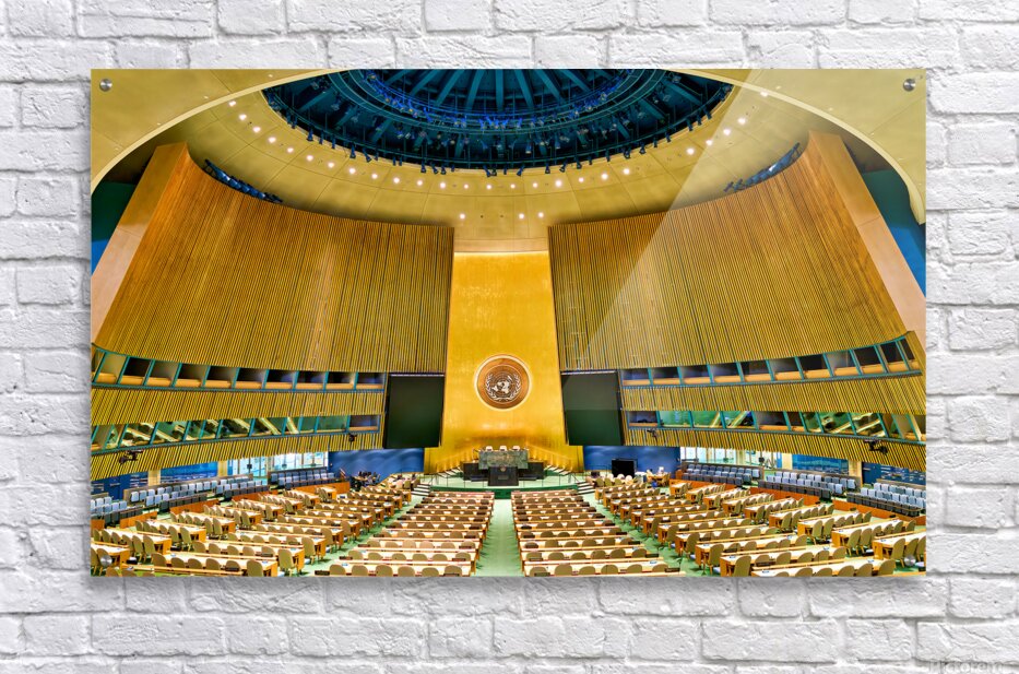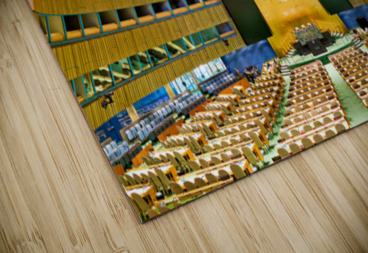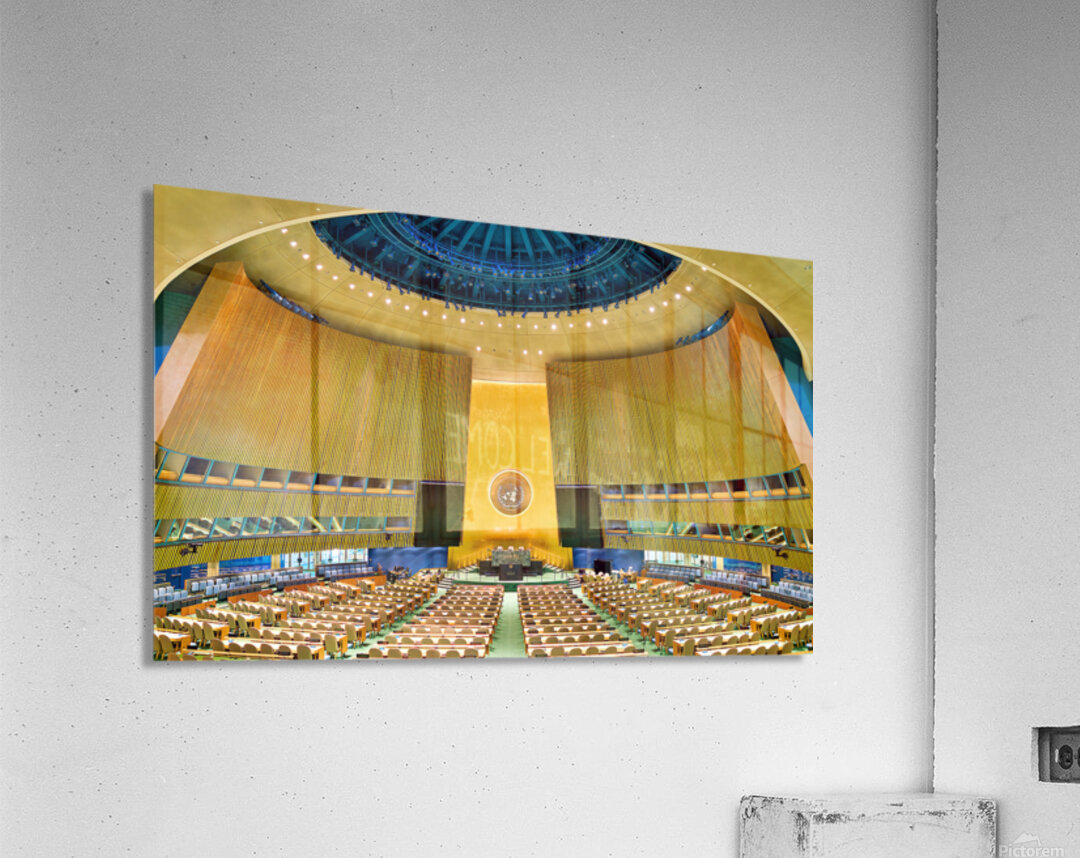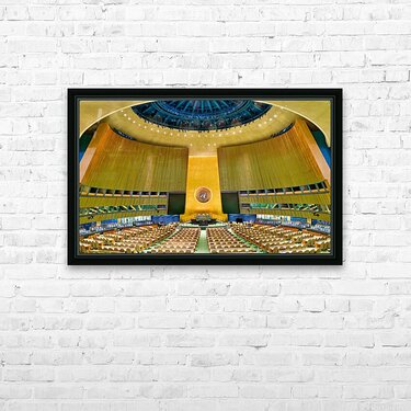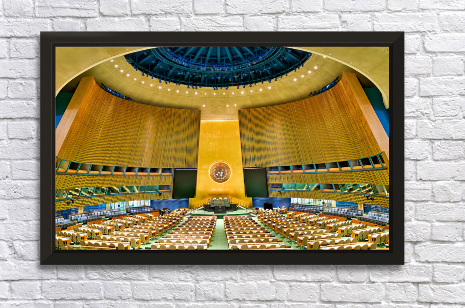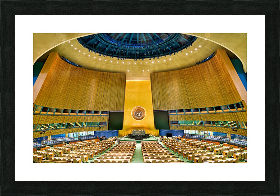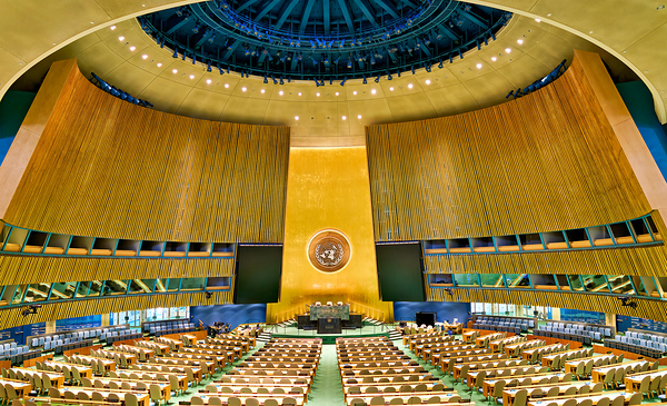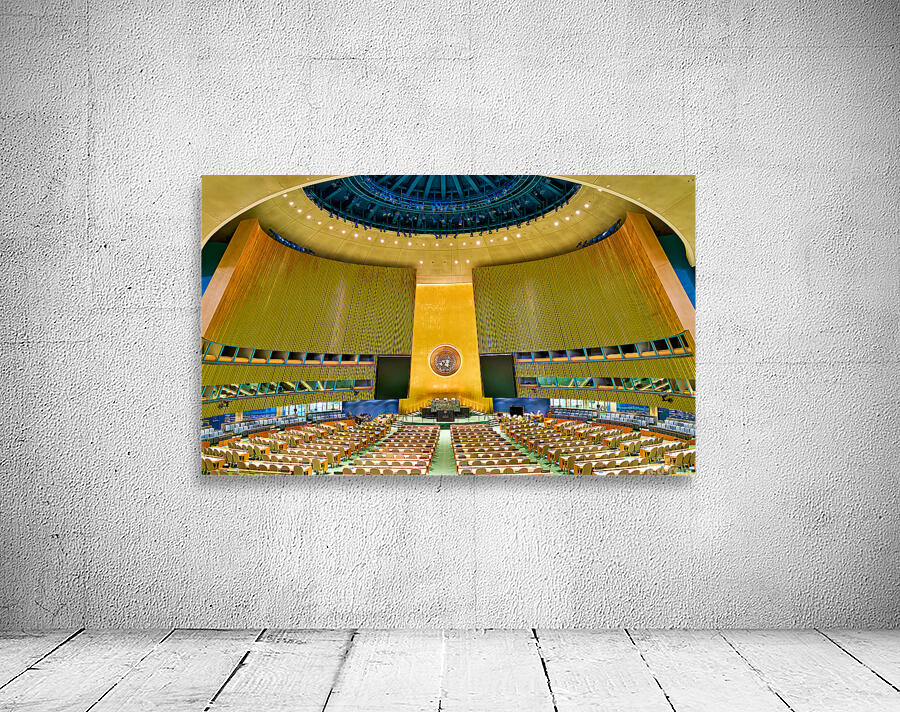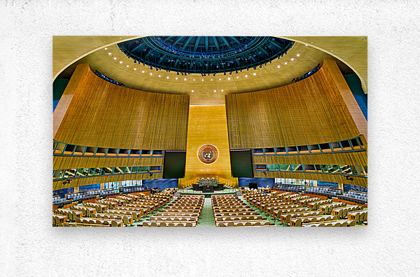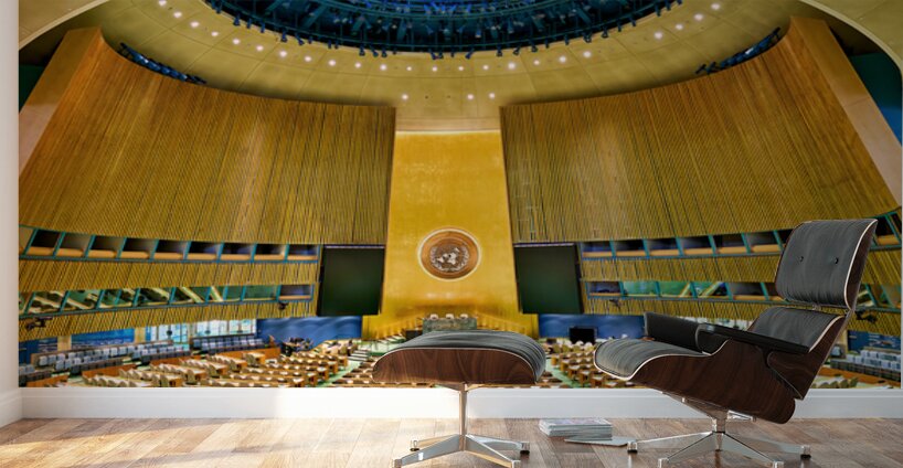Inside view of the General Assembly Hall at the United Nations in Manhattan New York showing seating and the central podium area.