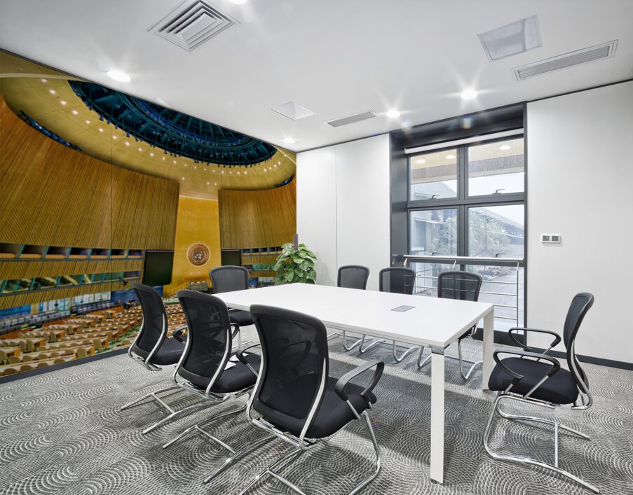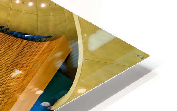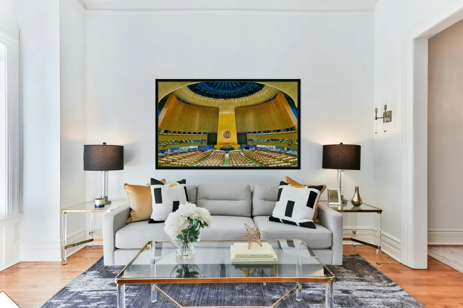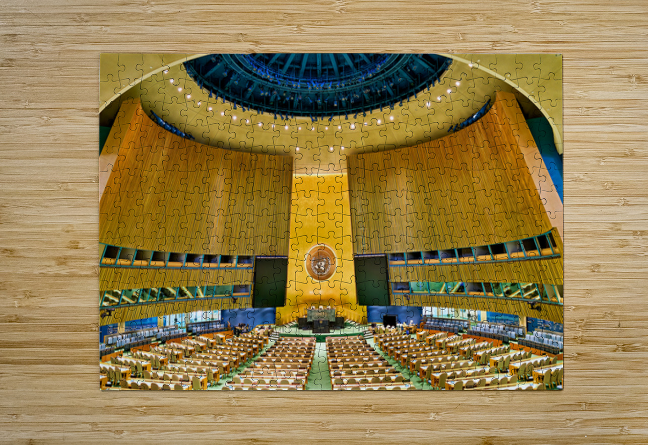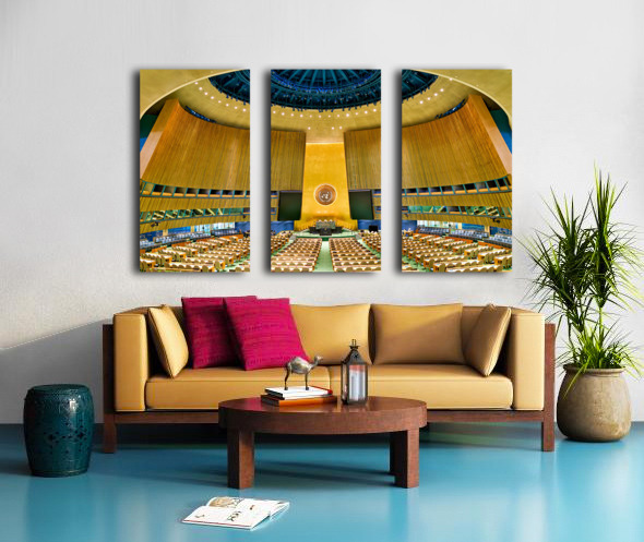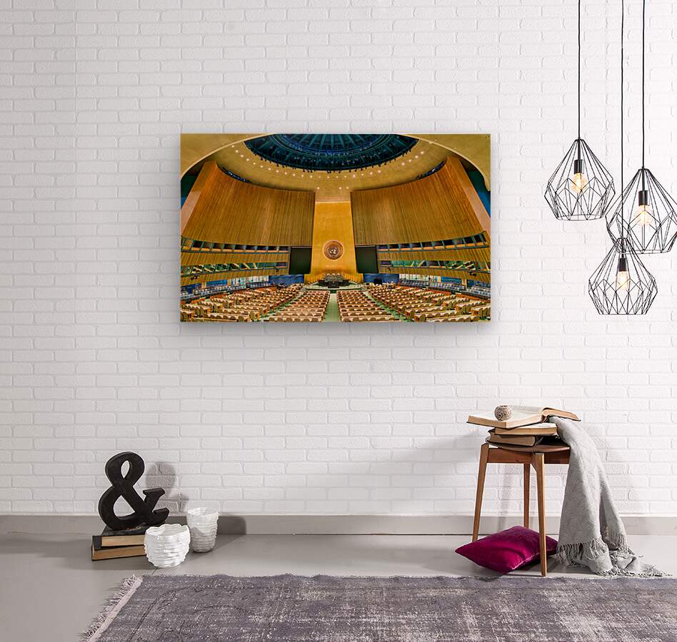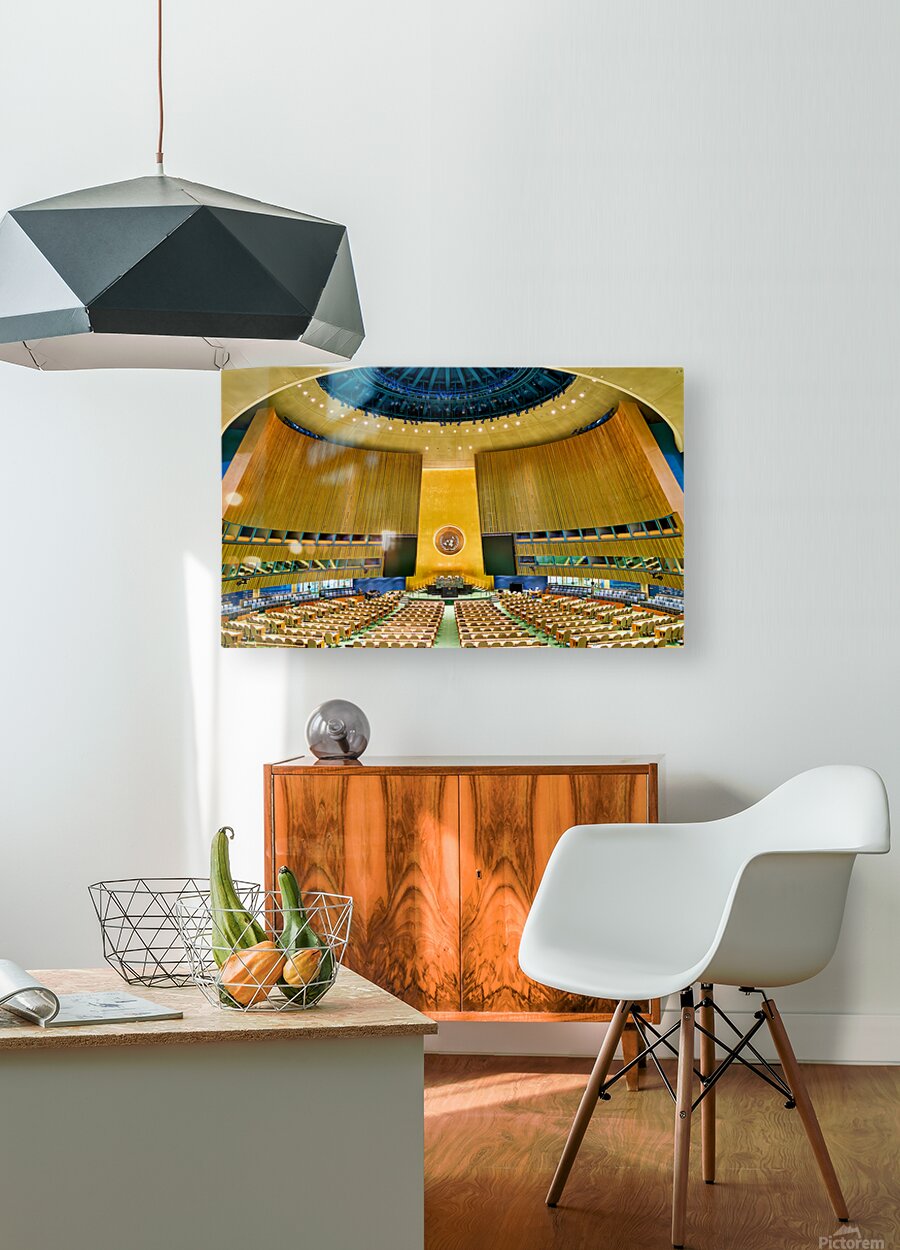 Inside view of the General Assembly Hall at the United Nations in Manhattan New York showing seating and the central podium area.