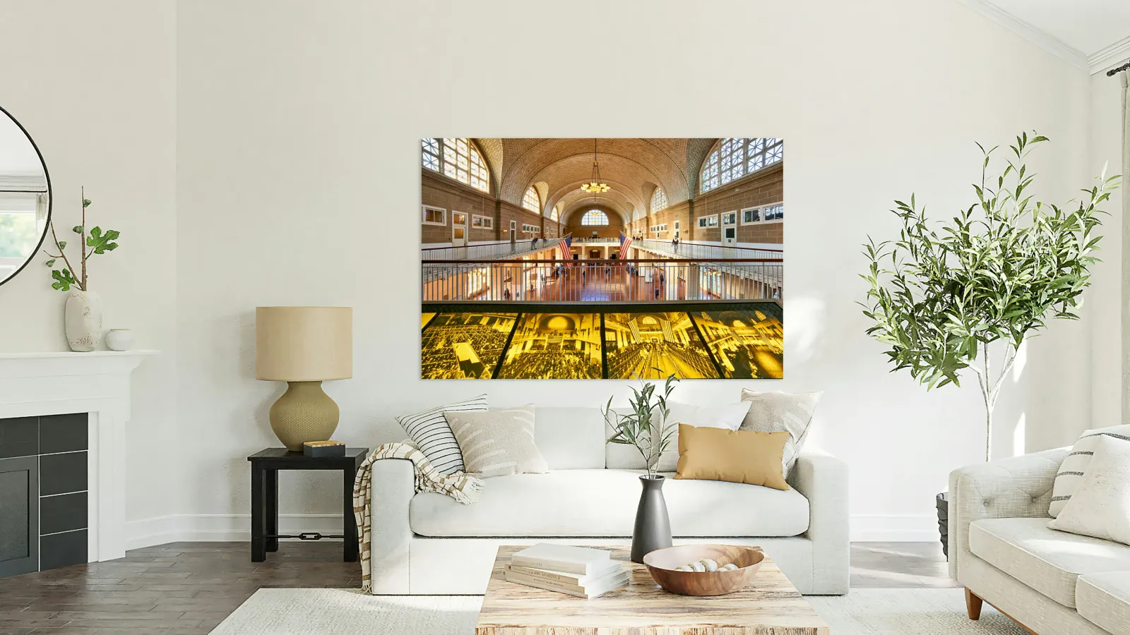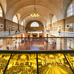 People walk through the halls of Ellis Island in New York. They learn about the immigration process from displays and exhibits.