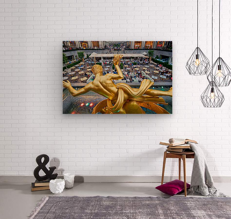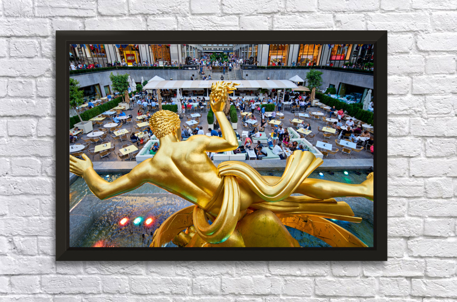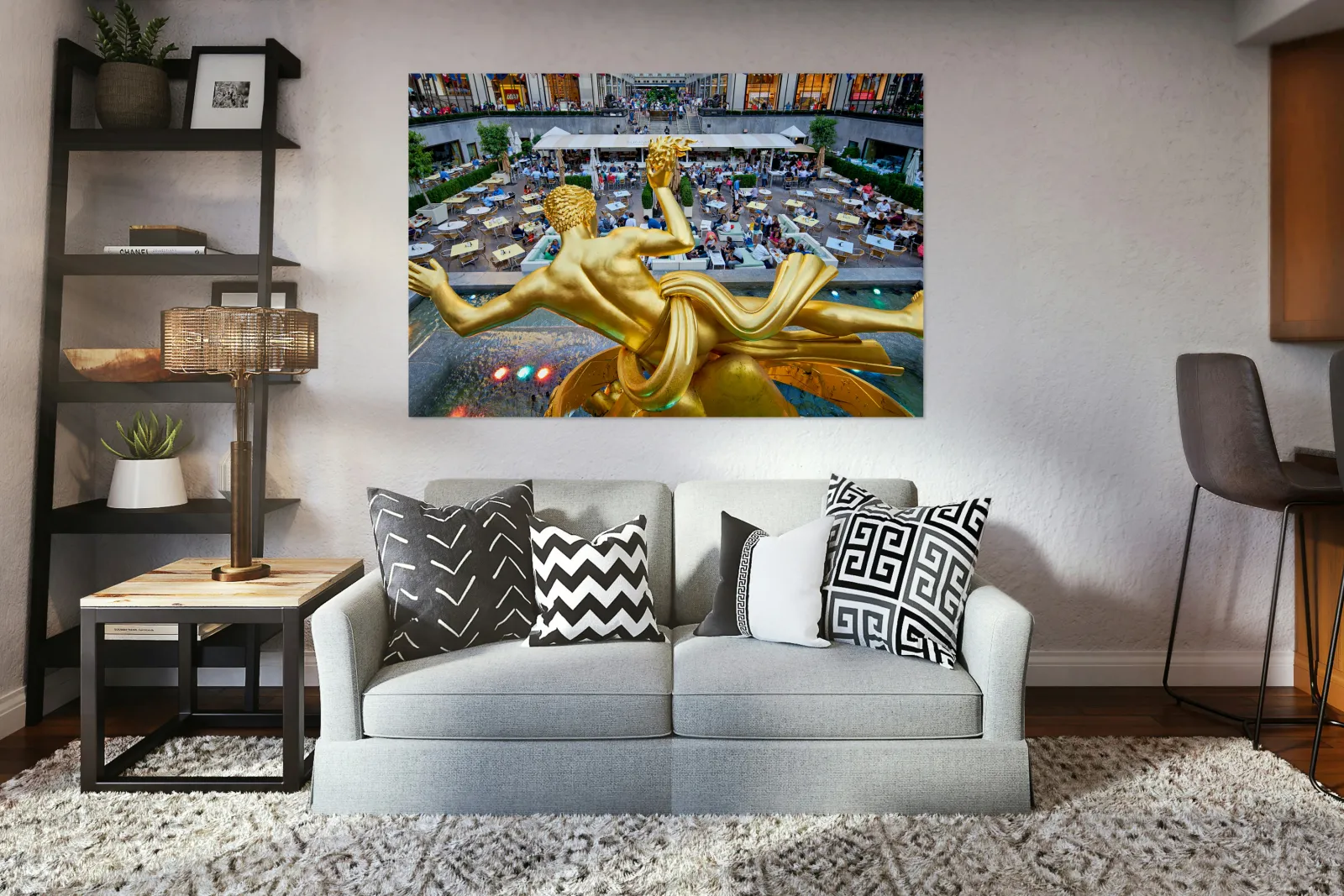 A view of Prometheus holding fire at Rockefeller Center with visitors dining and enjoying the area in Manhattan on a sunny day.