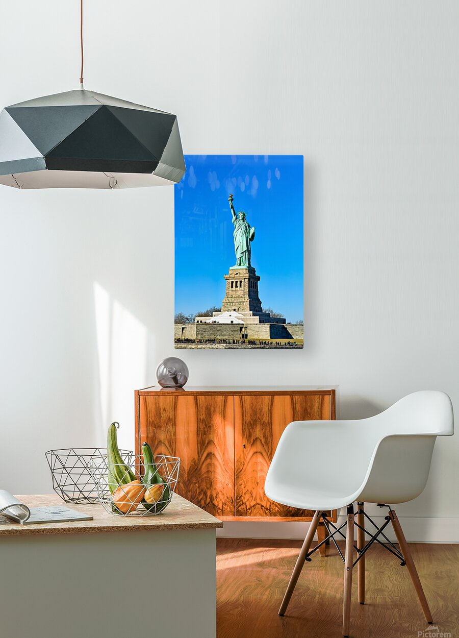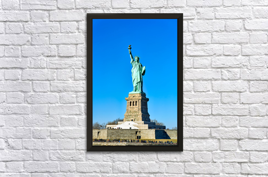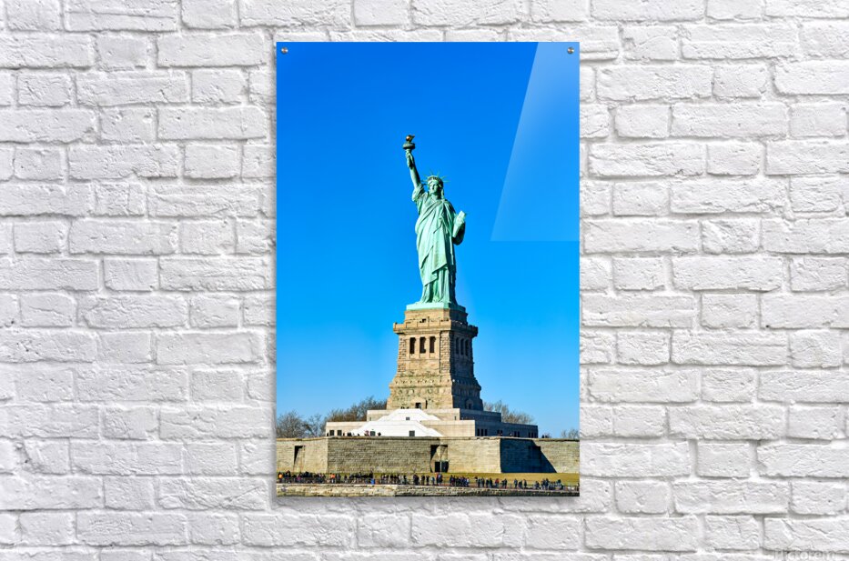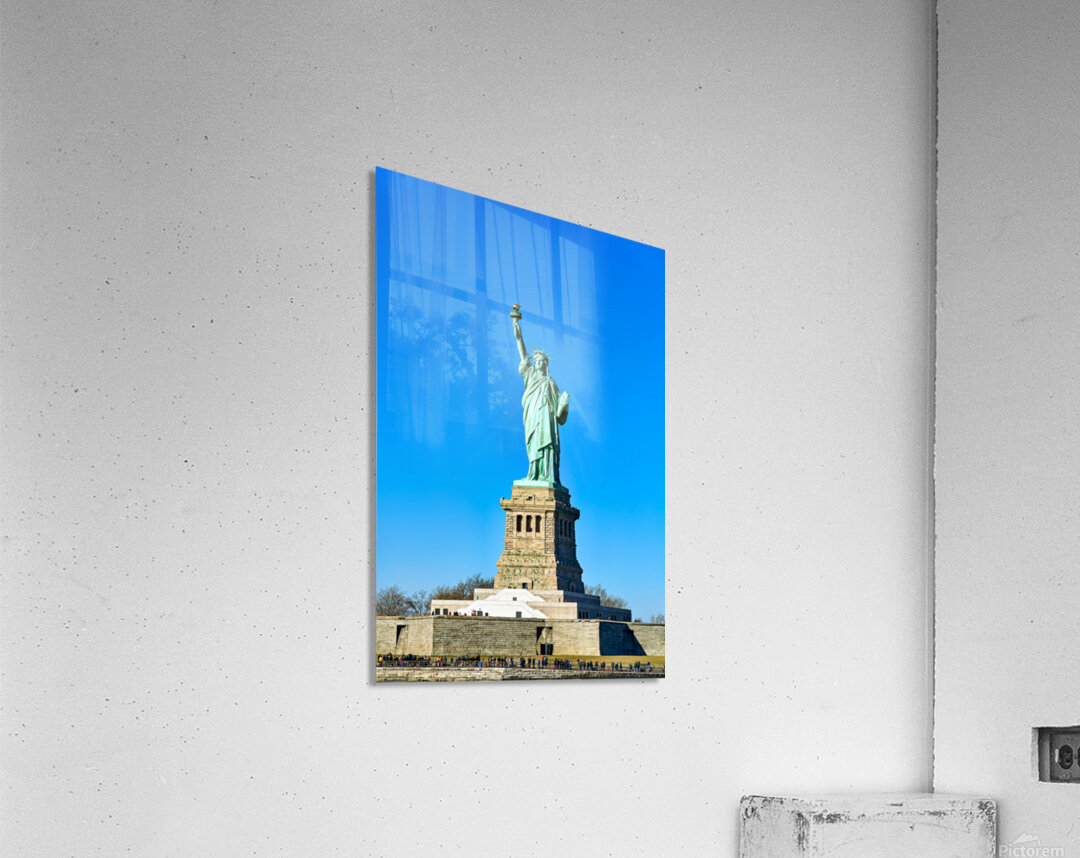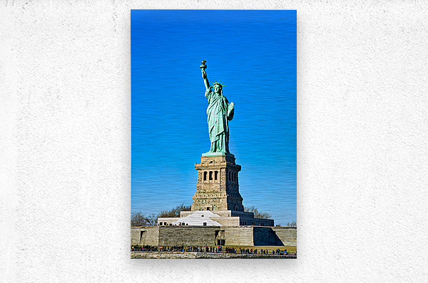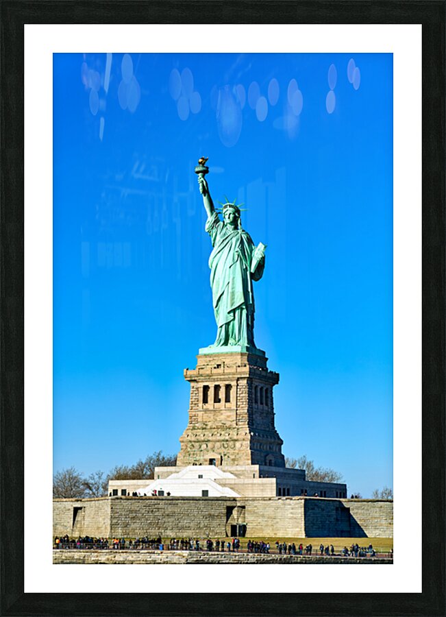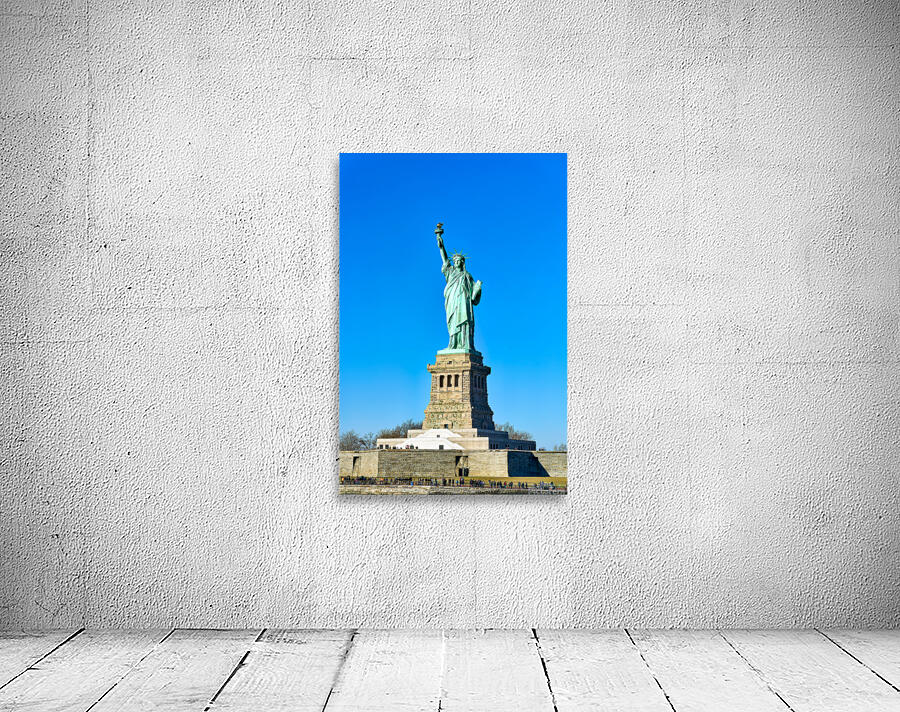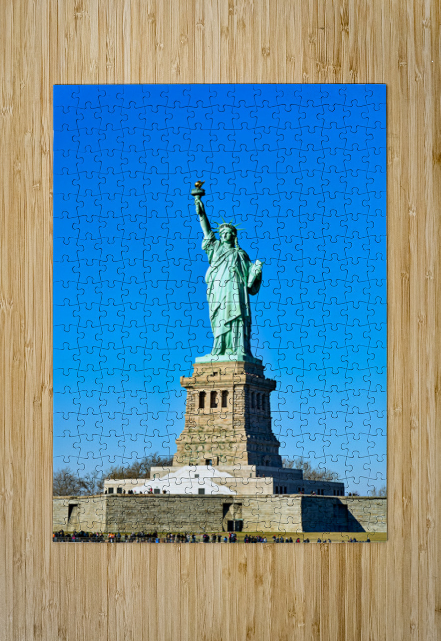The Statue of Liberty rises above the ground on Liberty Island in Manhattan. Visitors gather to see this landmark under a clear sky.