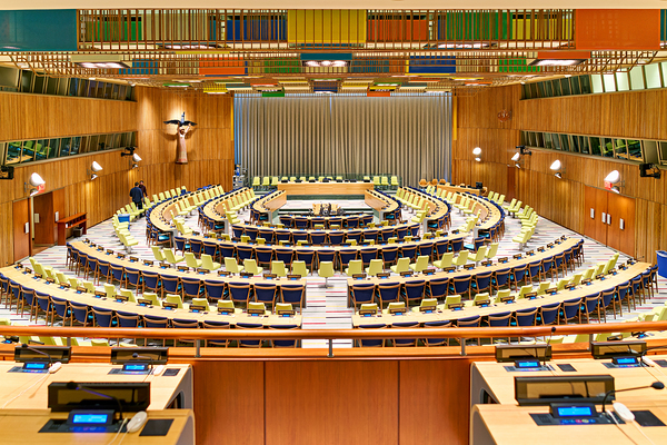 The Trusteeship Council chamber in UN headquarters is ready for discussions. Seats are arranged in a circle for upcoming meetings.