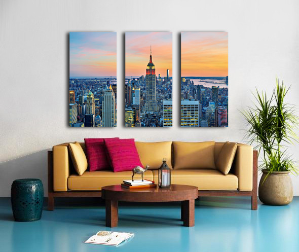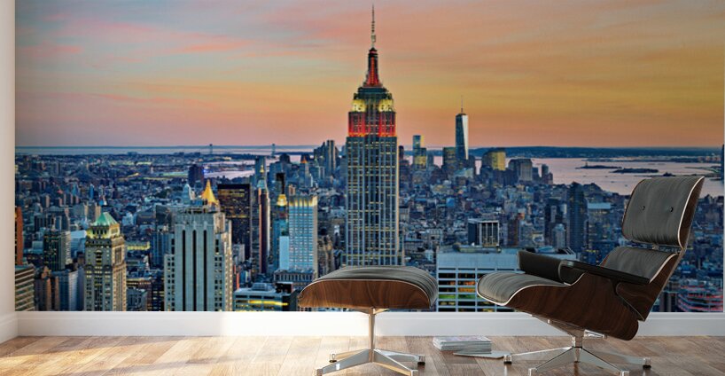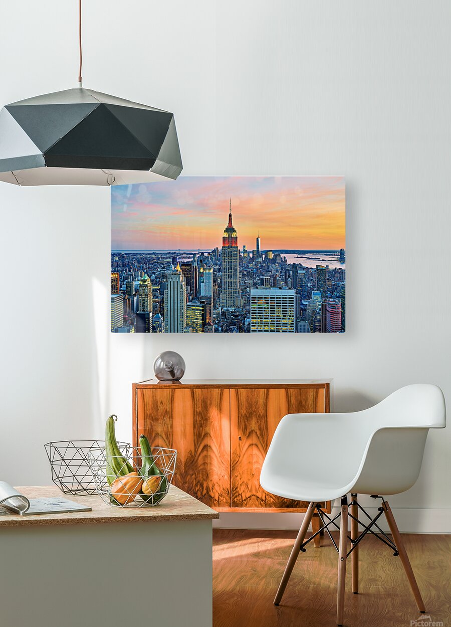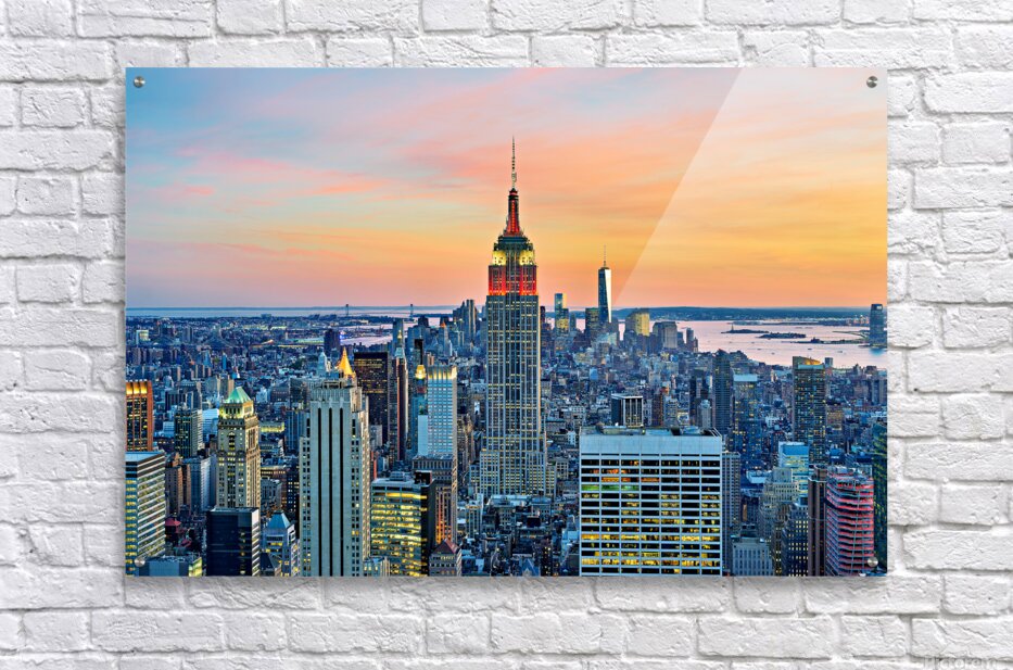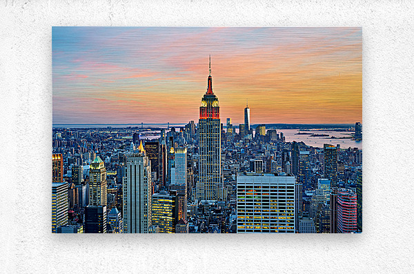 ABOUT THIS ARTWORK: AERIAL VIEW OF EMPIRE STATE BUILDING AT SUNSET IN NEW YORK CITY