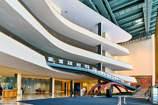 People move through the entrance of the United Nations Headquarters in Manhattan. The building shows modern architecture and design.
