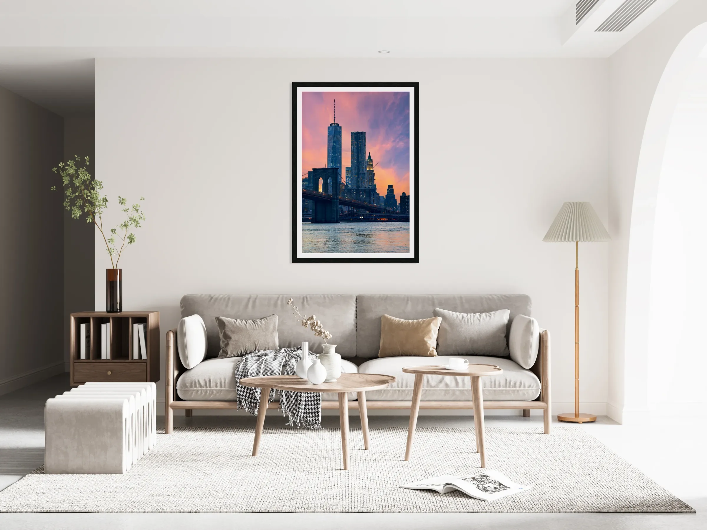 Brooklyn Bridge and Manhattan skyline during sunset in New York Frame print