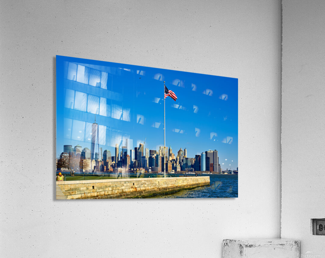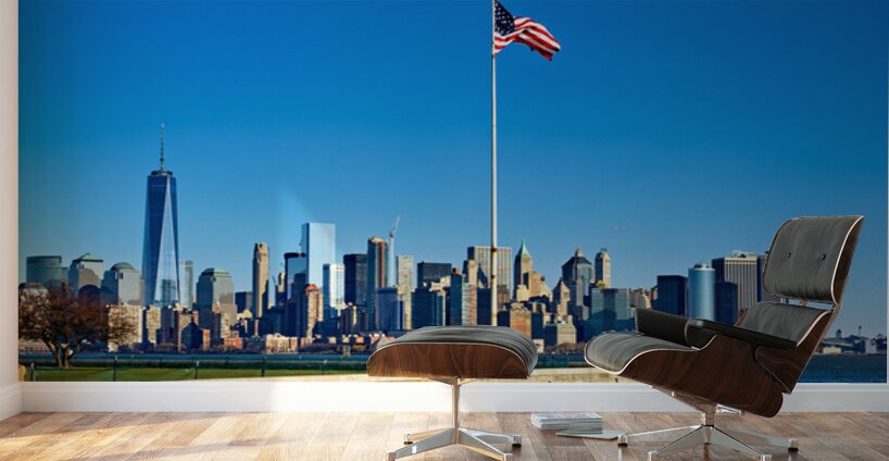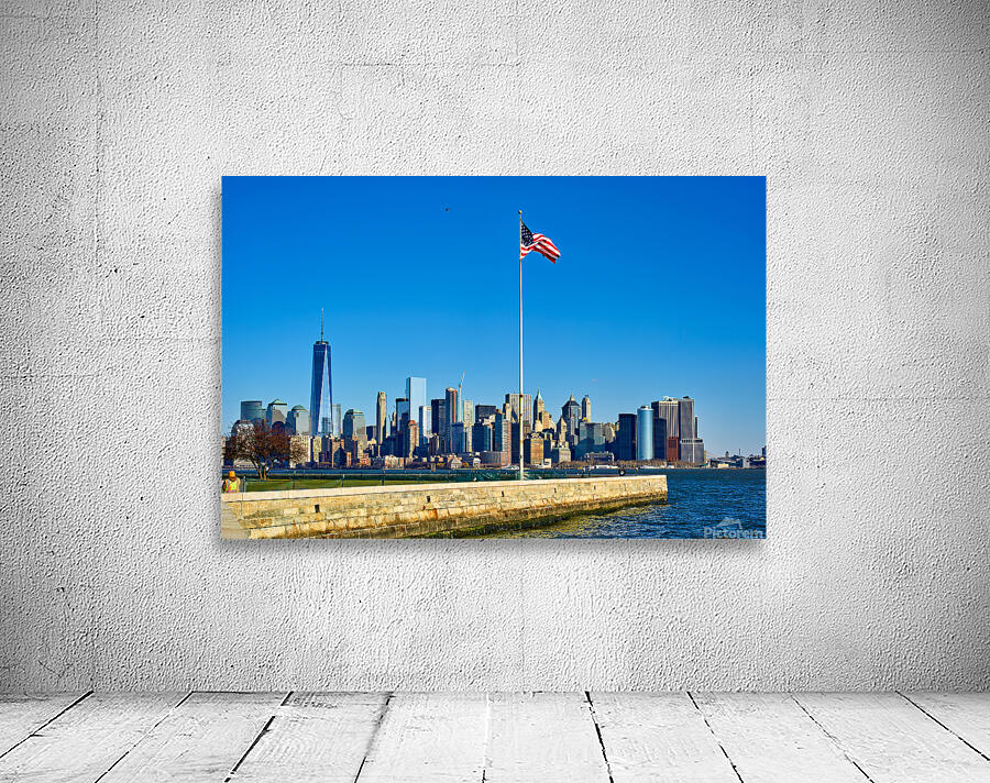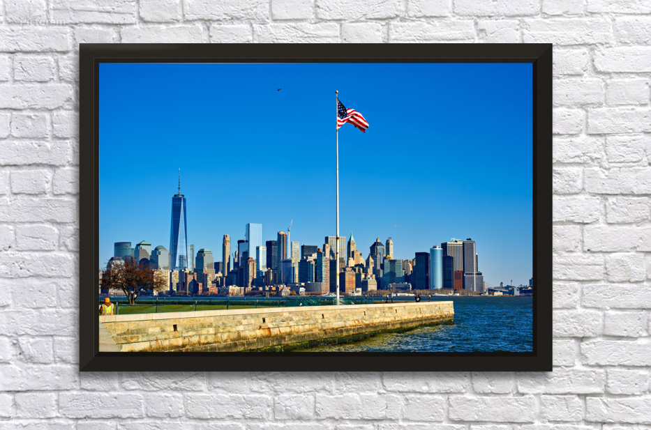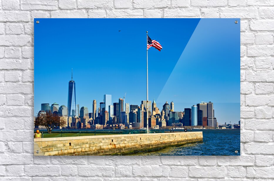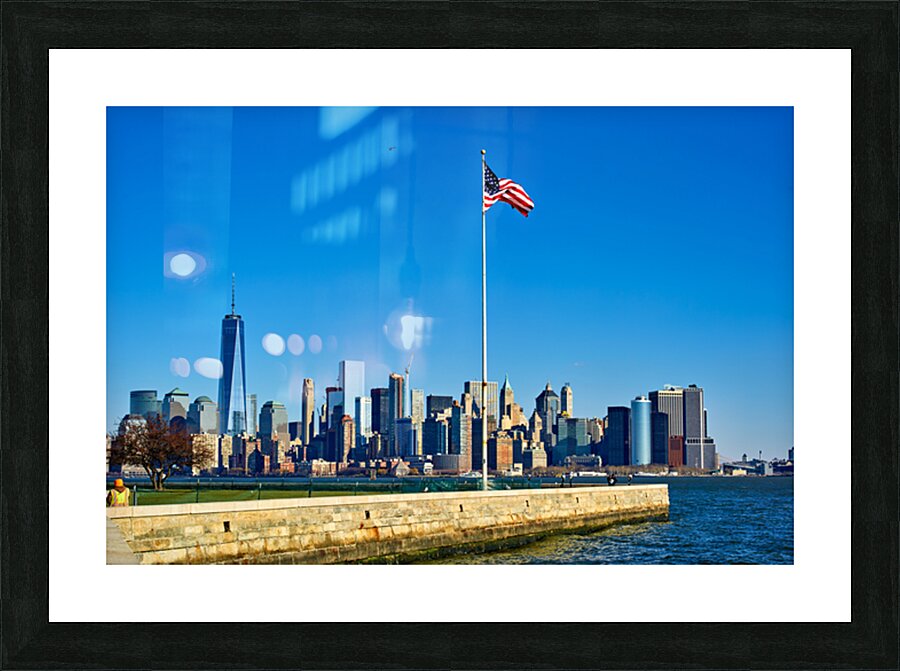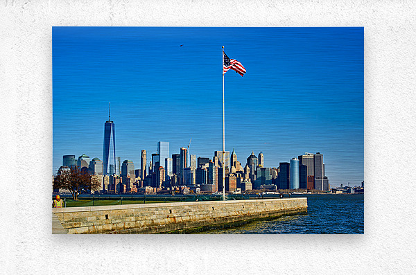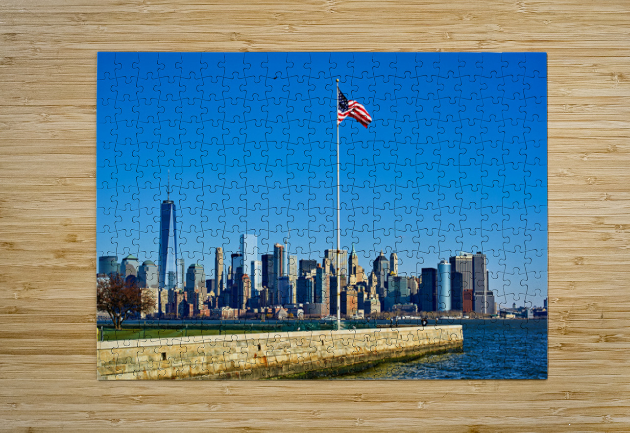 On Liberty Island the view shows the Manhattan skyline with the American flag waving. People walk along the waters edge enjoying the scene.