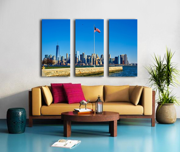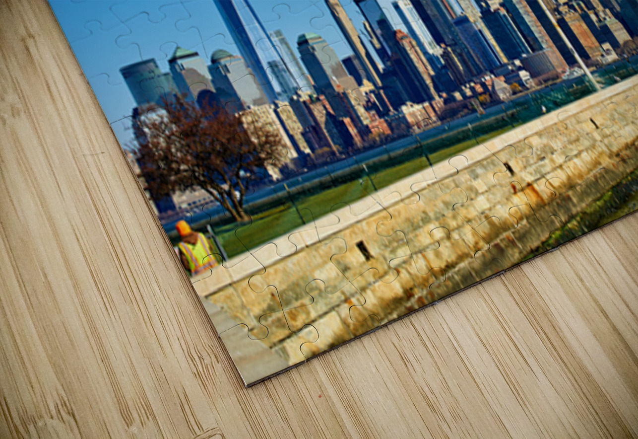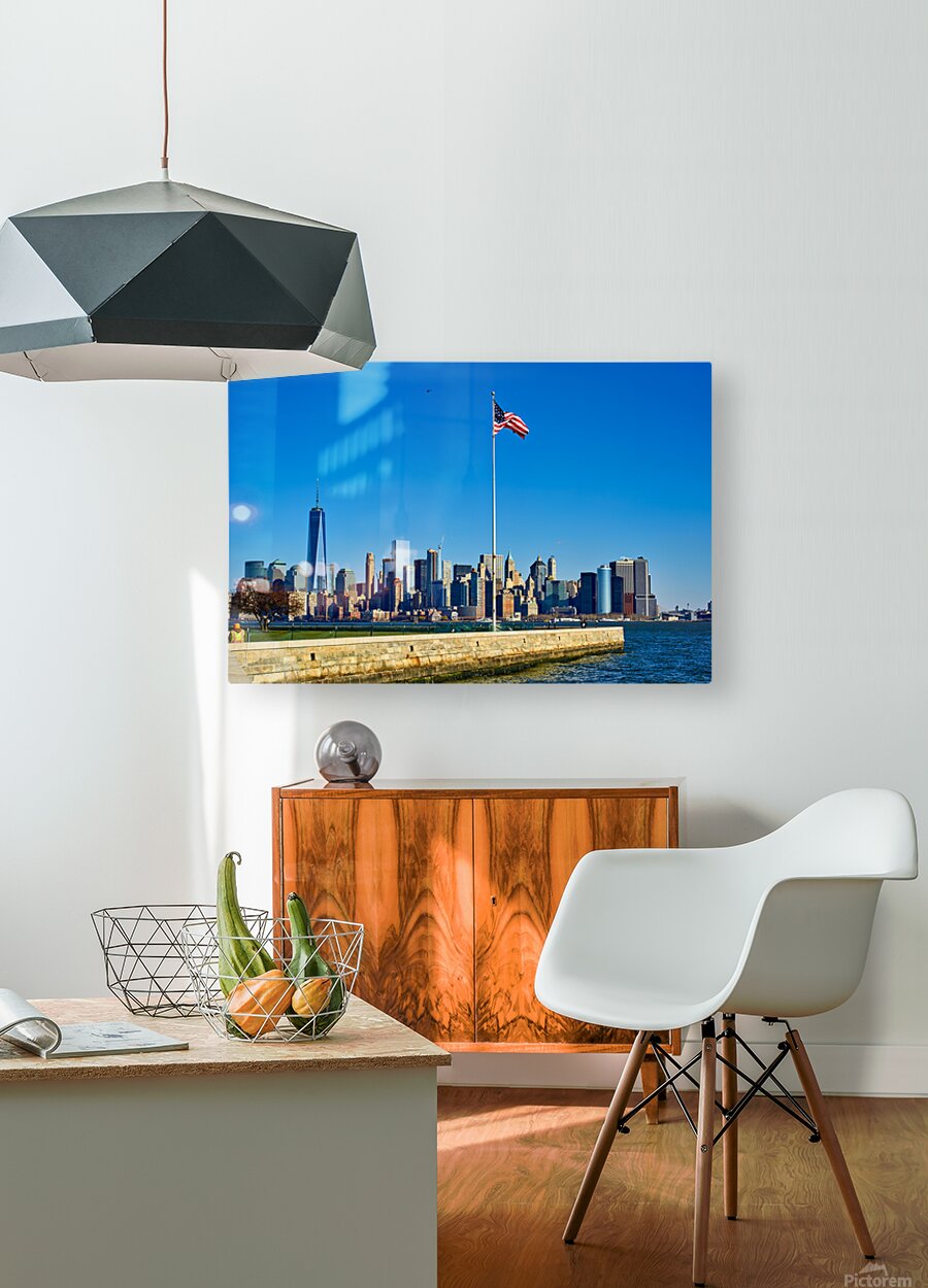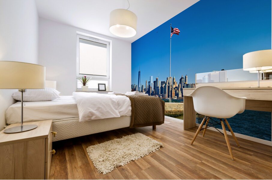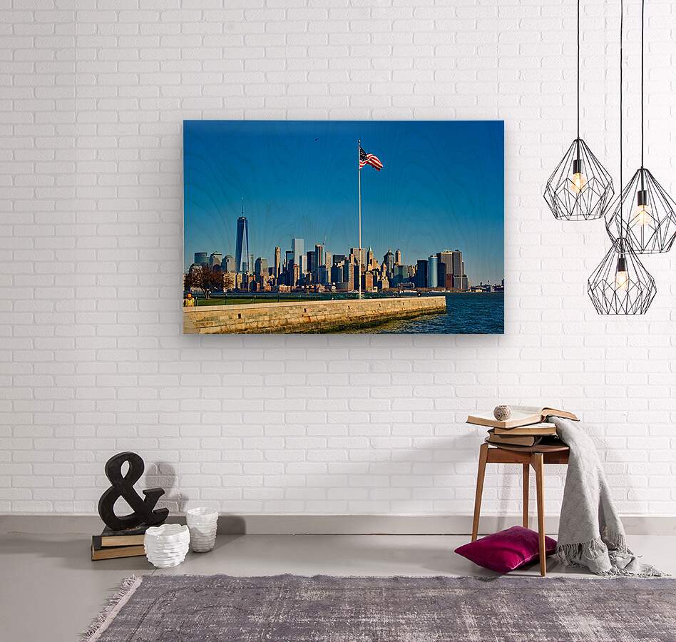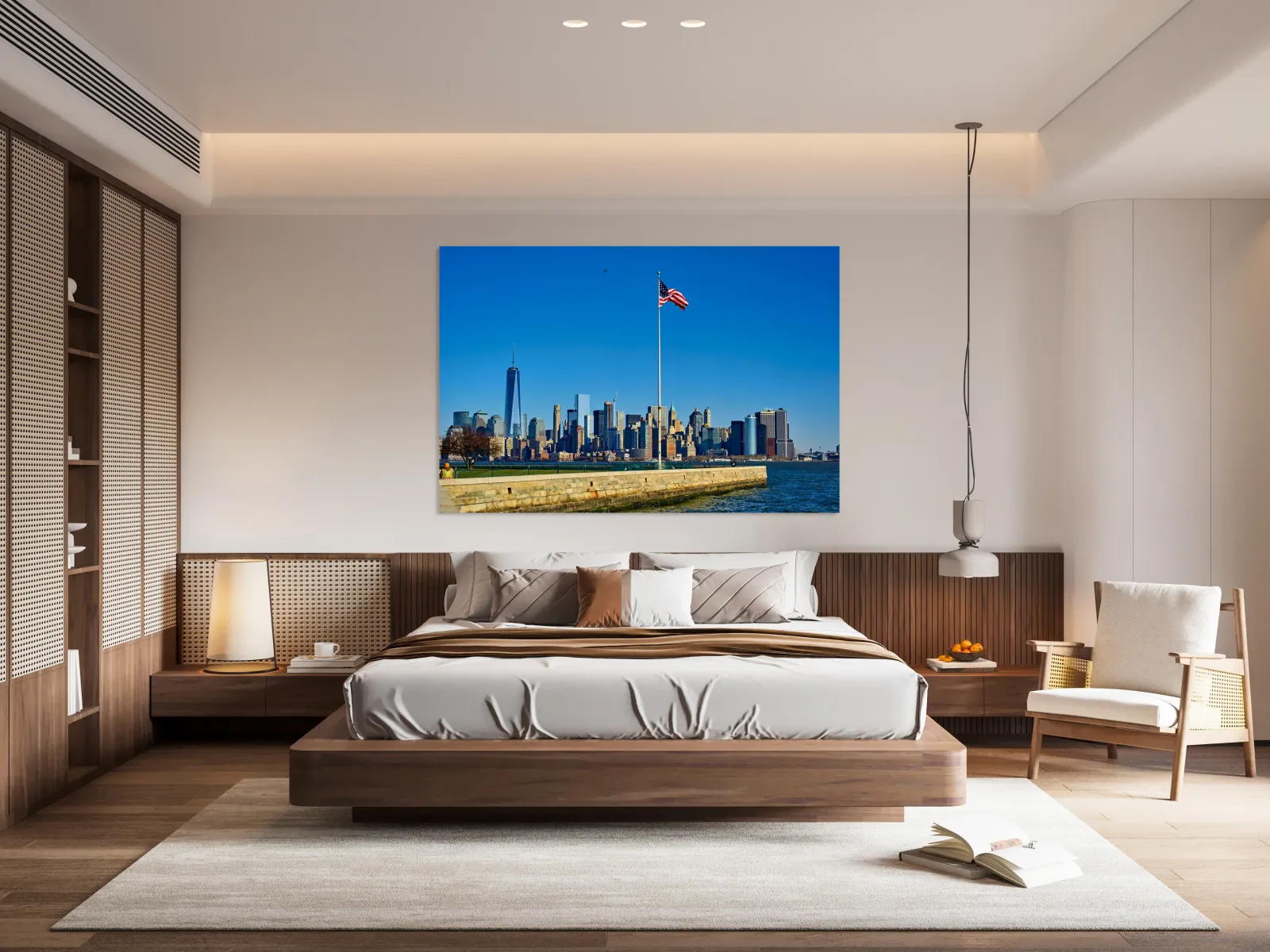 On Liberty Island the view shows the Manhattan skyline with the American flag waving. People walk along the waters edge enjoying the scene.