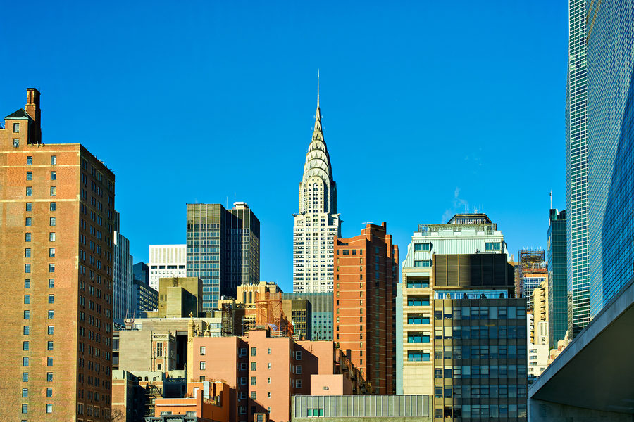 Chrysler Building is visible among various buildings in Manhattan. It is a clear blue sky day in New York City with sunlight shining.