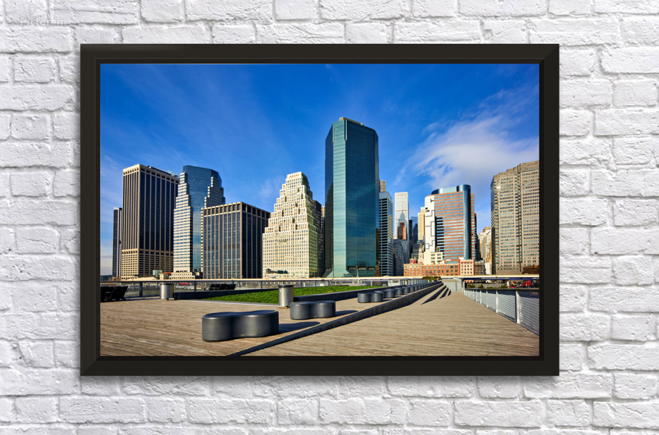 A view of skyscrapers in Manhattan with a wooden deck along the waterfront. The sky is bright with few clouds present.