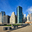 A view of skyscrapers in Manhattan with a wooden deck along the waterfront. The sky is bright with few clouds present.