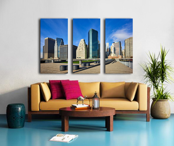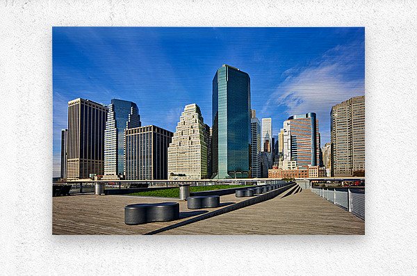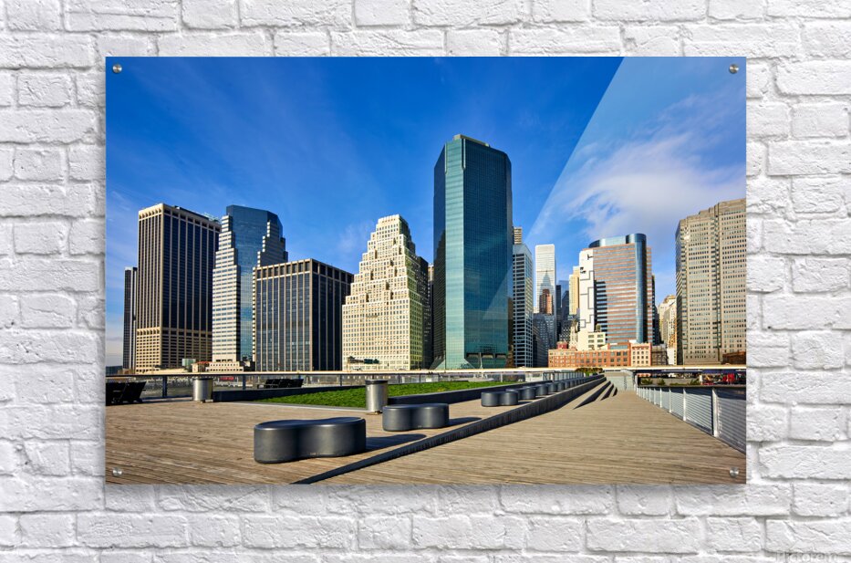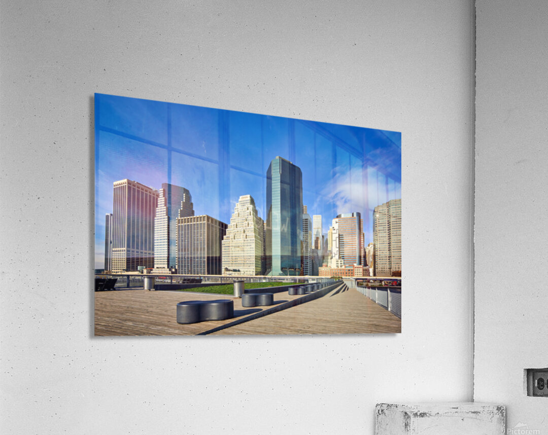 Get this artwork "Manhattan skyline view with skyscrapers and waterfront area" in a framed print.