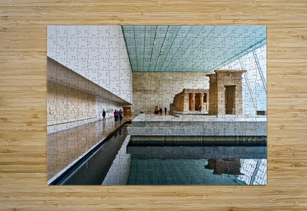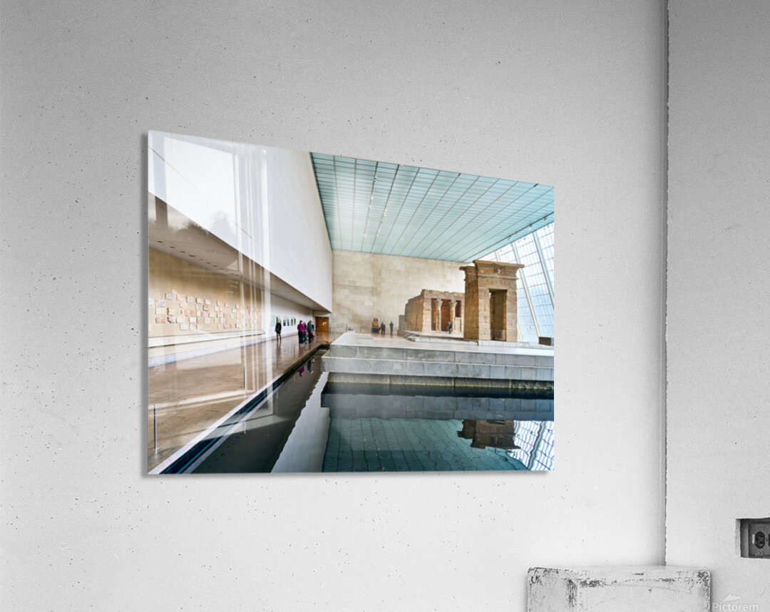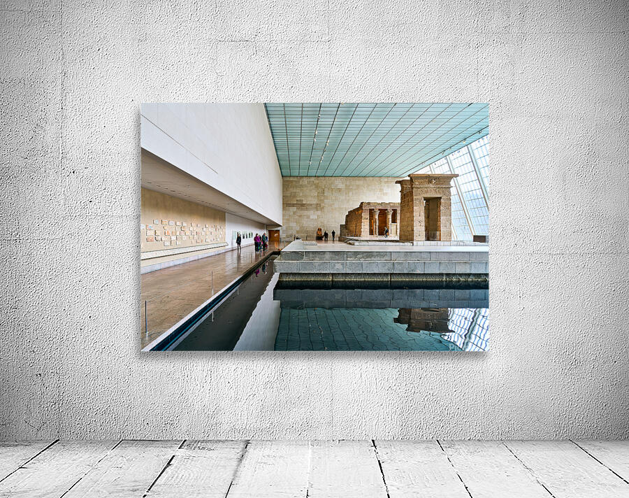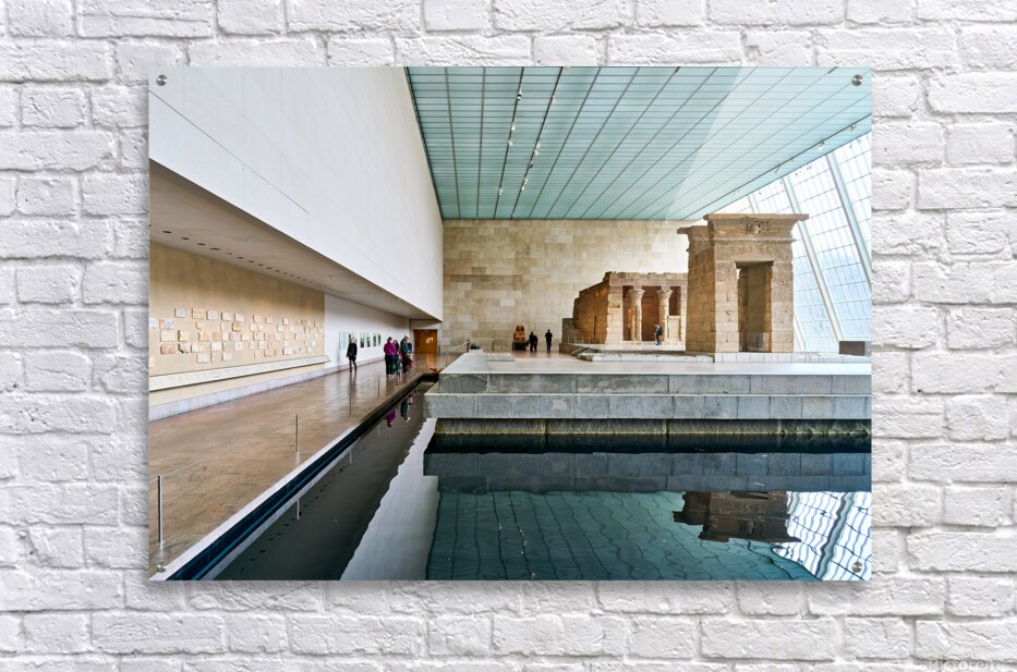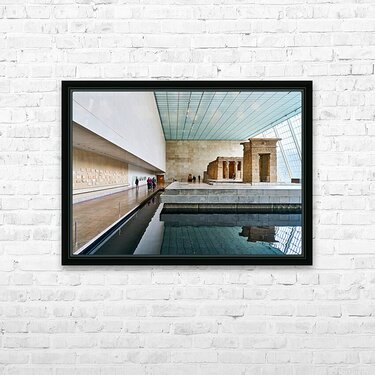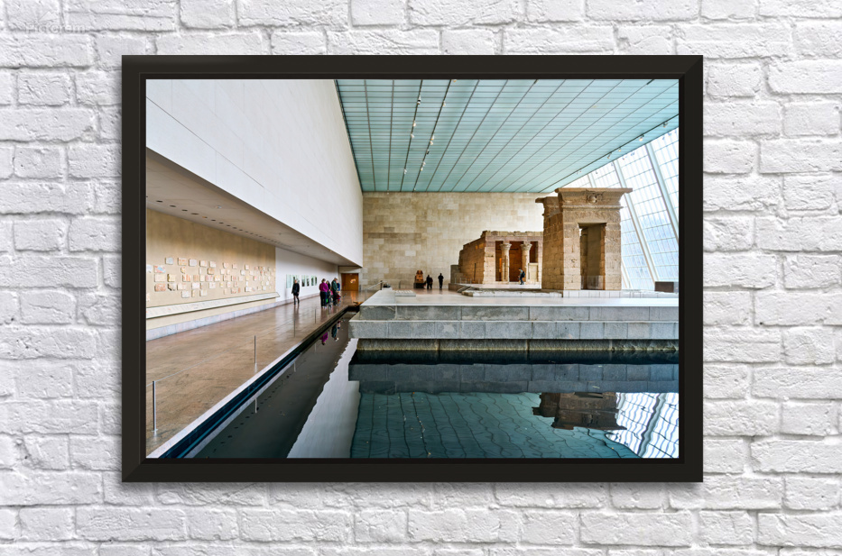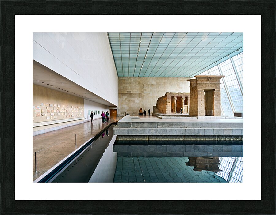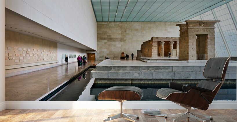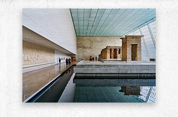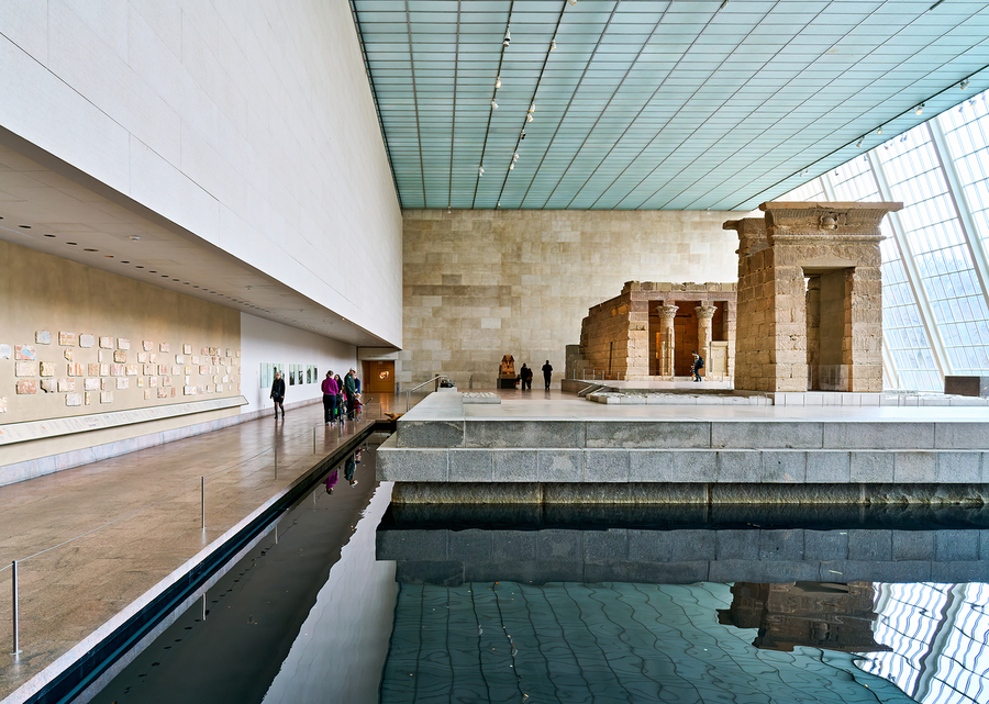 Visitors walk around the Temple of Dendur inside the Metropolitan Museum of Art in Manhattan New York. The structure sits near a reflecting pool.