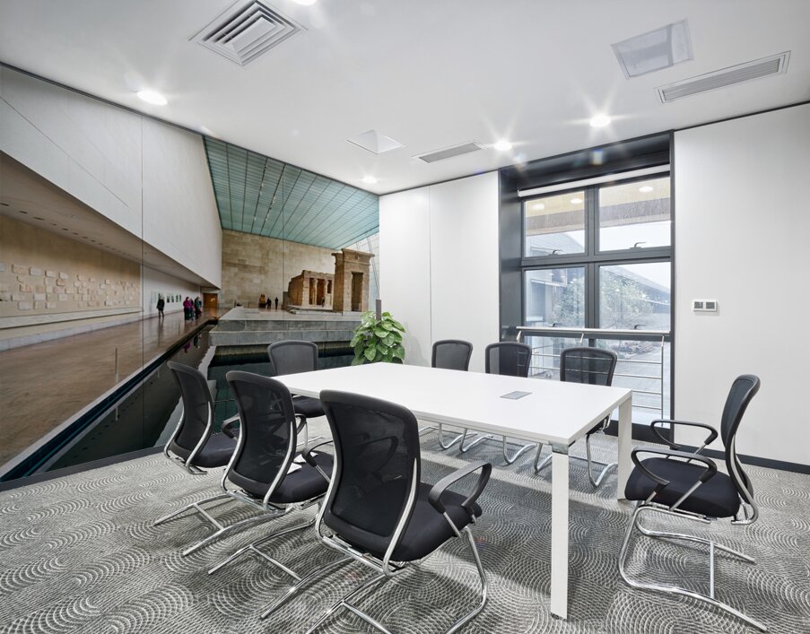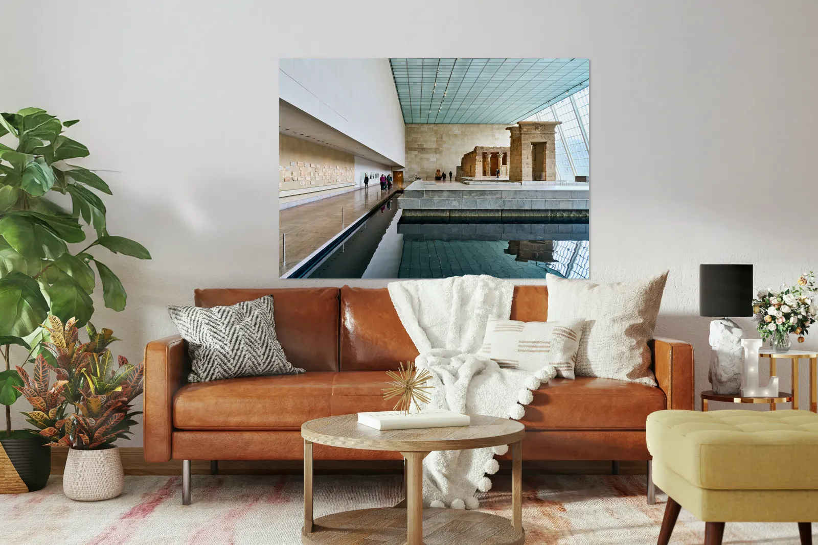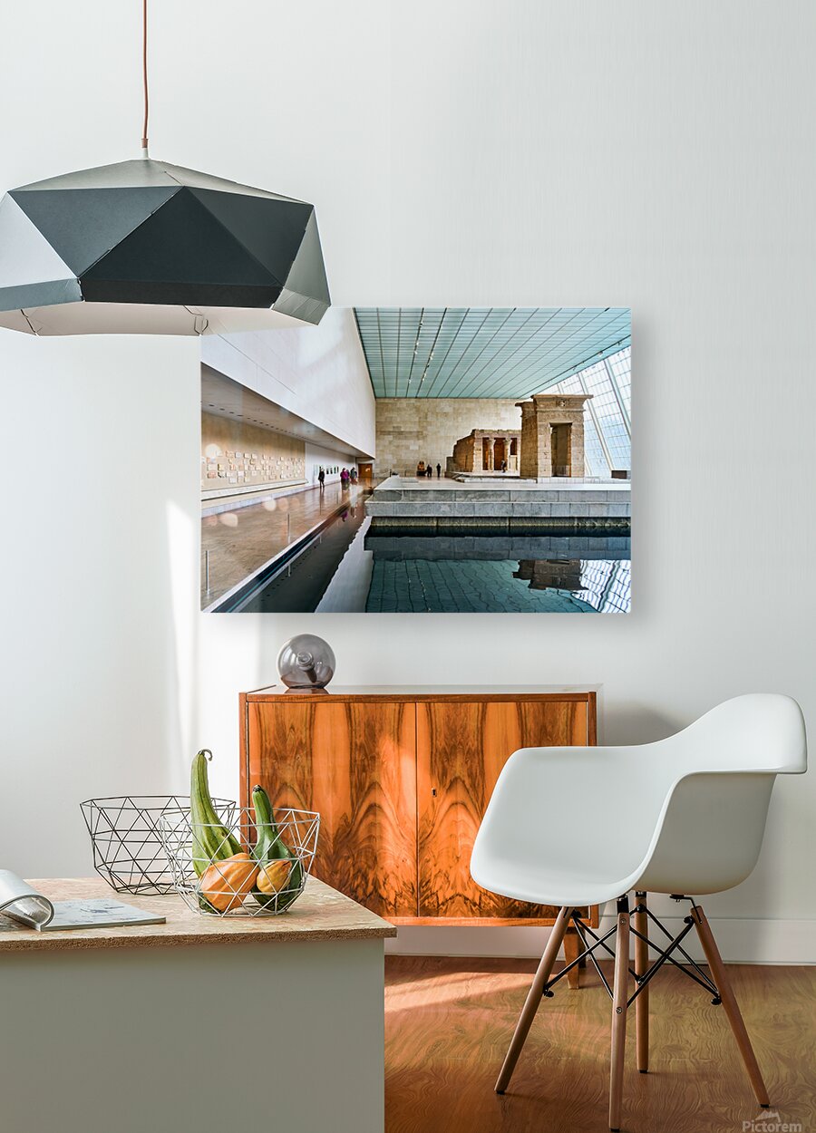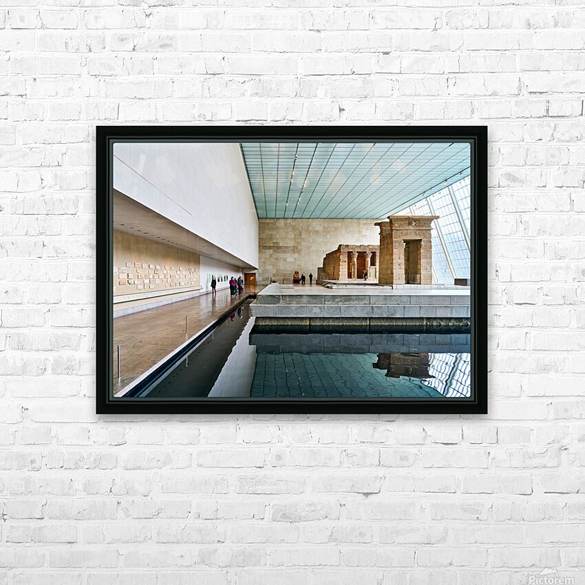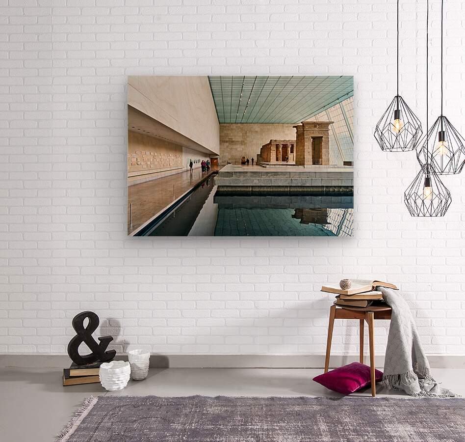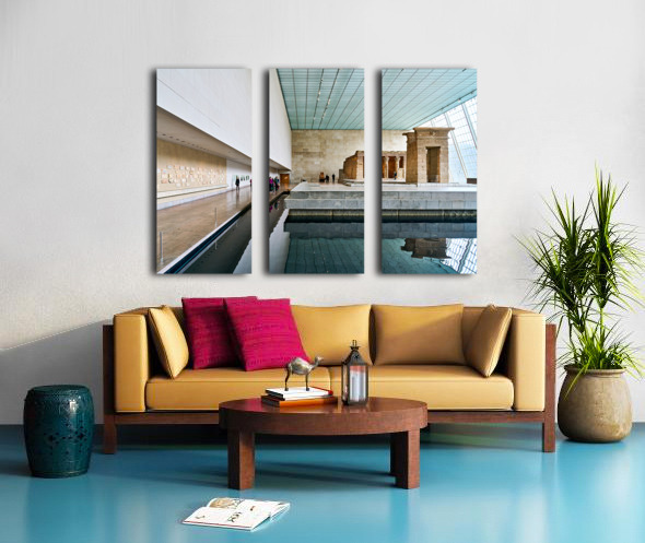 Visitors walk around the Temple of Dendur inside the Metropolitan Museum of Art in Manhattan New York. The structure sits near a reflecting pool.