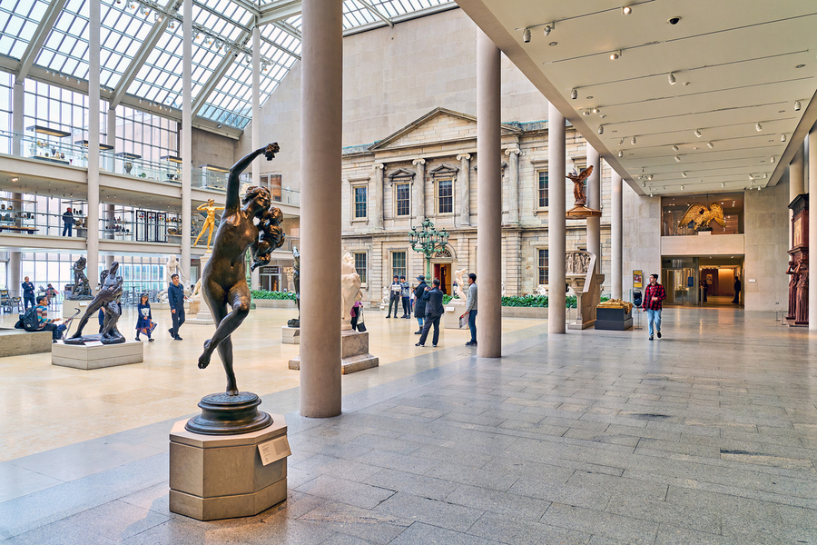 People walk through Engelhard Court admiring sculptures and artworks at the Metropolitan Museum of Art in Manhattan.