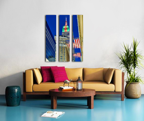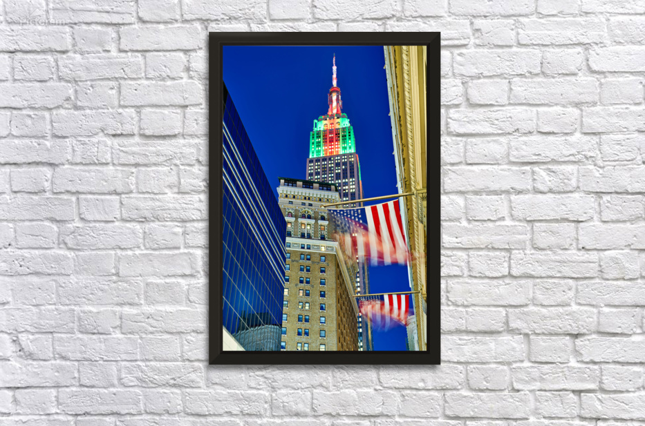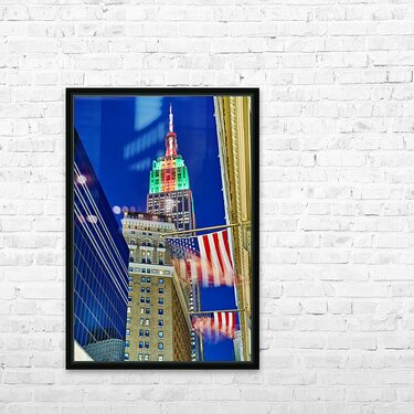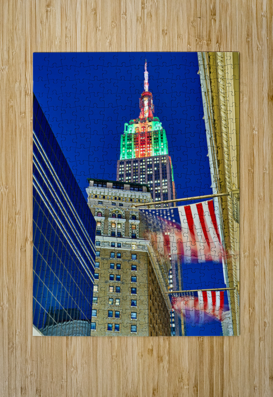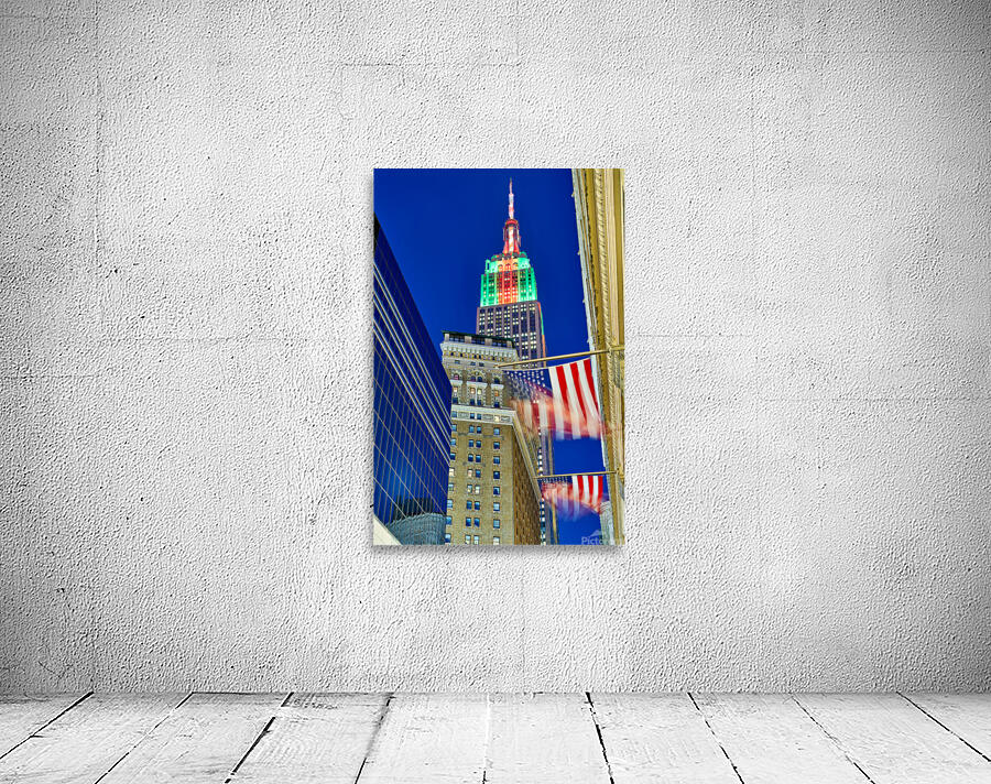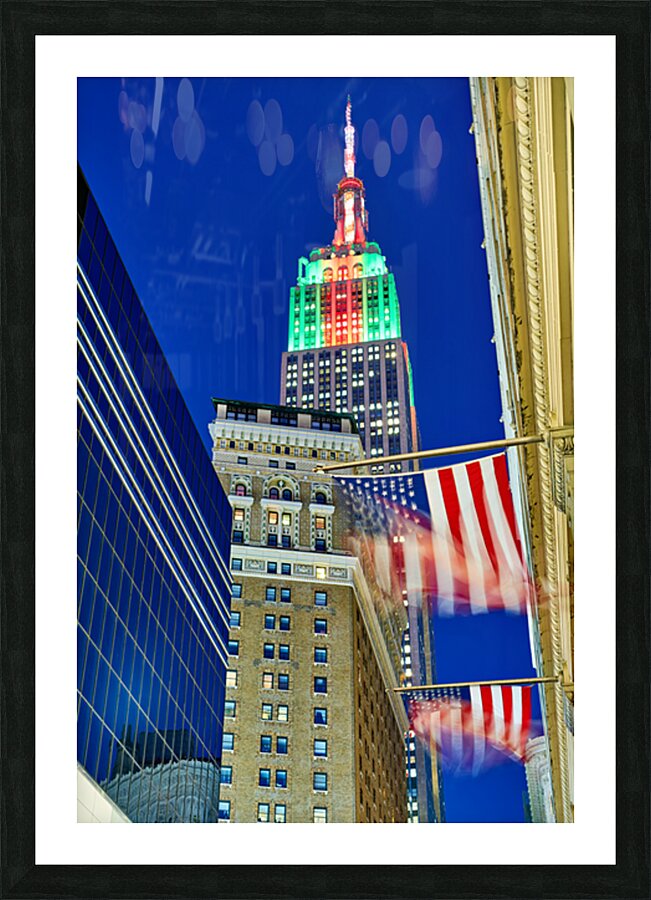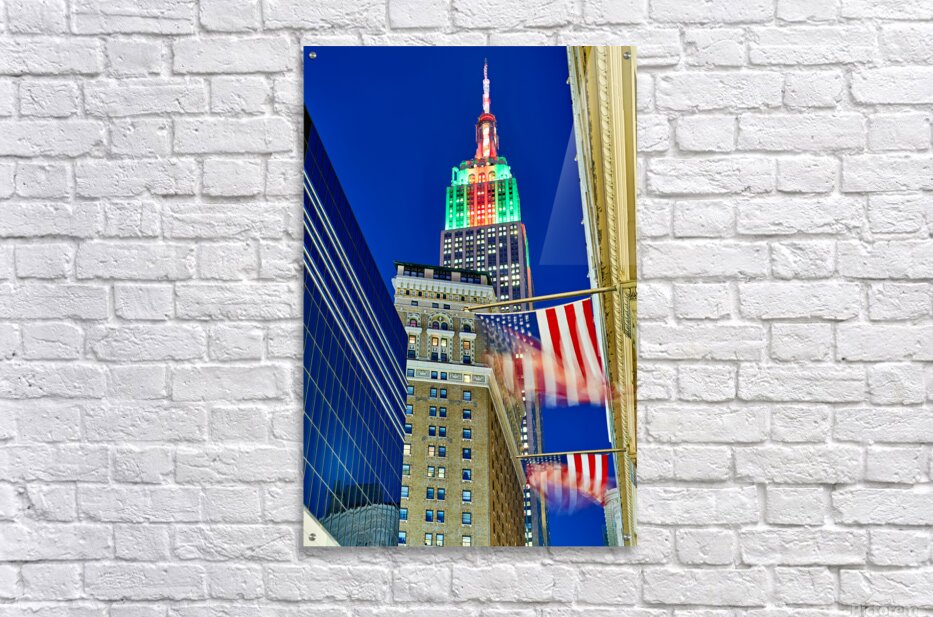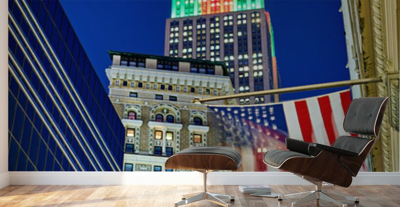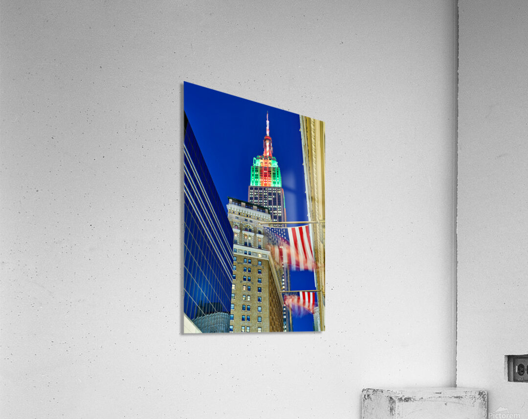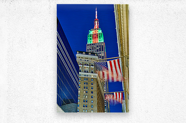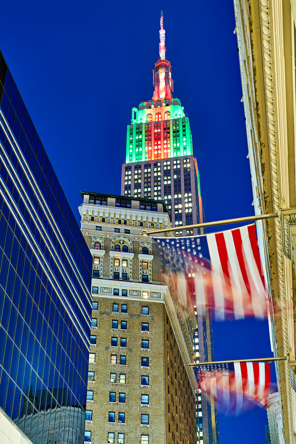 The Empire State Building stands tall in New York City as it is lit up in colors at dusk. Flags wave below against the evening sky.