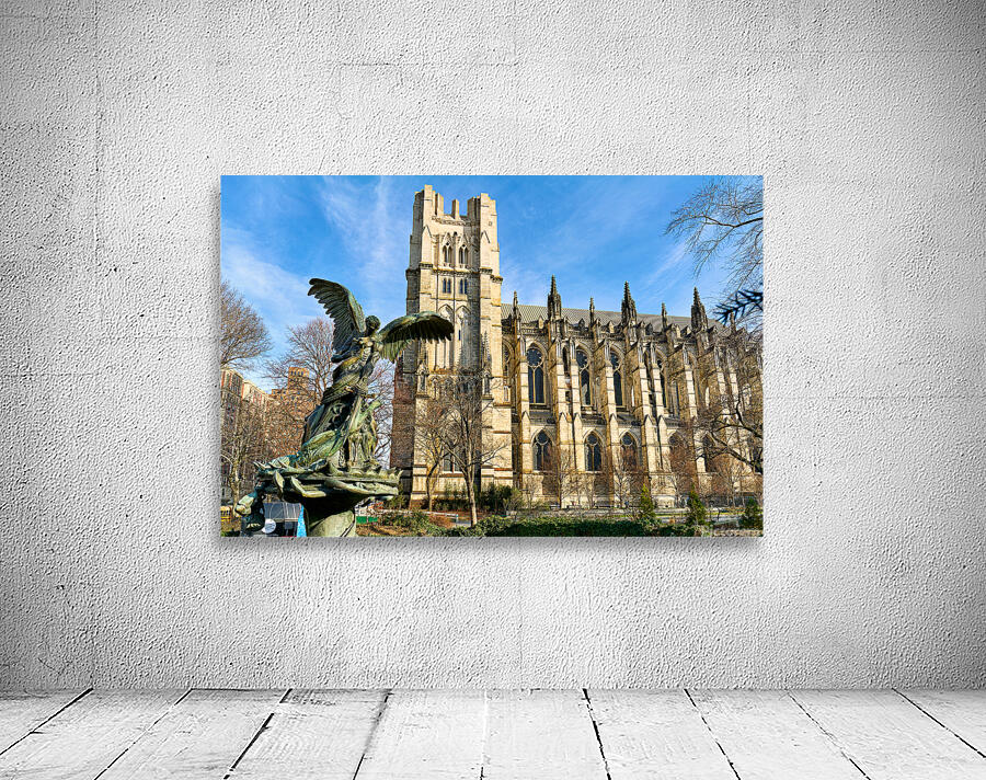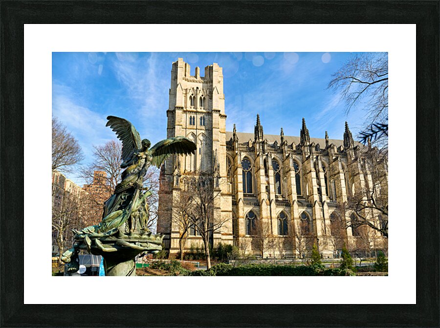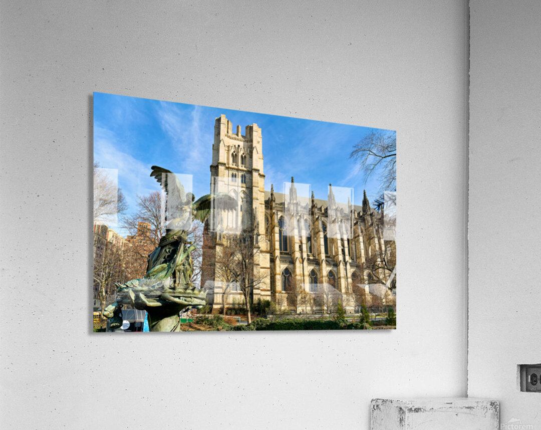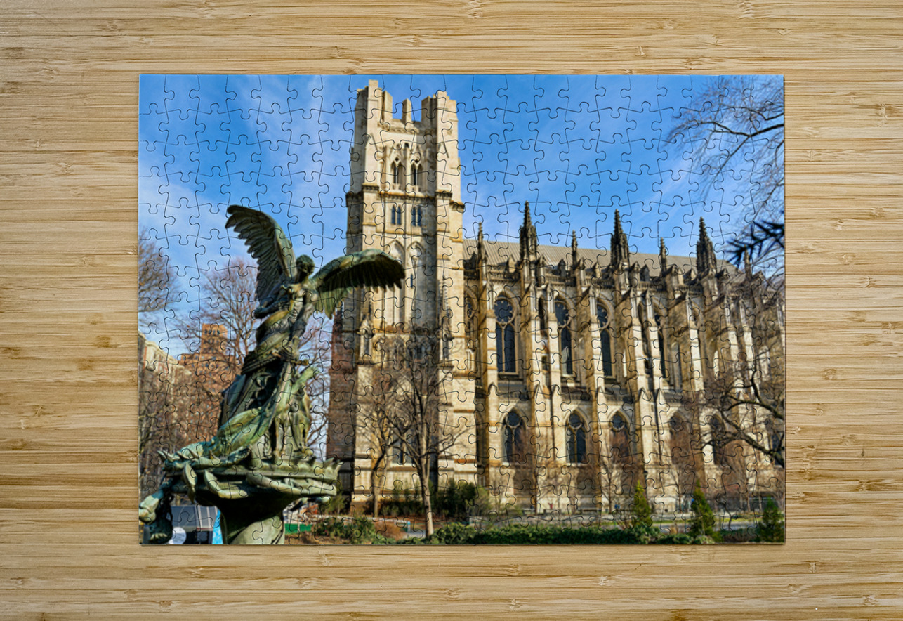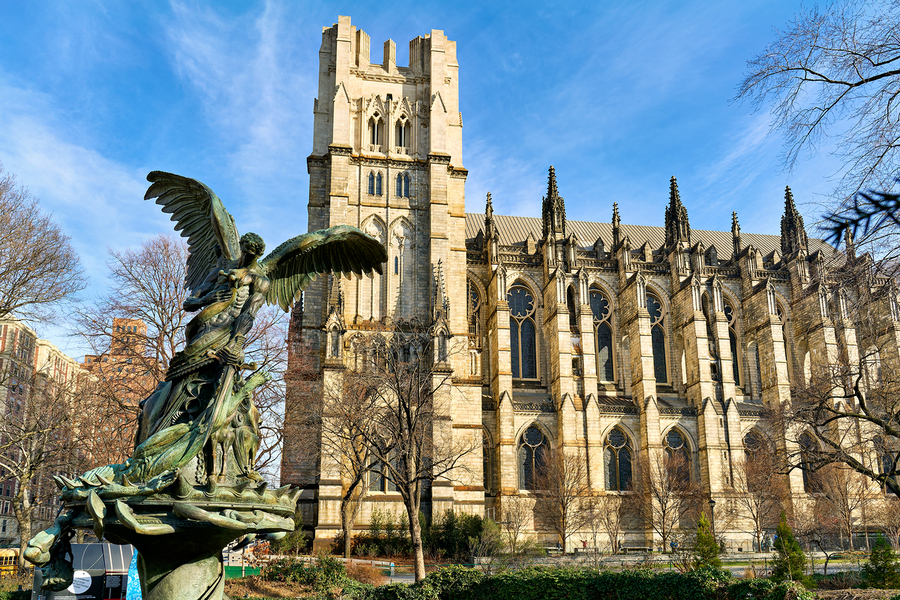 A group walks around the Cathedral of St. John the Divine in Manhattan. The sky is clear and sunlight shines on the building.