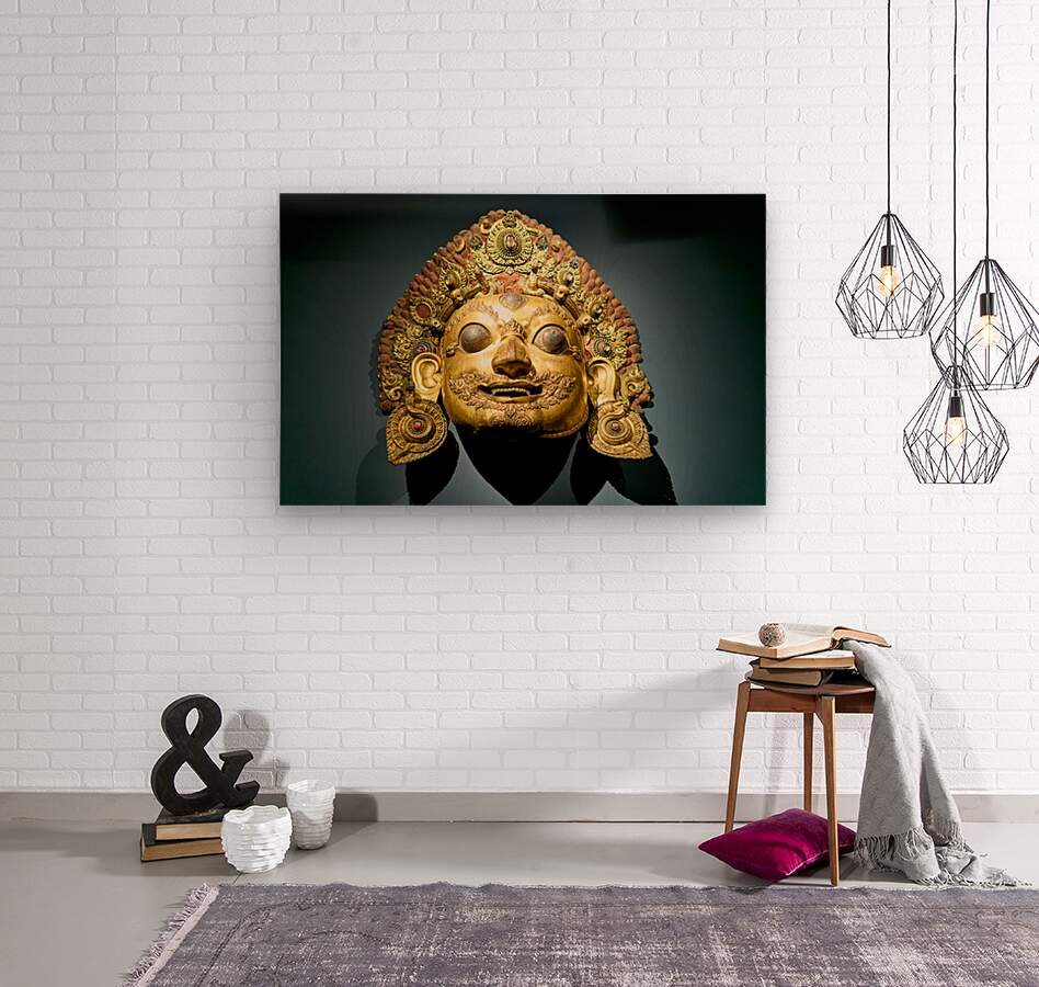 "Golden face mask displayed at the Asian Art Gallery in Manhattan" in a framed print.