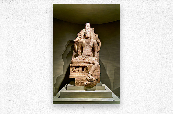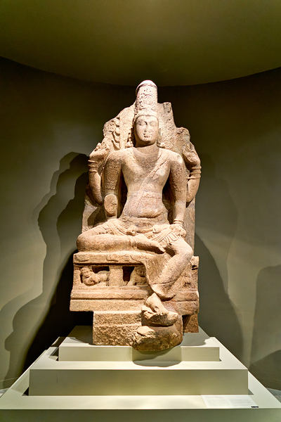 A statue of a seated figure is displayed in the Asian Art Gallery in Manhattan. Visitors view the artwork in a well-lit setting.