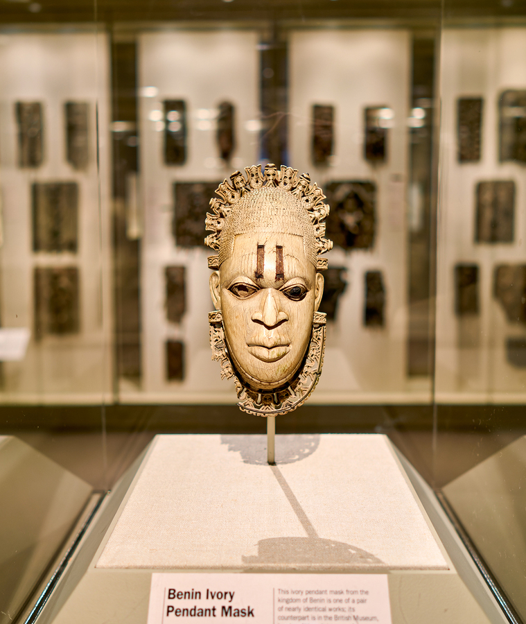 The Benin ivory pendant mask on display in the Metropolitan Museum of Art in Manhattan showcases art from historical Africa in a modern space.