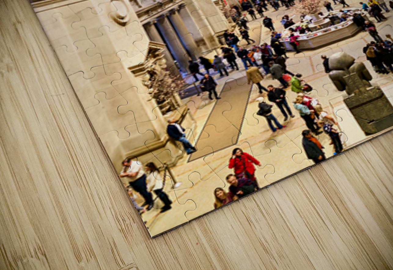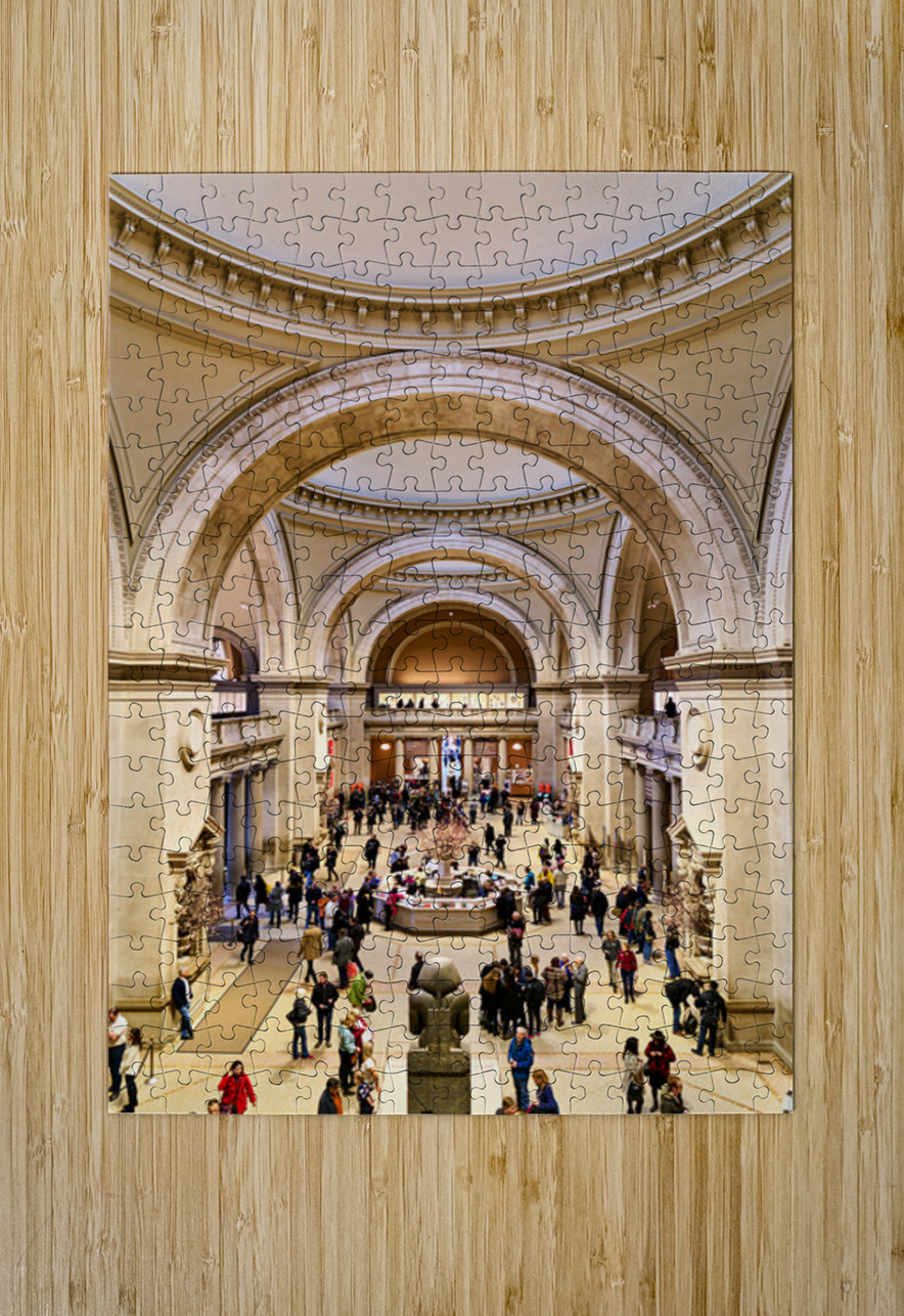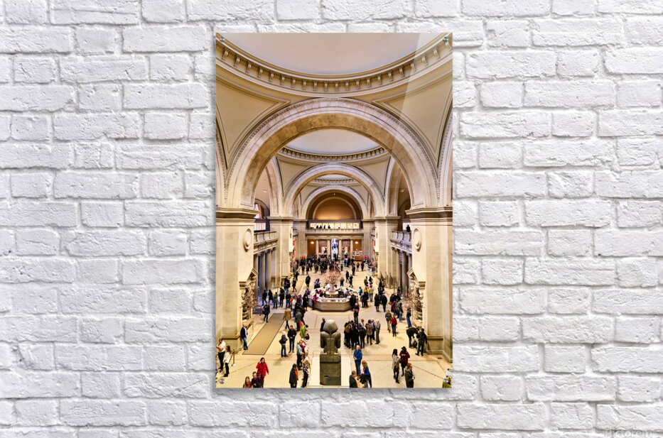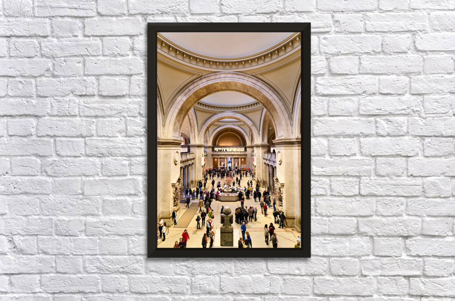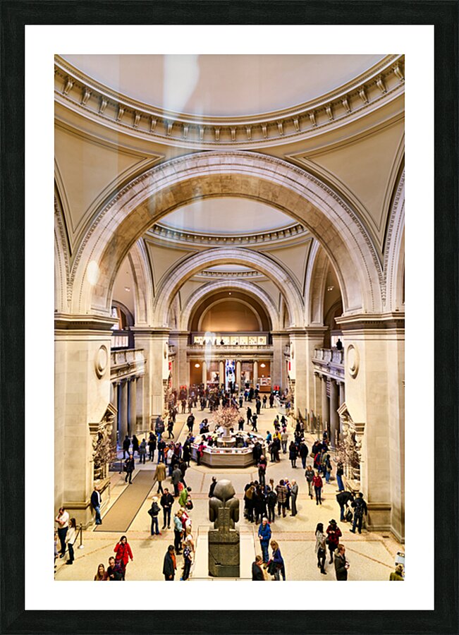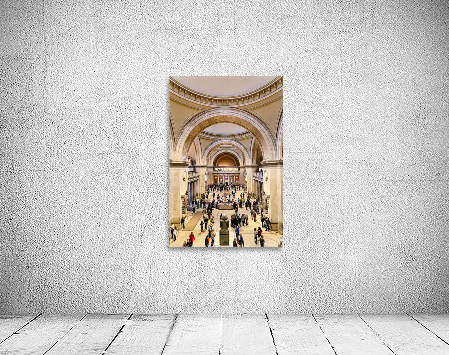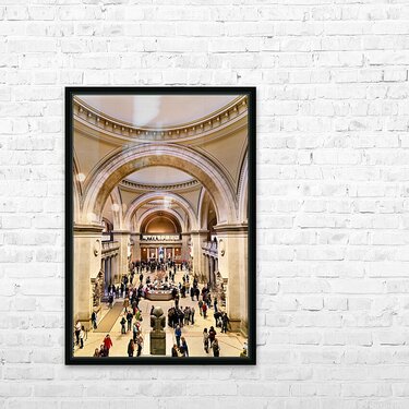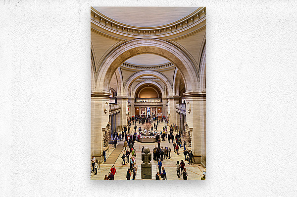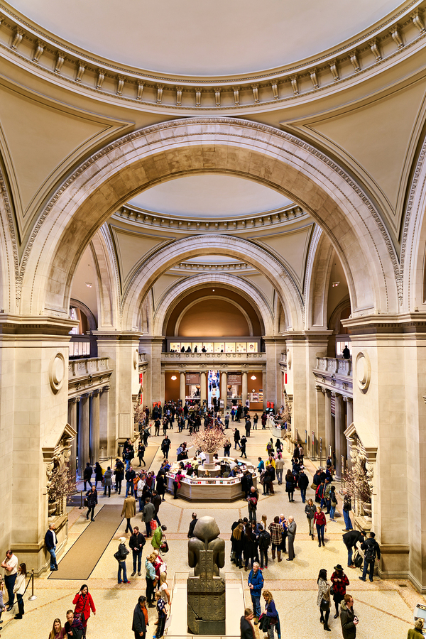 People walk through the main entrance of the Metropolitan Museum of Art in New York City engaged in various activities and conversations.