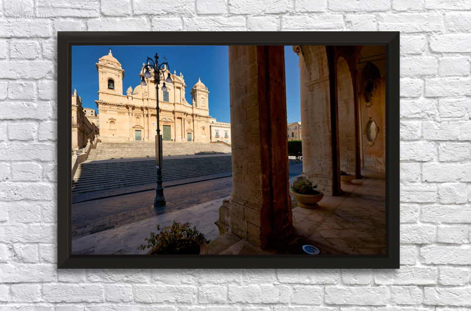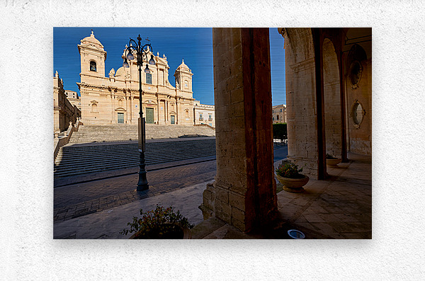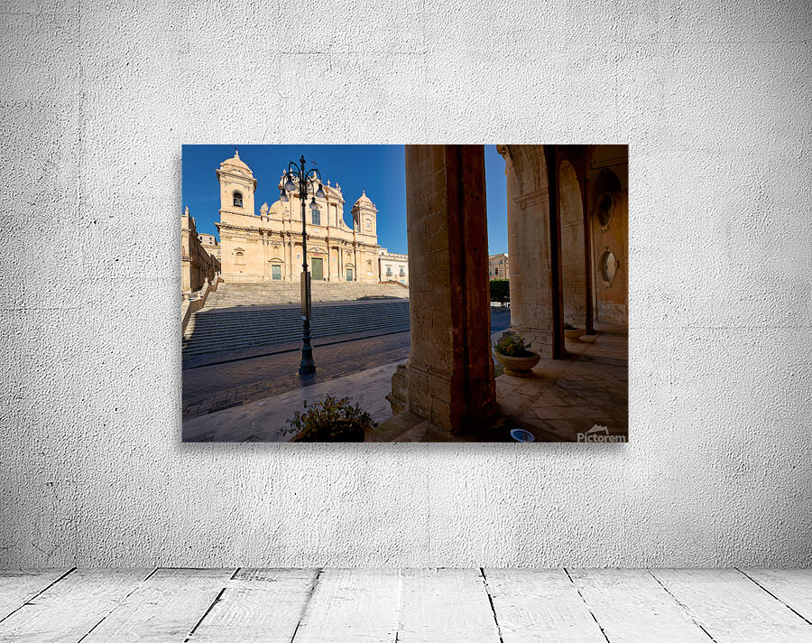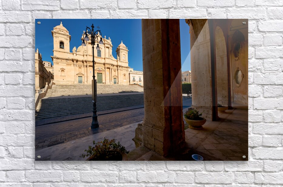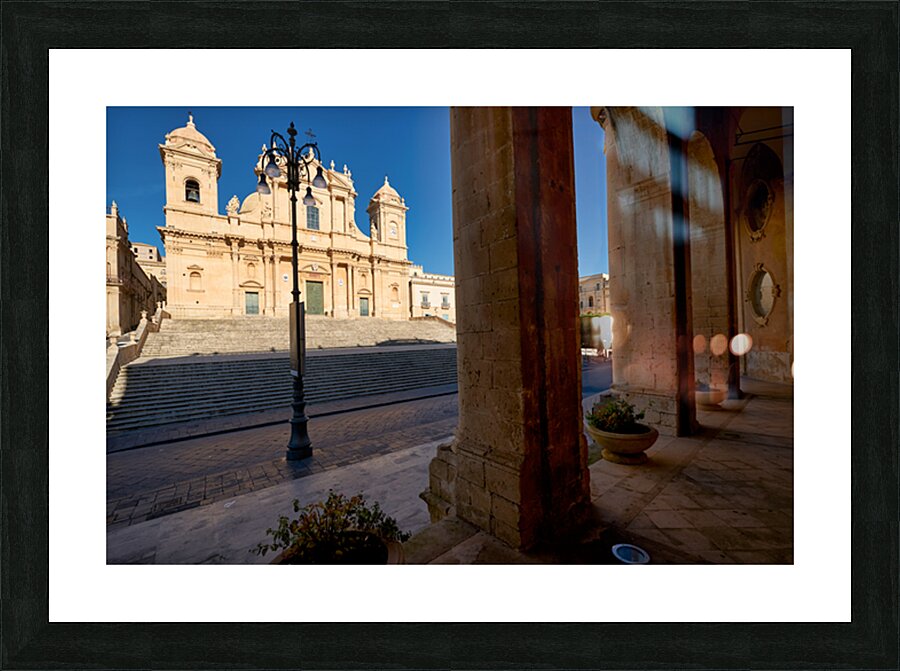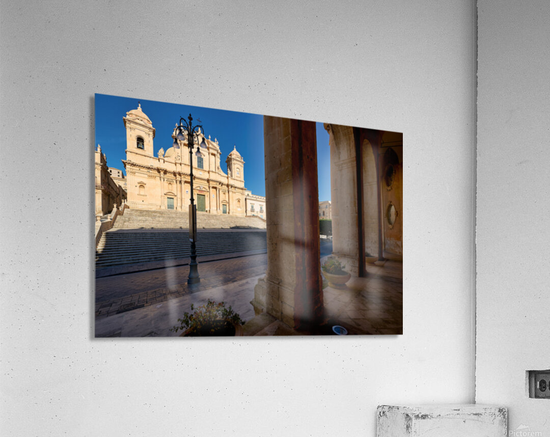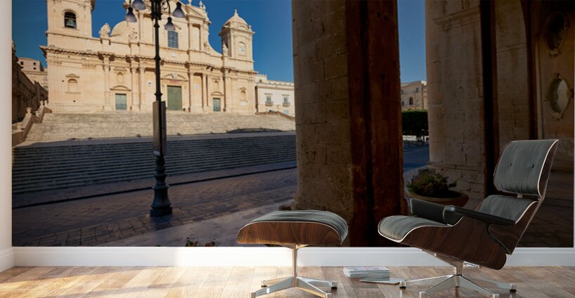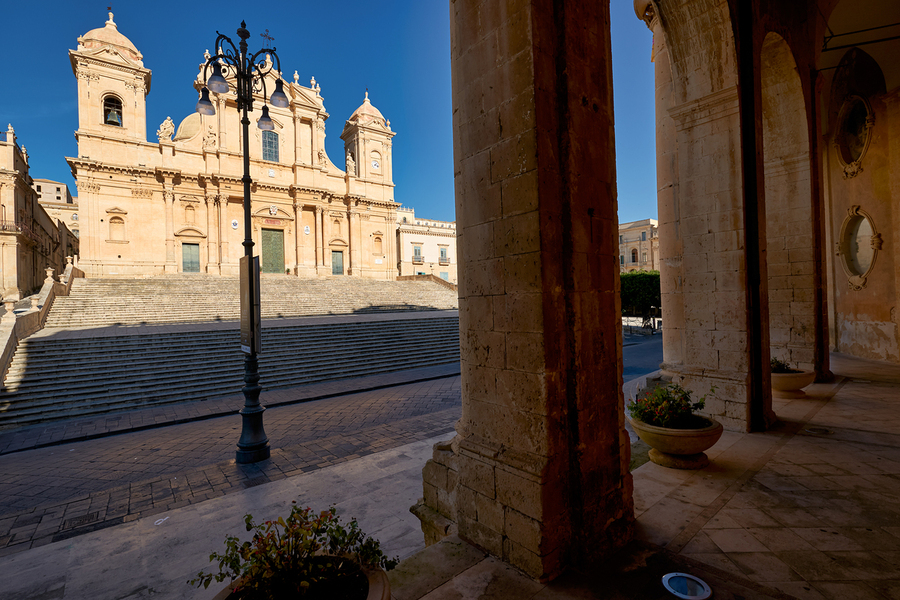 Visitors walk by Noto Cathedral in Sicily Italy. The sun shines brightly on the steps leading to the entrance.