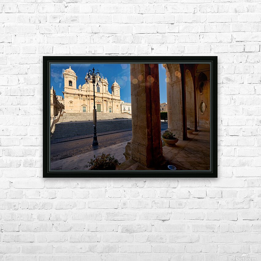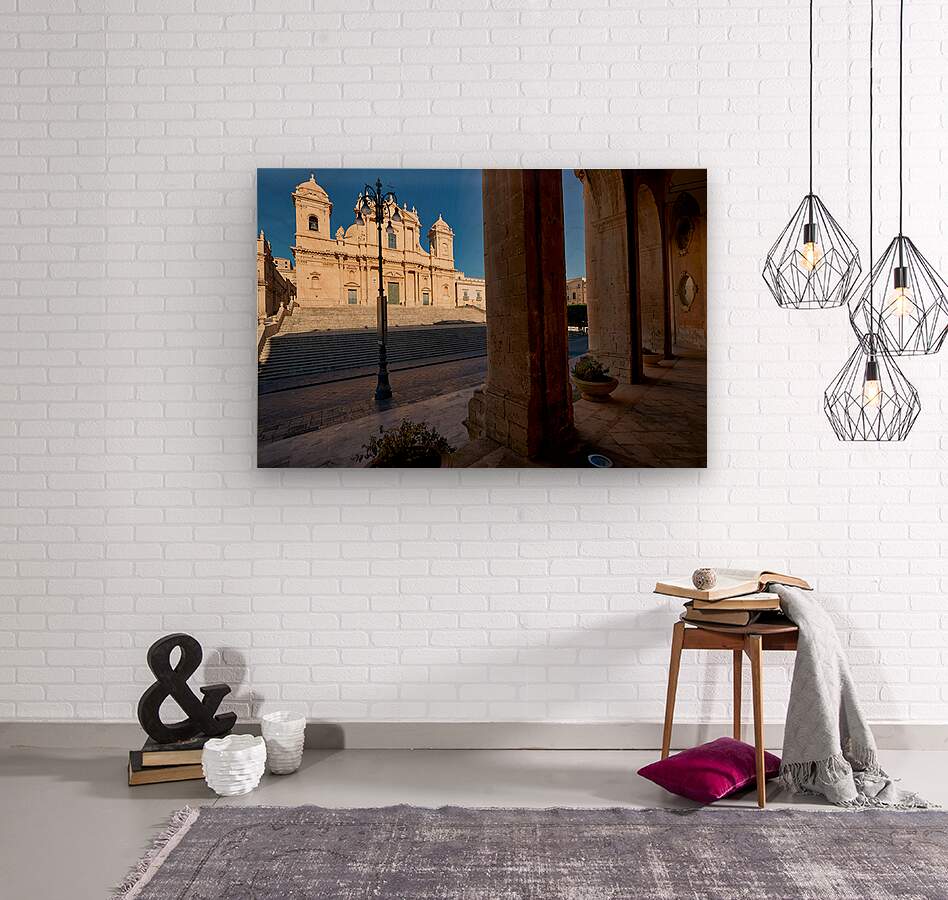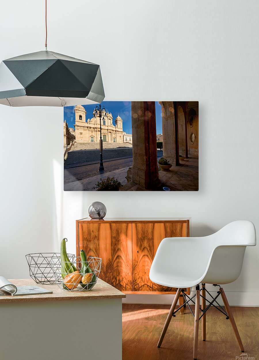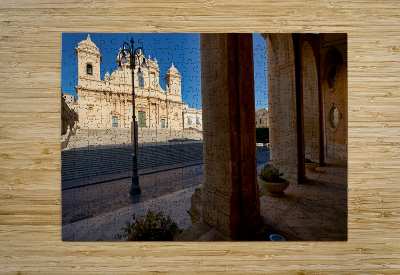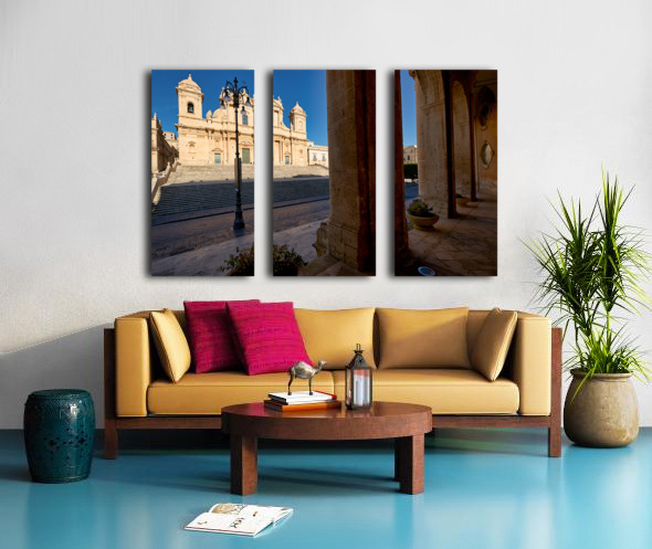 Visitors walk by Noto Cathedral in Sicily Italy. The sun shines brightly on the steps leading to the entrance.