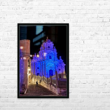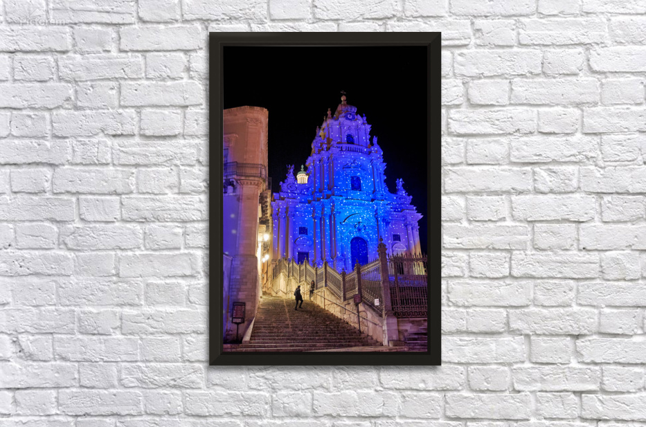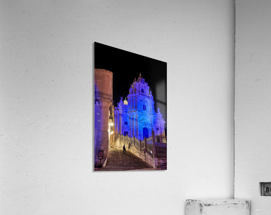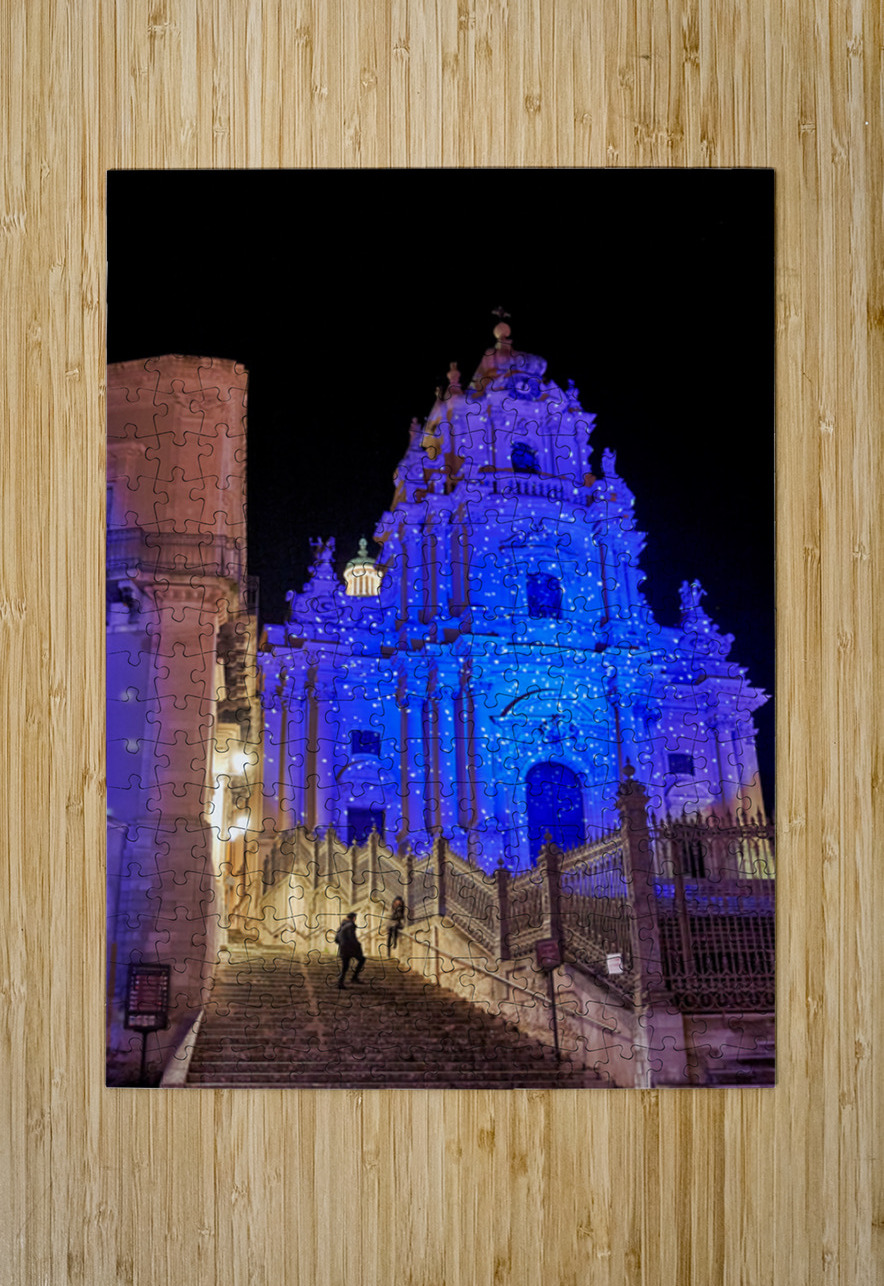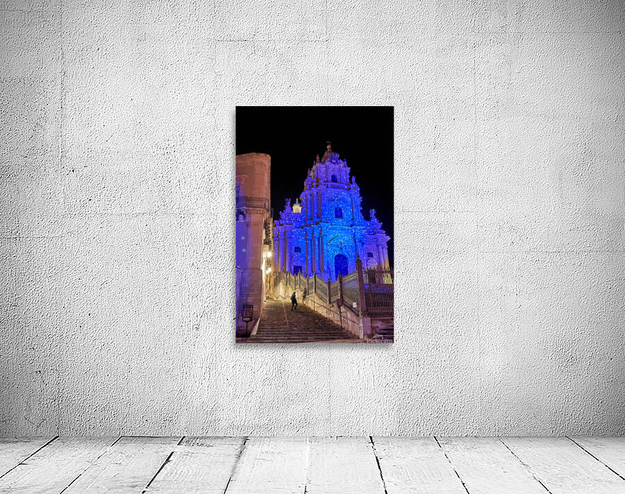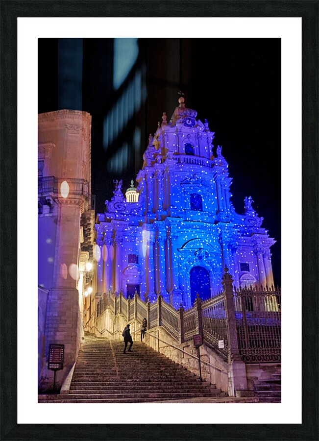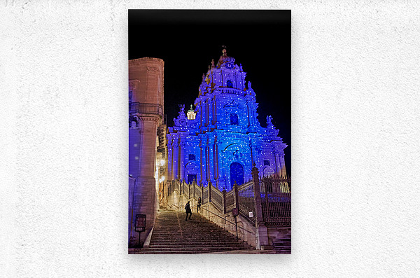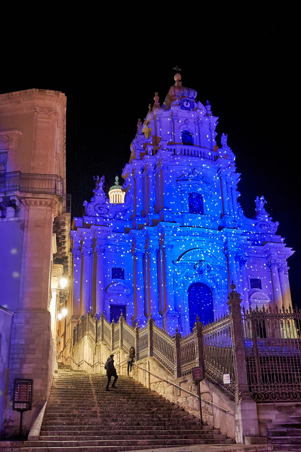 People walk up the stairs toward the Duomo of San Giorgio brightly lit at night in Modica. The cathedral shines with blue lights.
